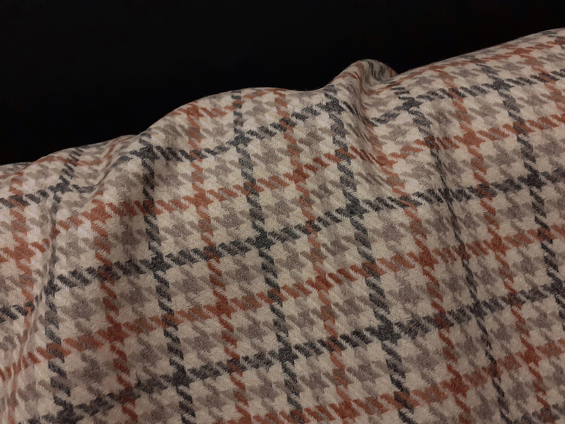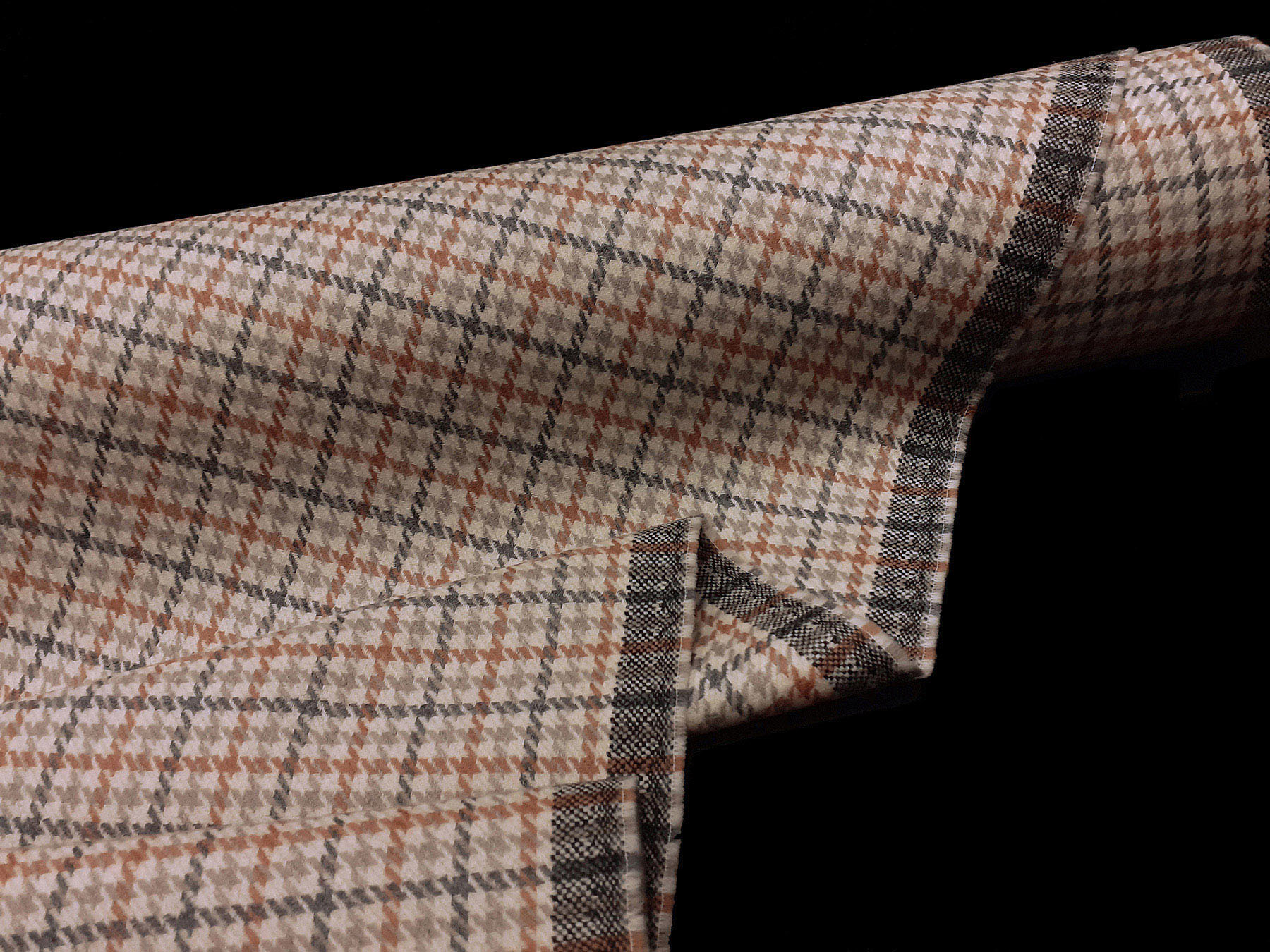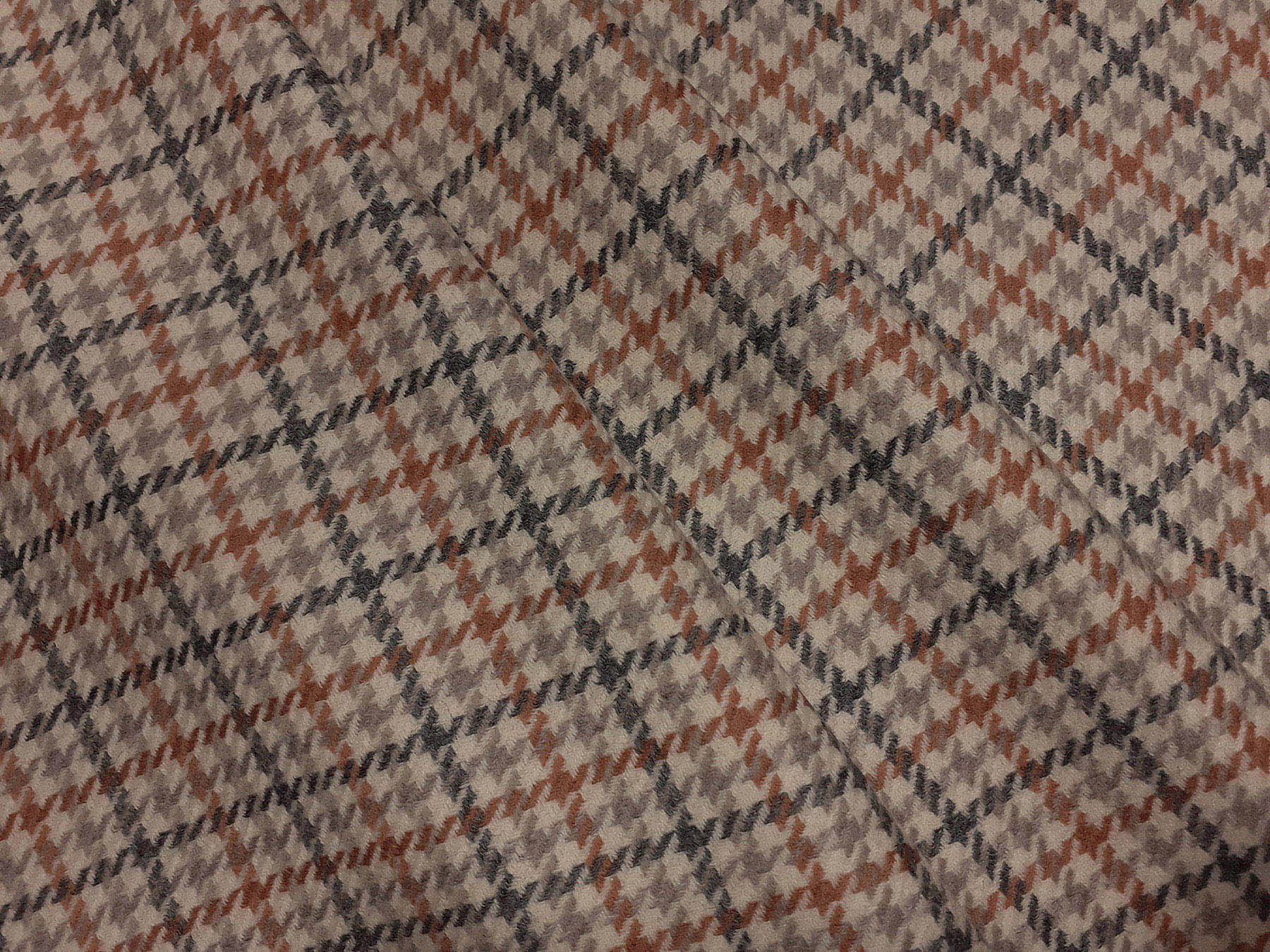 Tessuto in lana merino pettinata pied de poule e riquadri su fondo avorio.