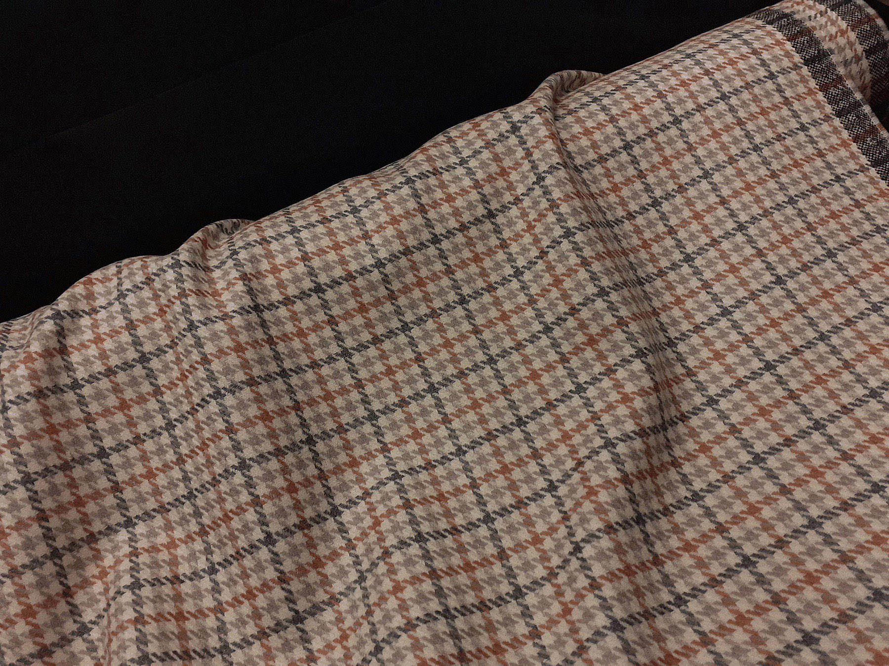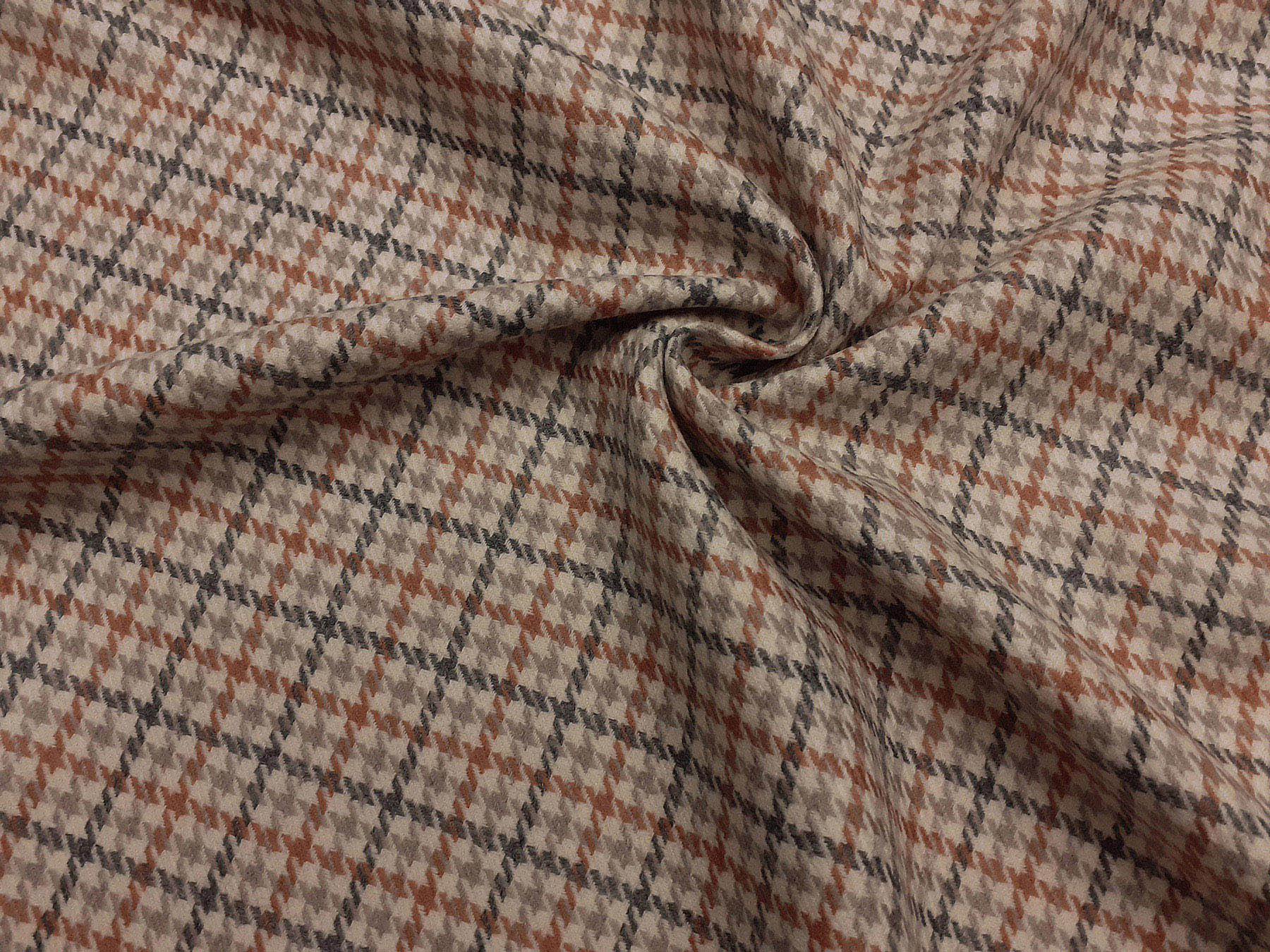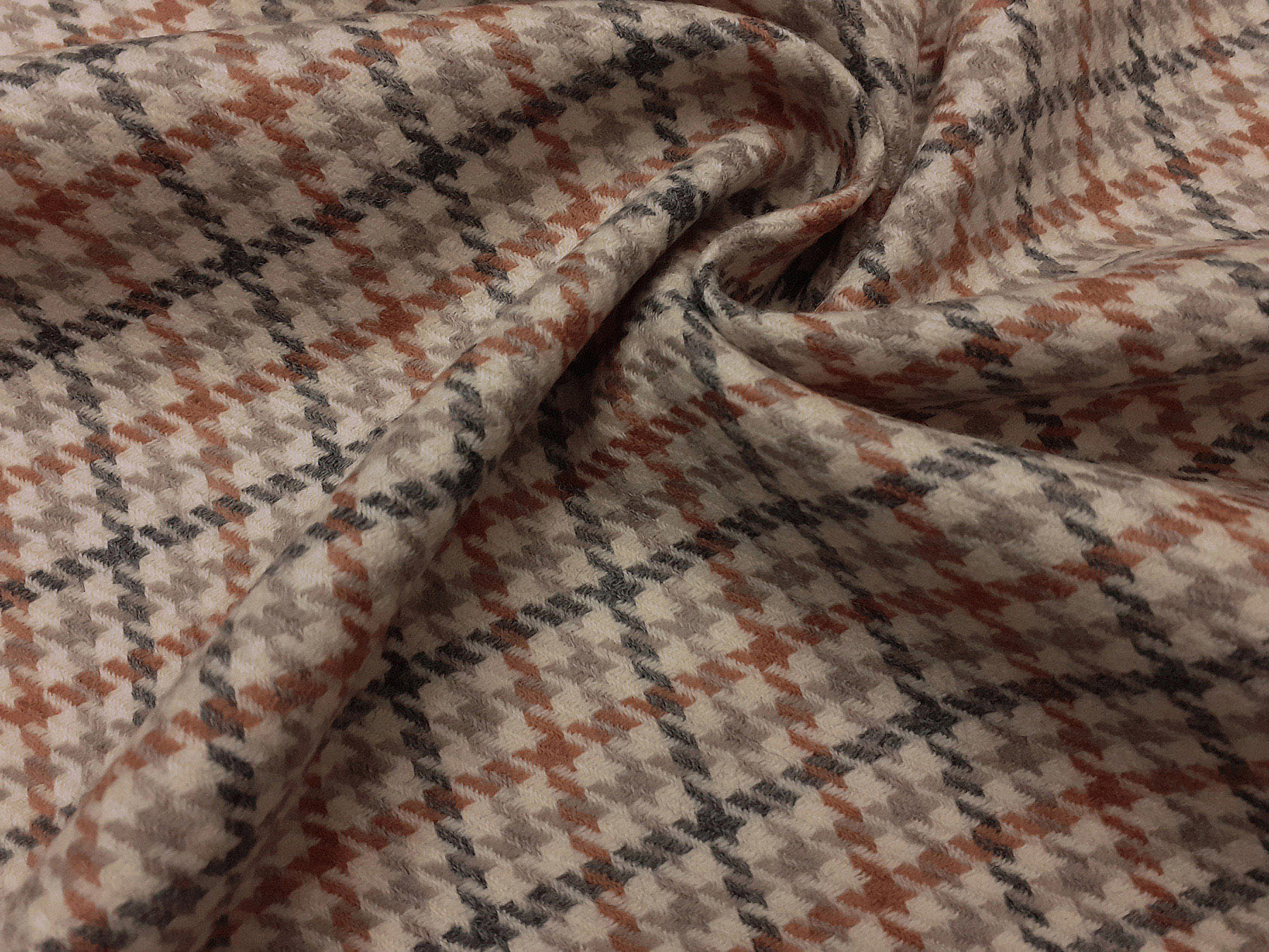 Tessuto in lana merino pettinata pied de poule e riquadri su fondo avorio.