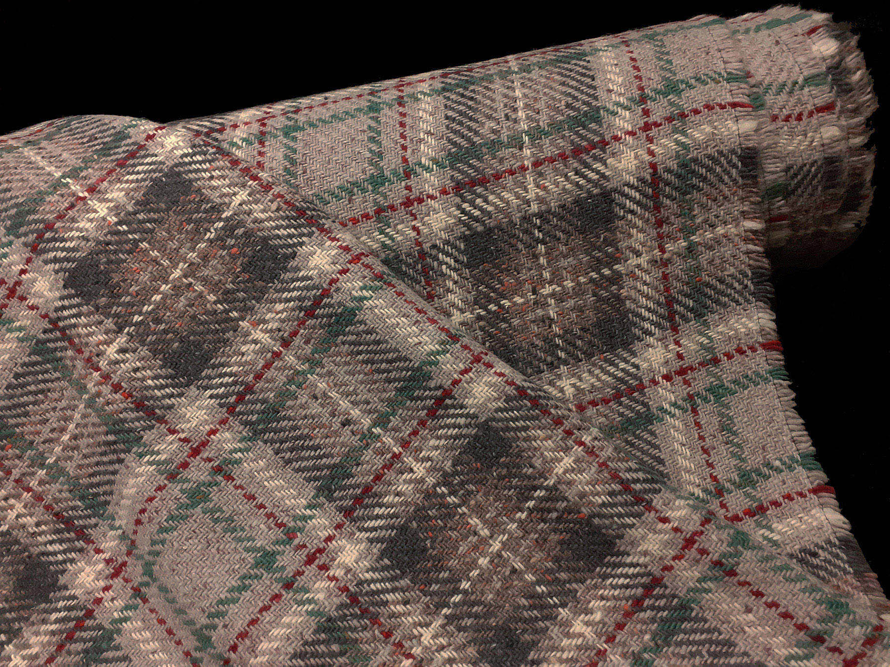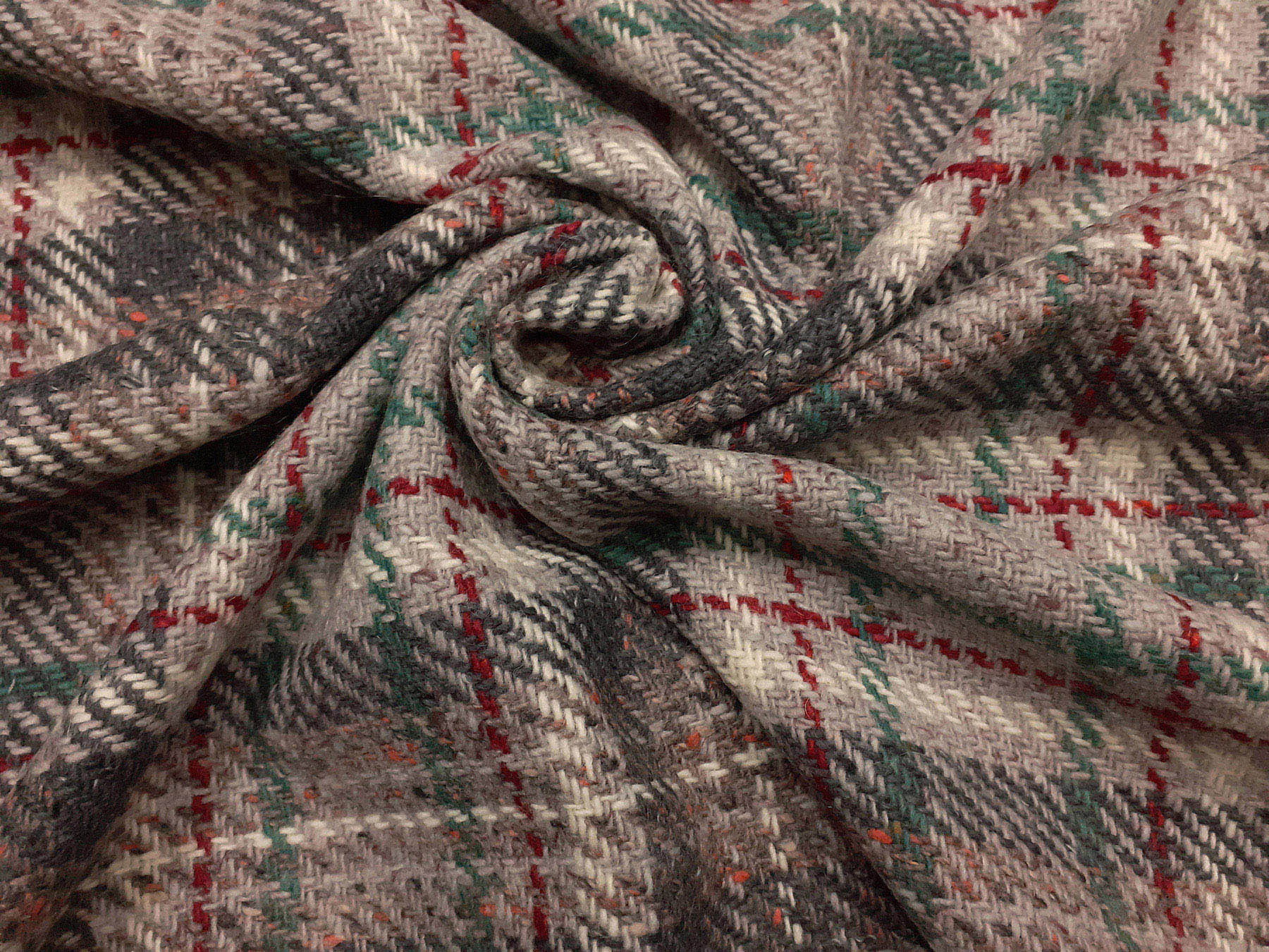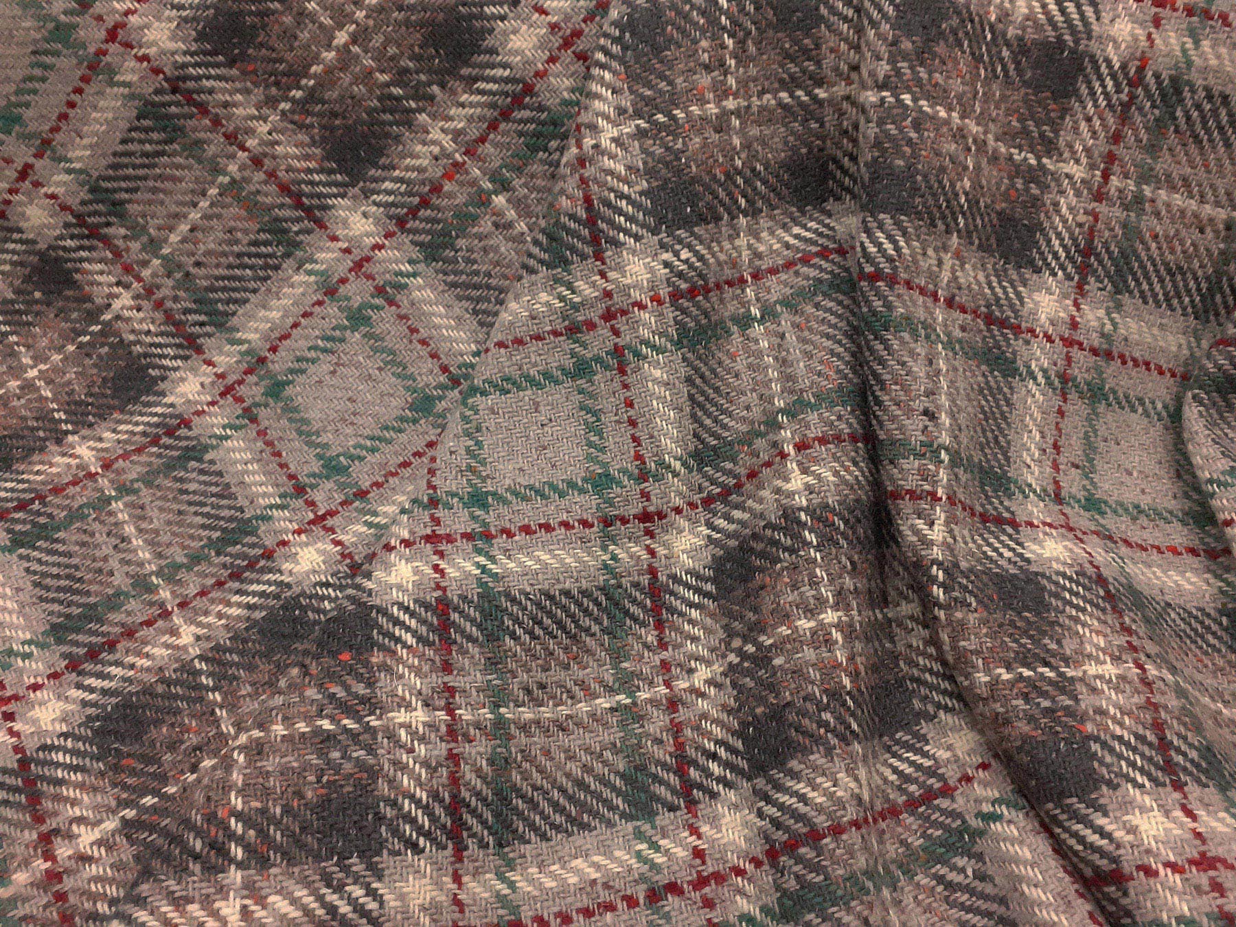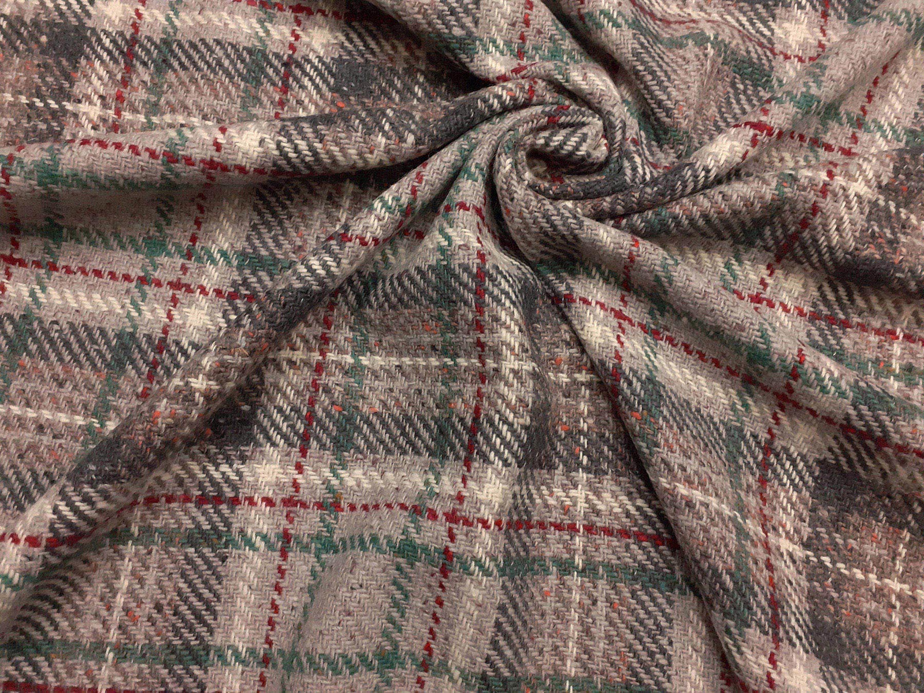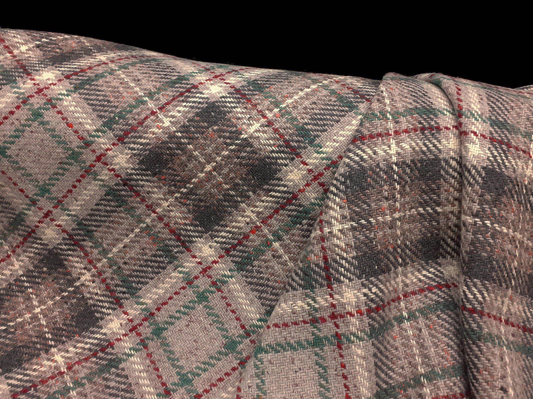 Tessuto in lana scozzese fondo grigio perla con riquadro rosso e verde