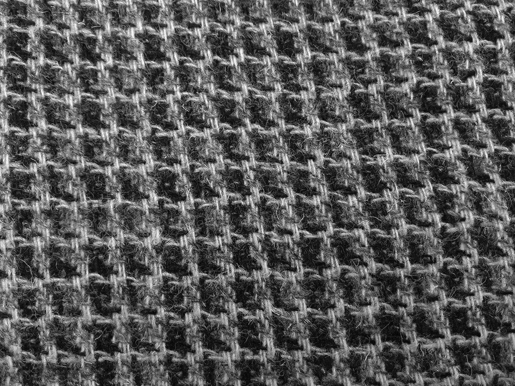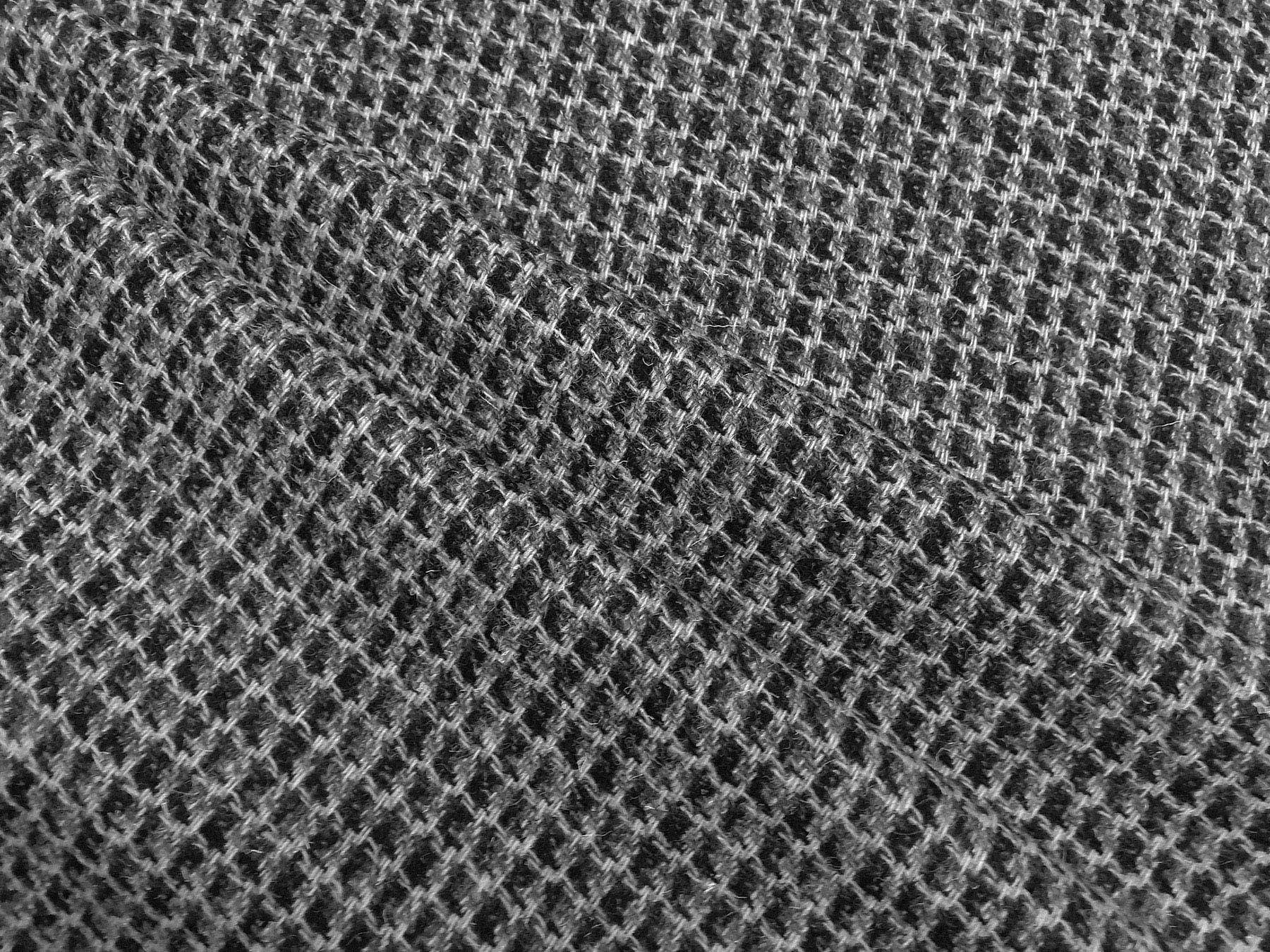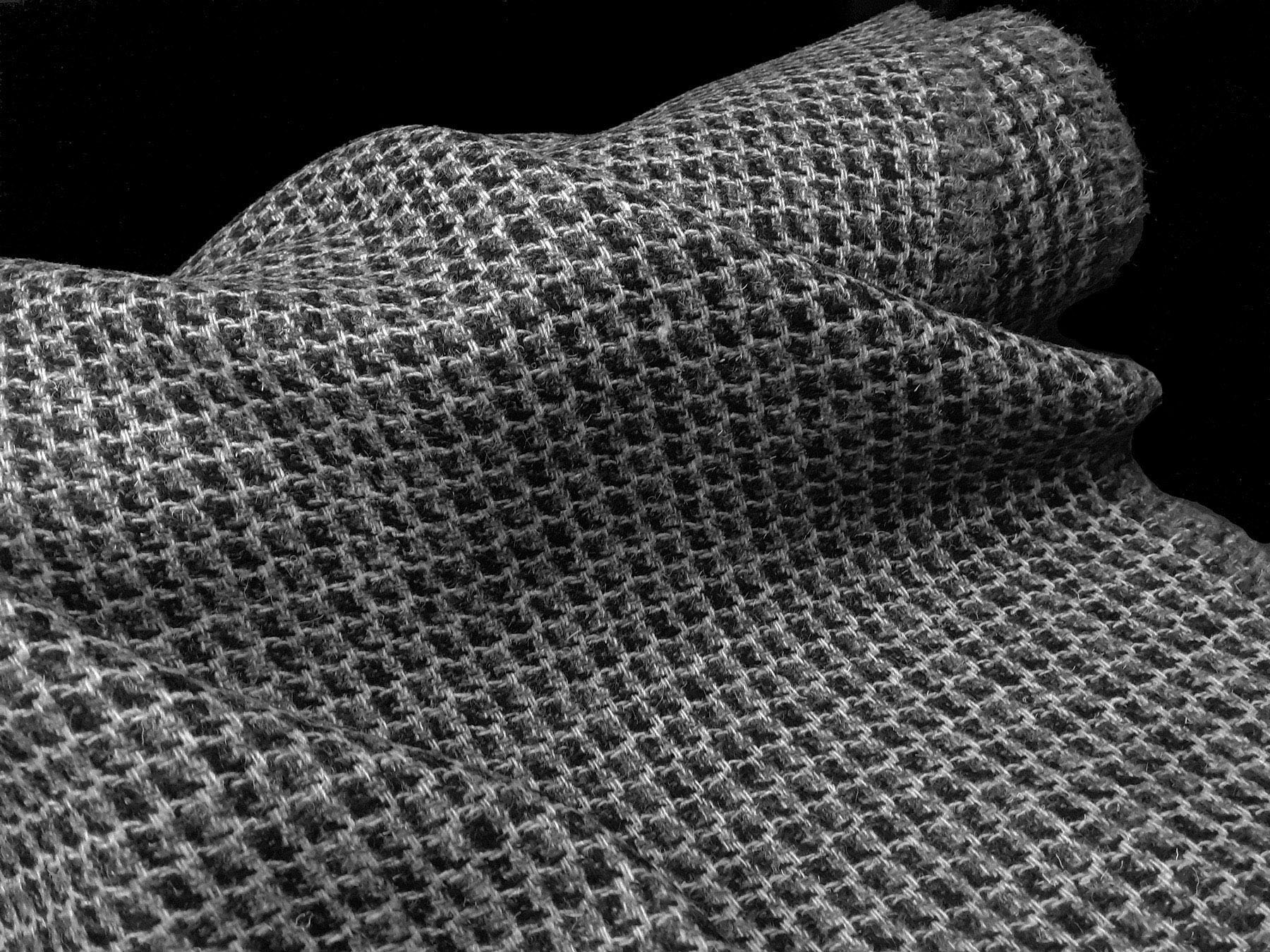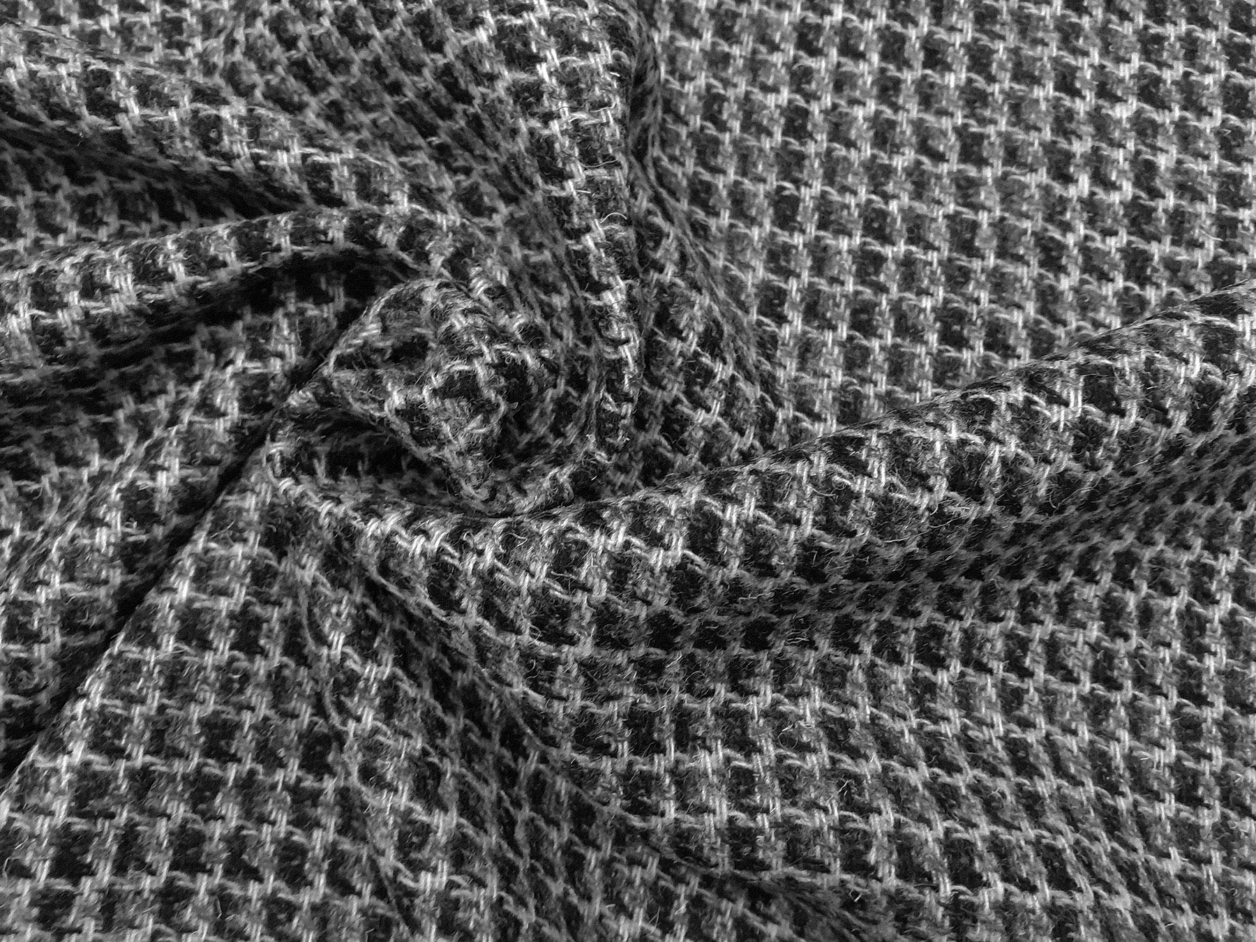 Tessuto in lana cardata a disegno geometrico sui toni del bianco, grigio e nero.