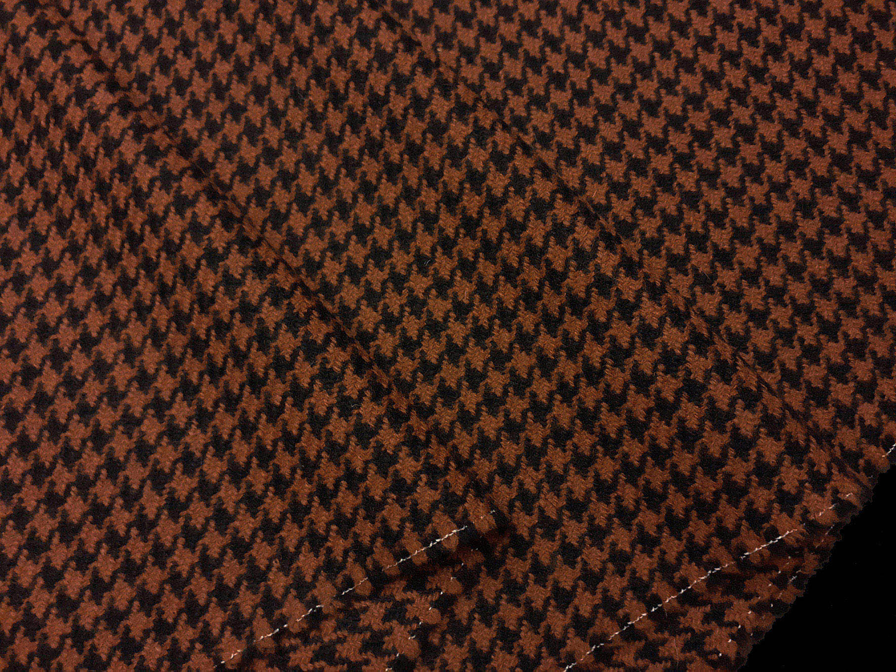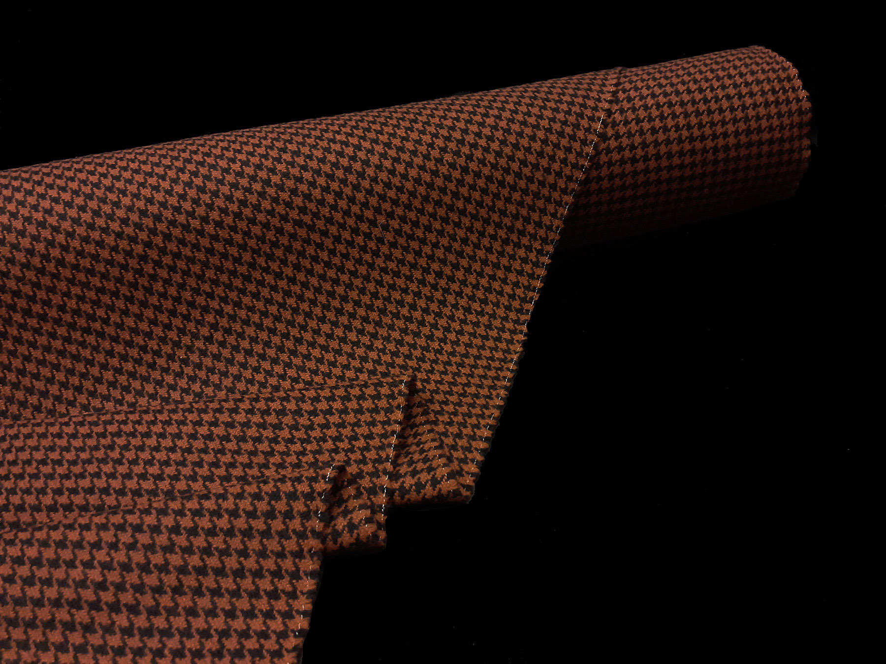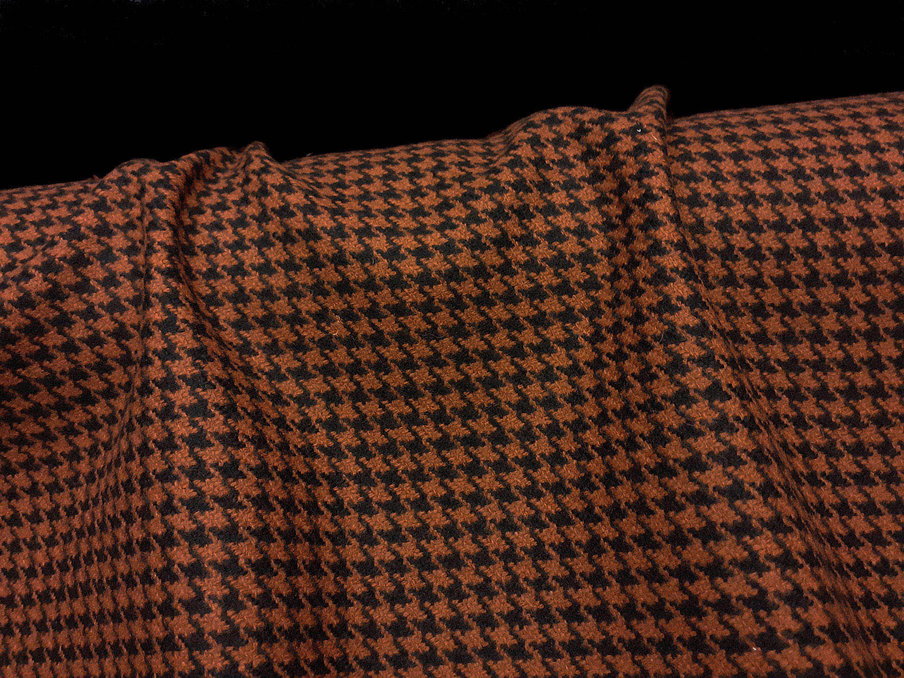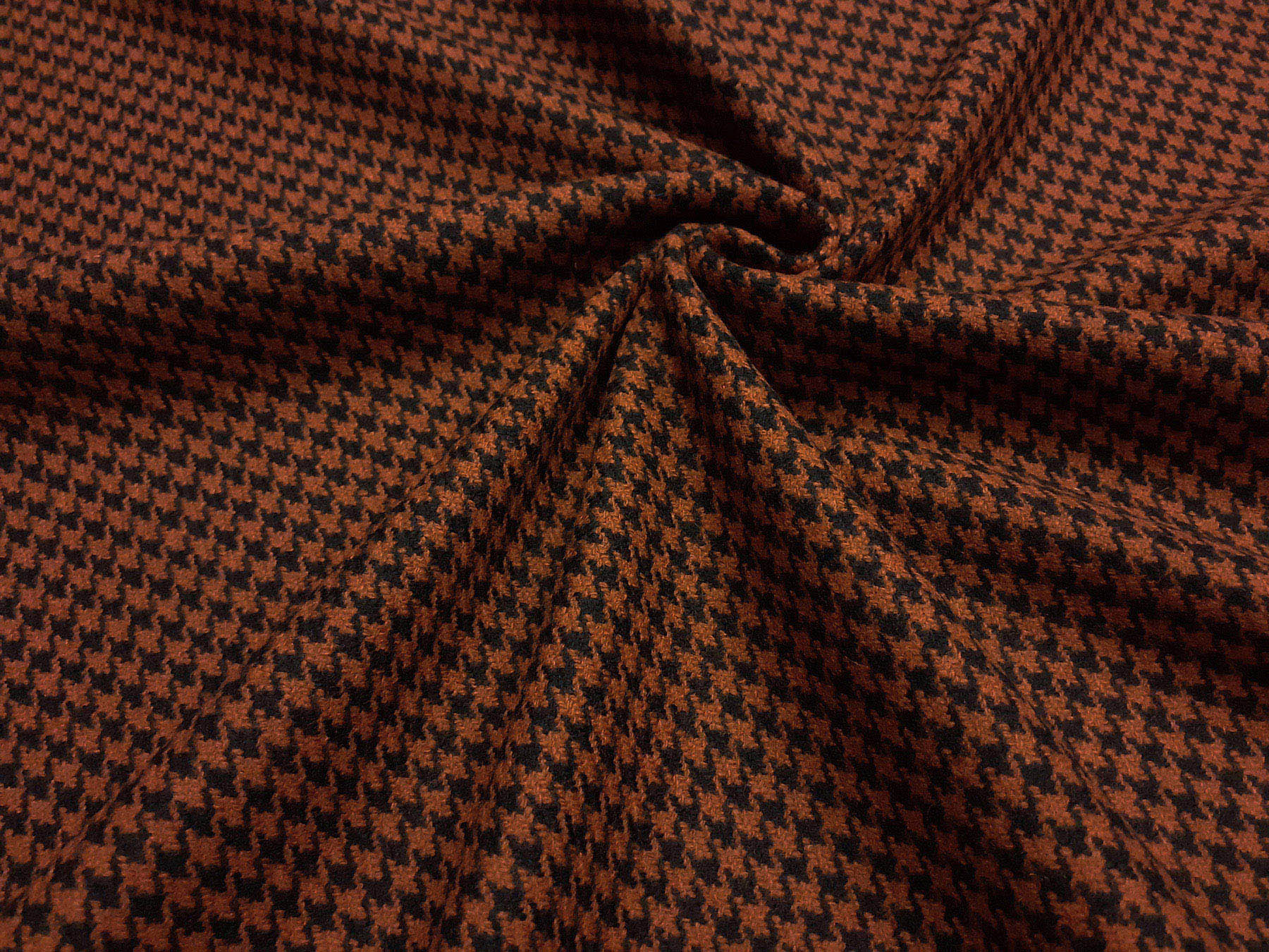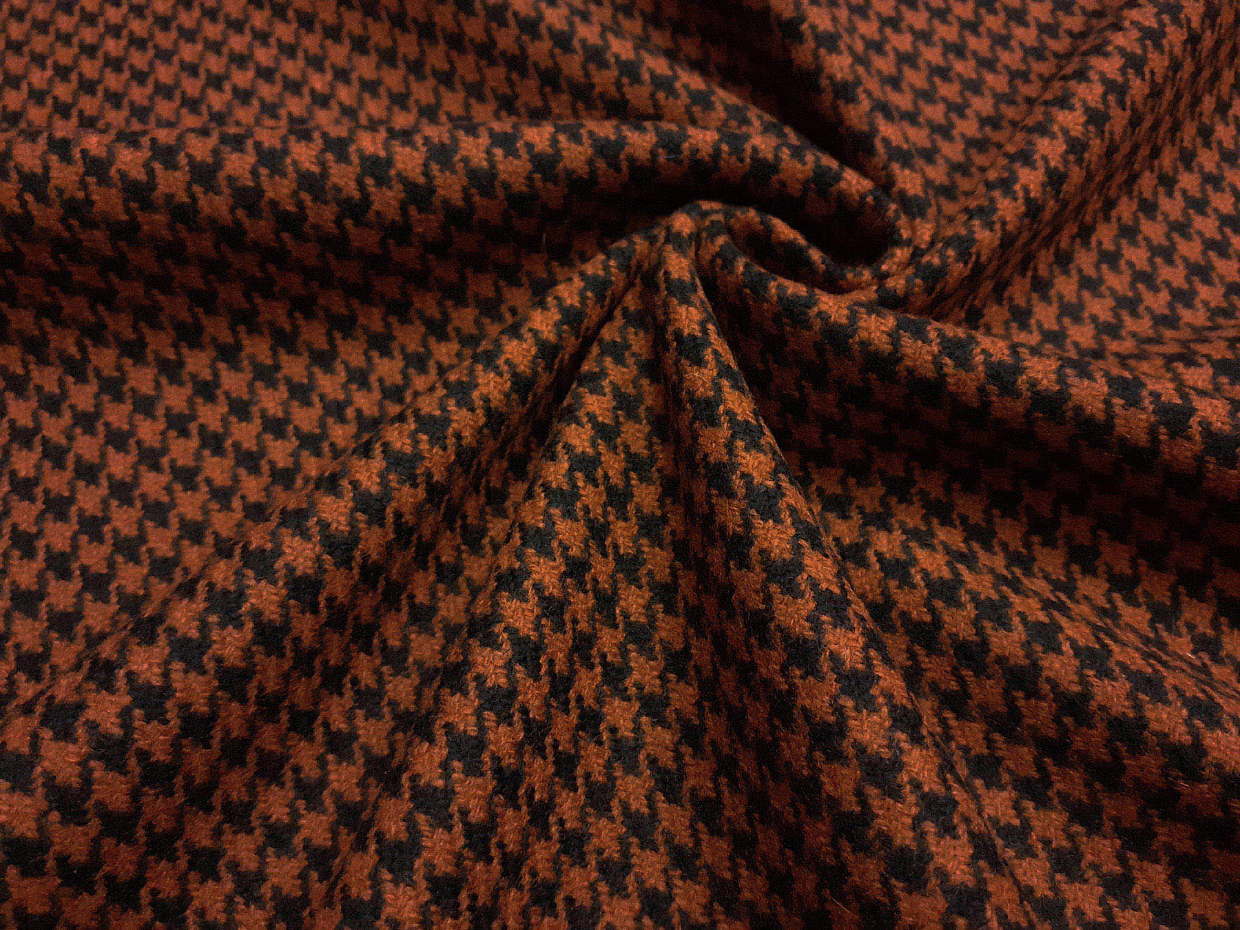 Tessuto in lana merino pied de poule nero e tinta ocra aranciata
