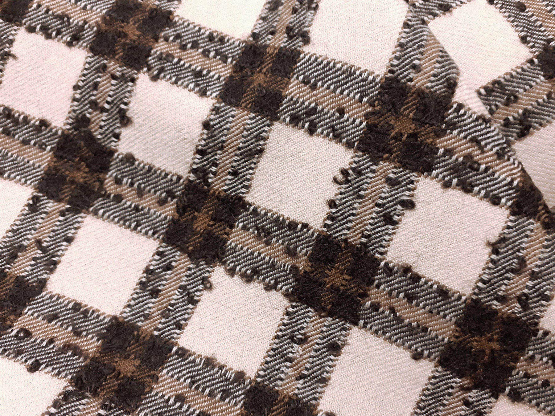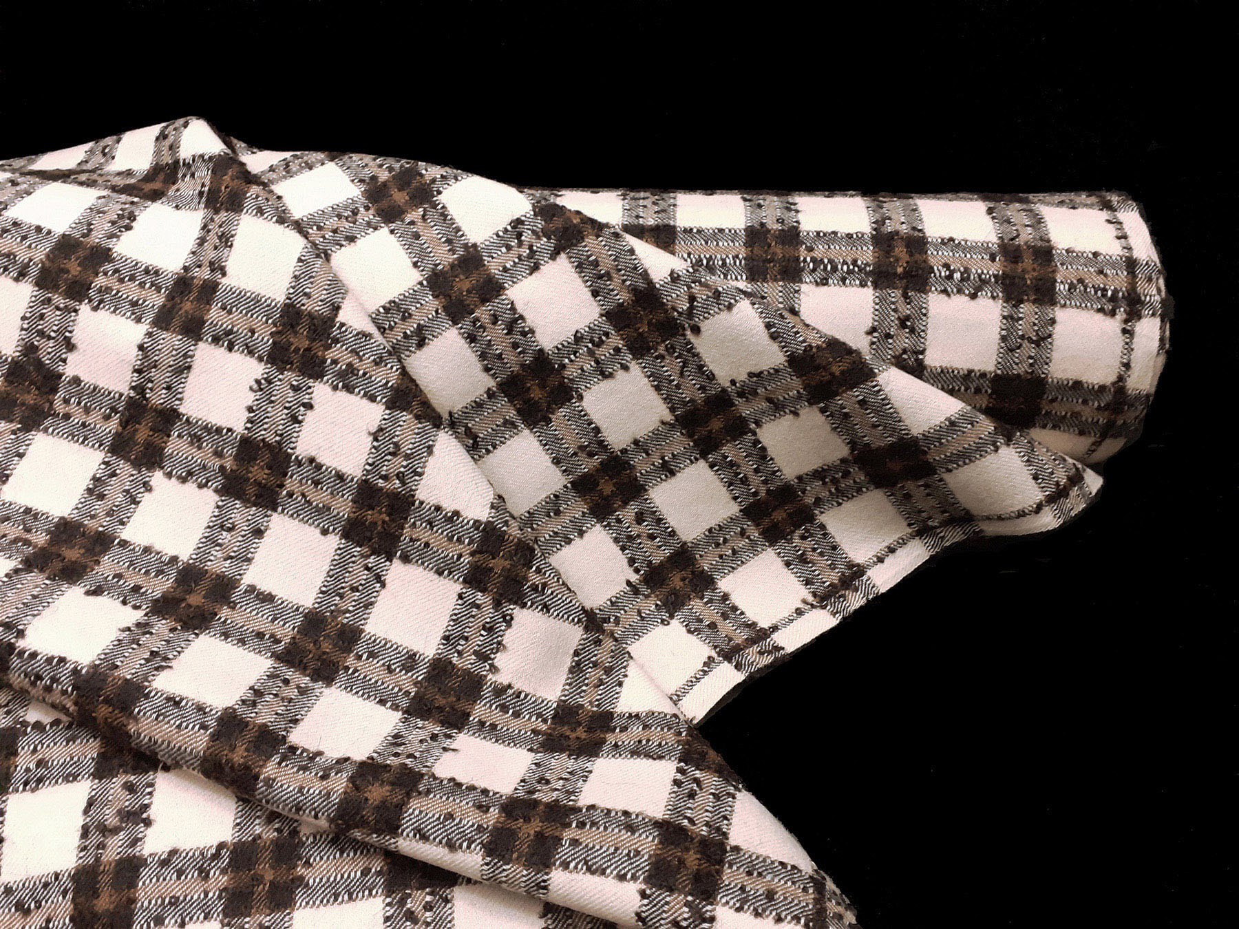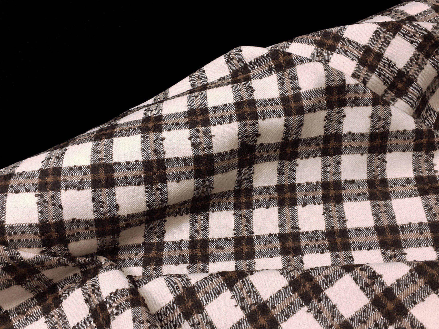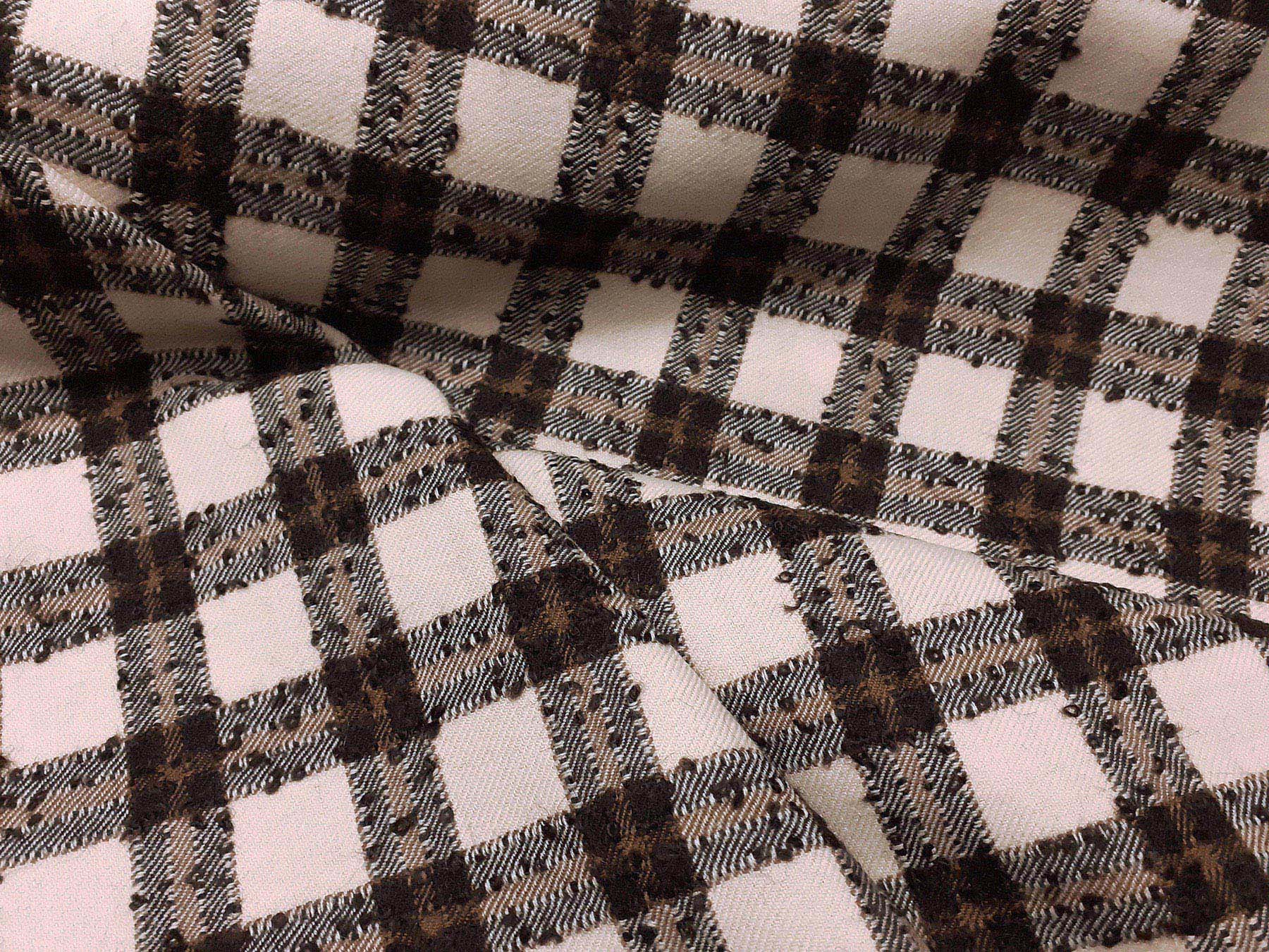 Tessuto in lana merino quadretti avorio e marrone bouclè