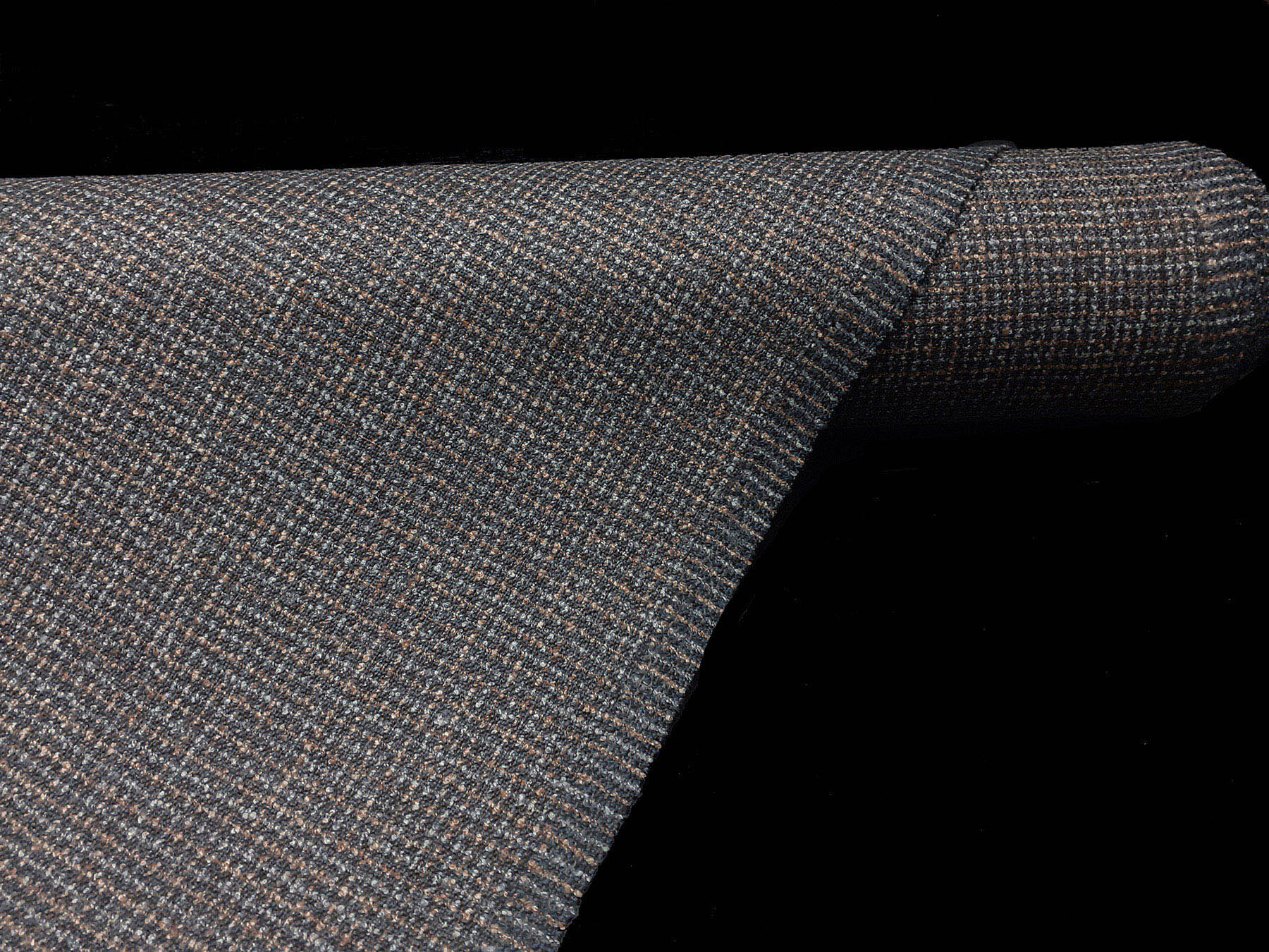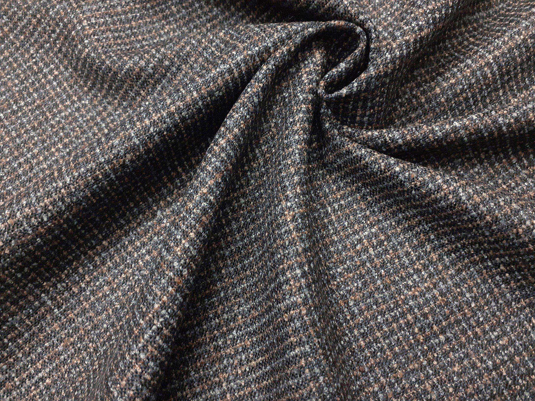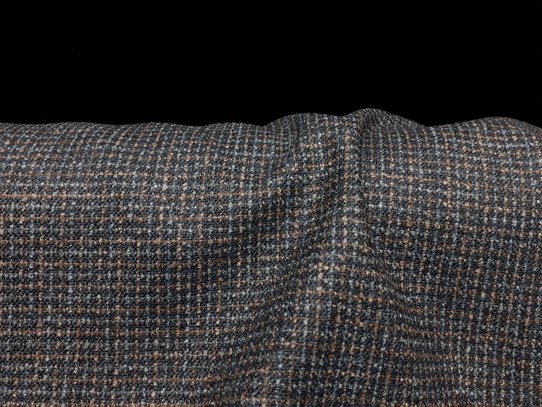 Tessuto in lana merino con microdisegno grigio, celeste e tinta nocciola