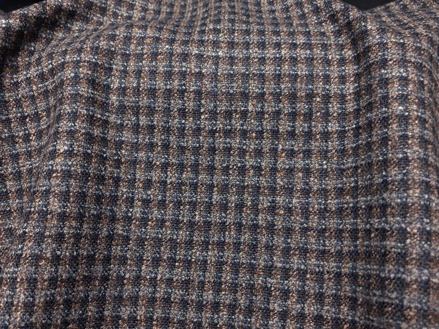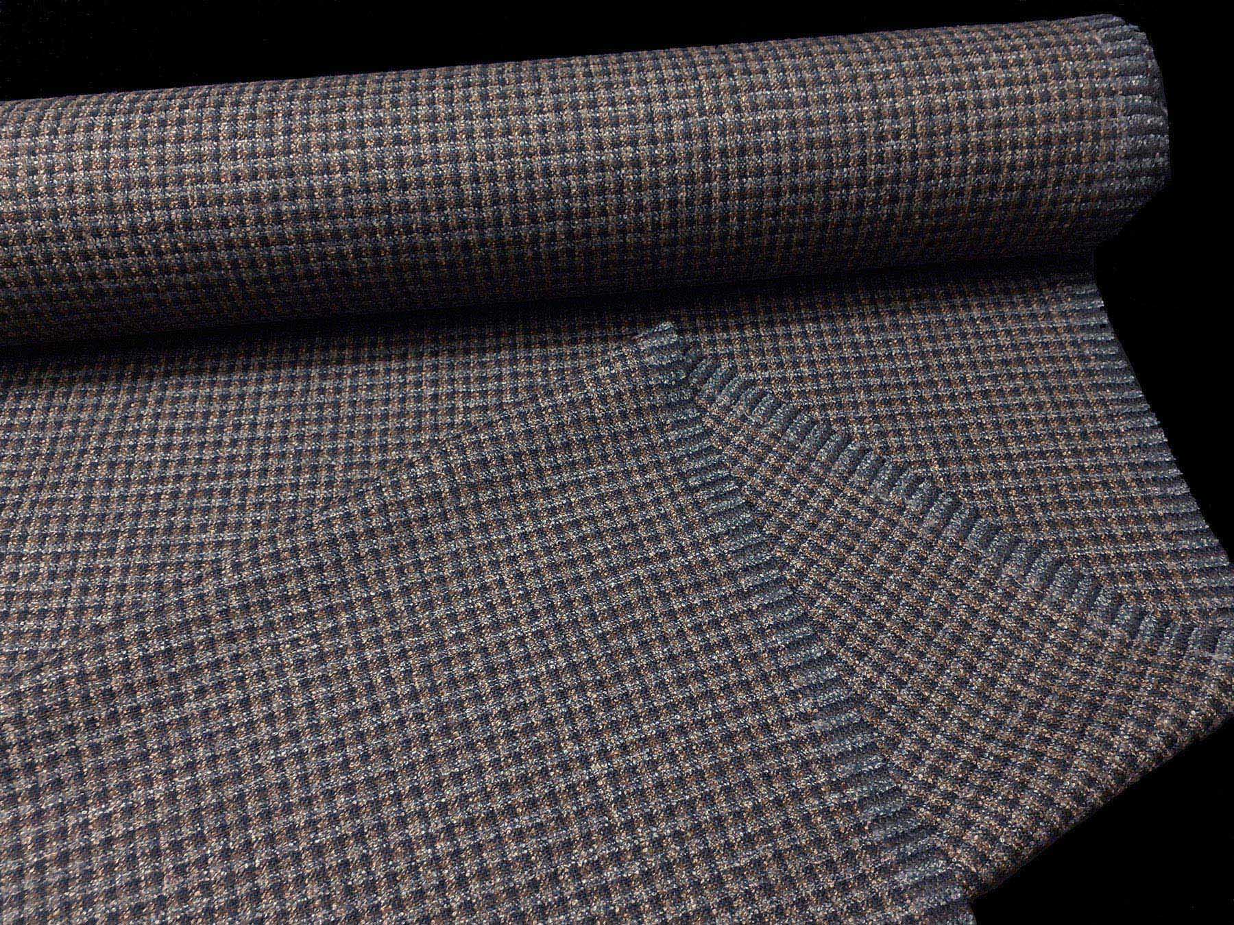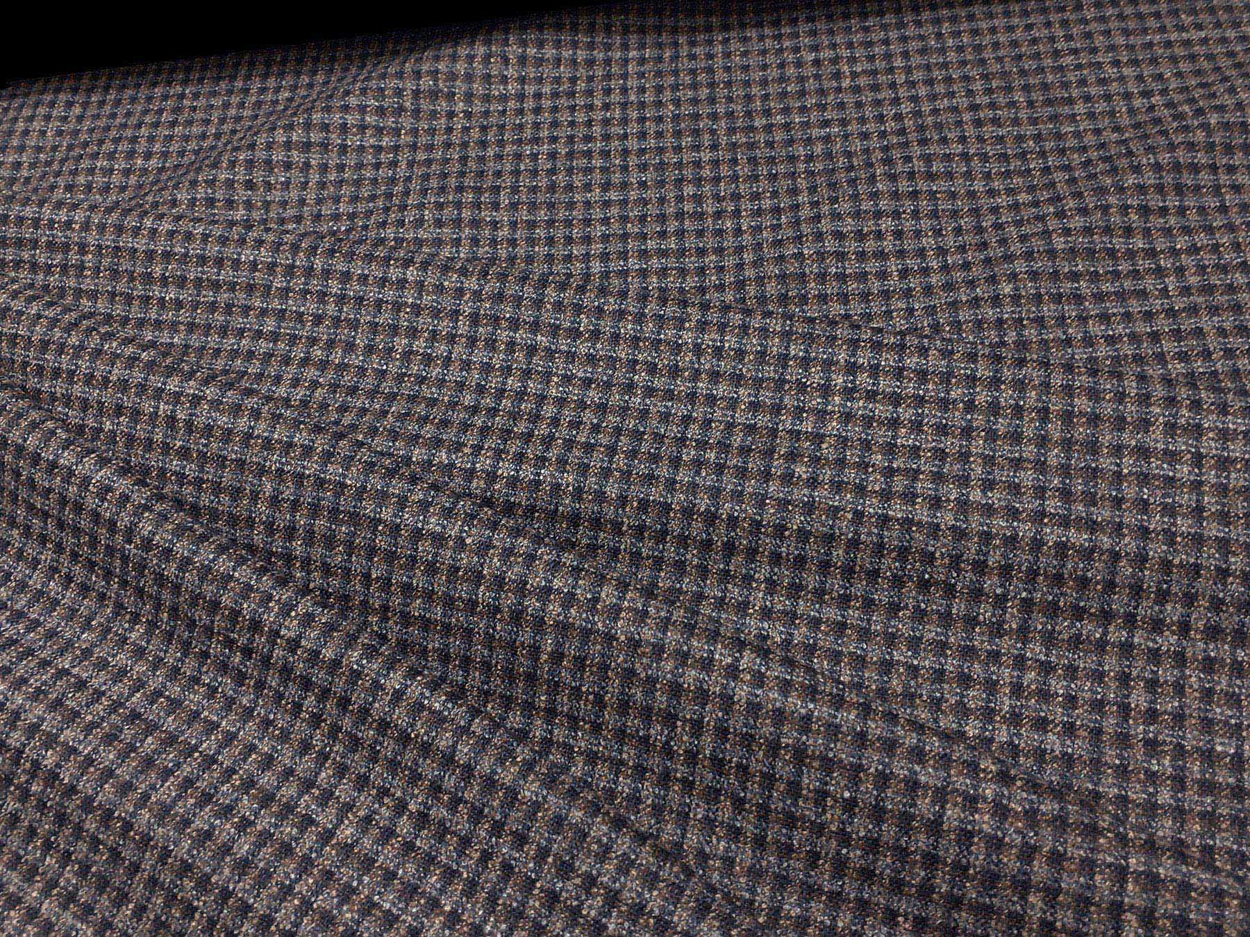 Tessuto in lana merino con microdisegno grigio, celeste e tinta nocciola