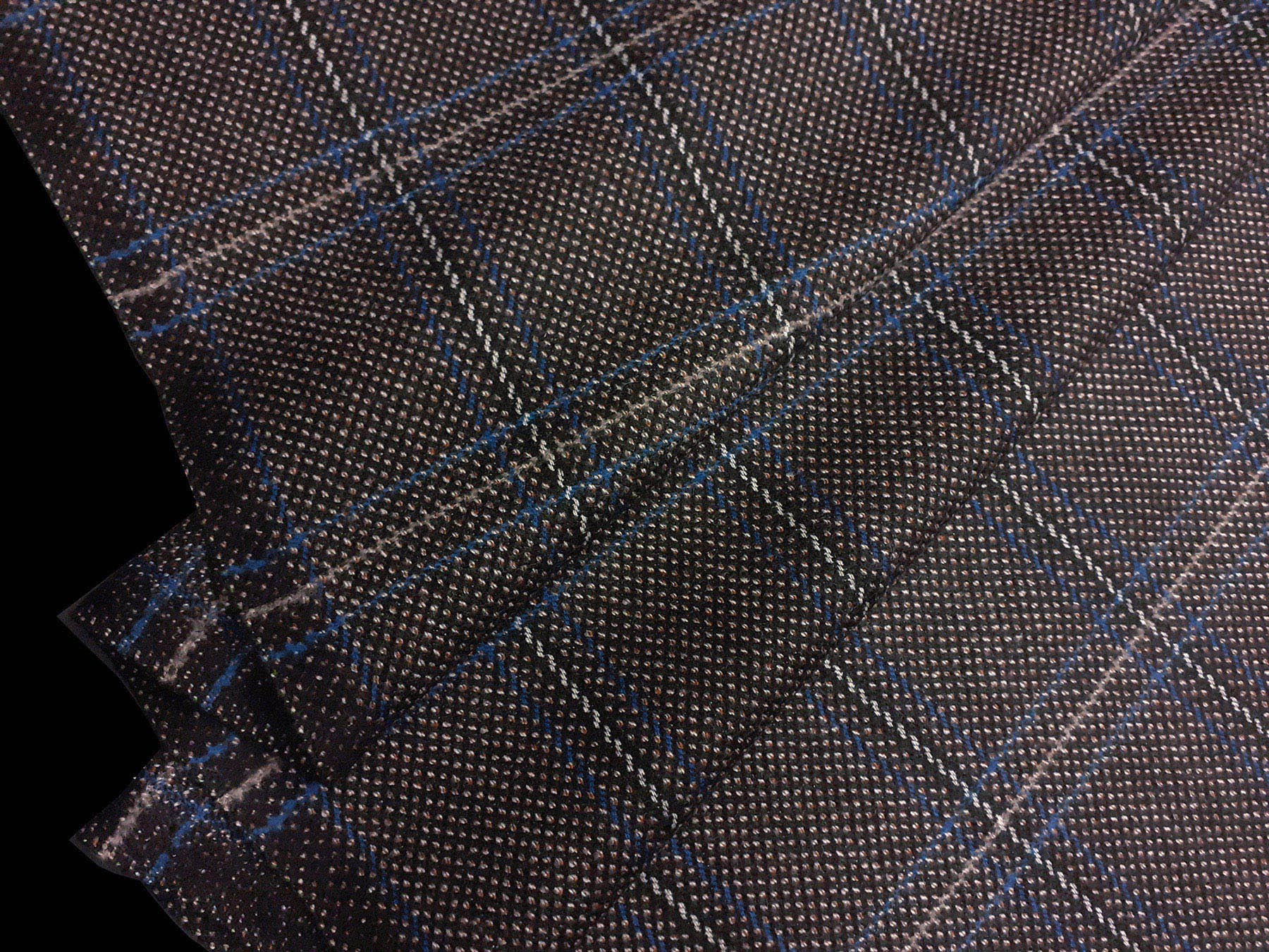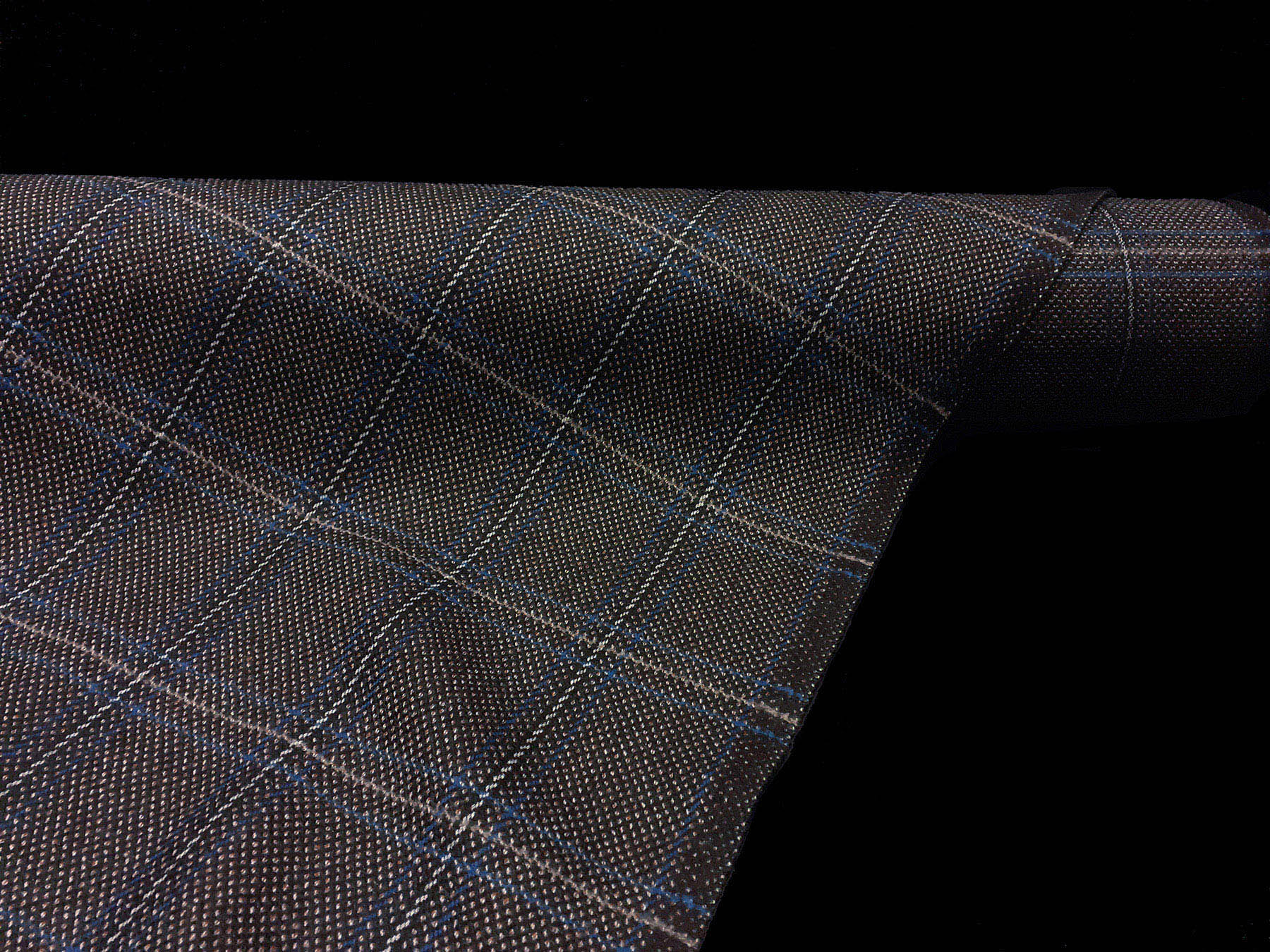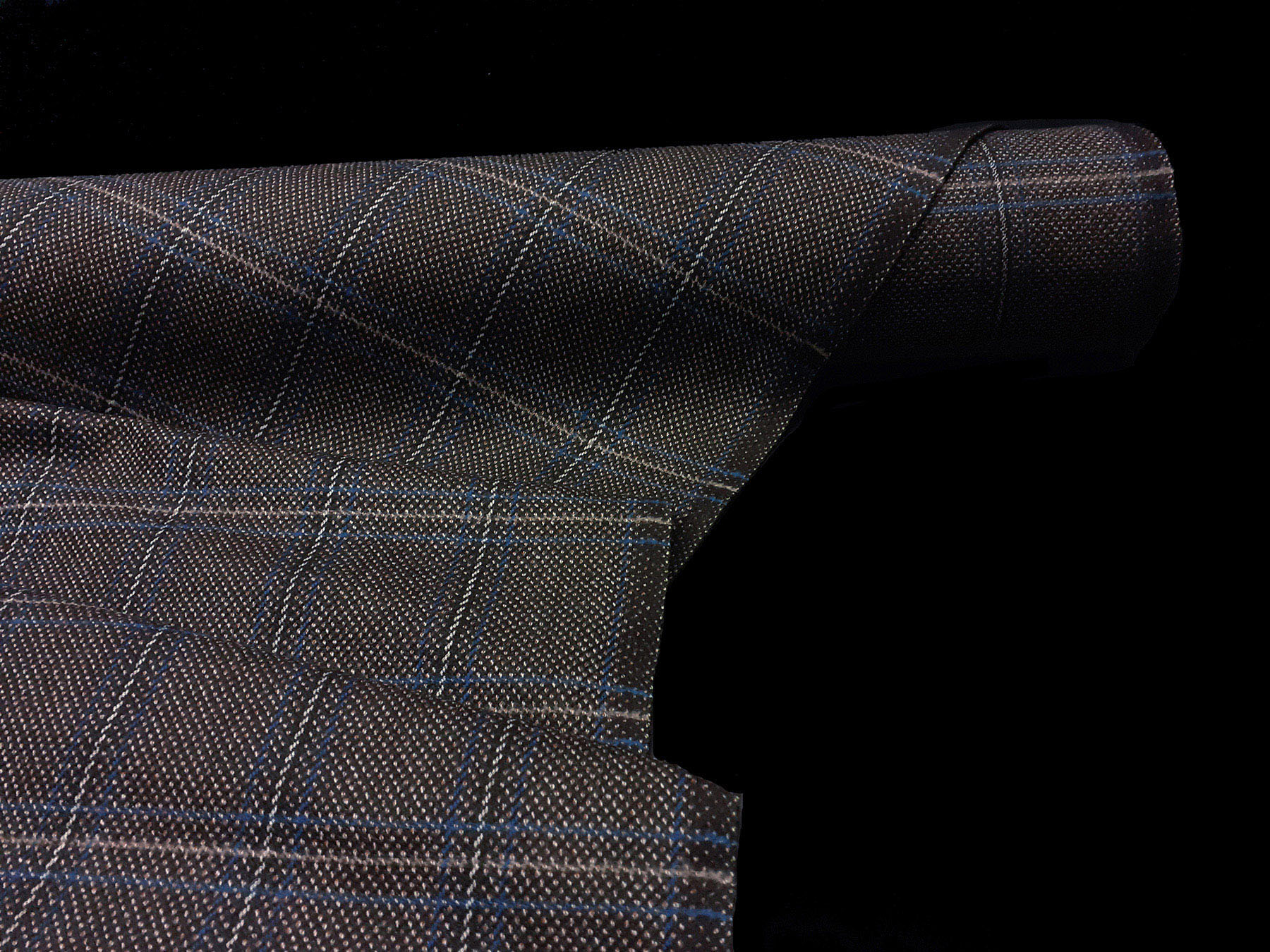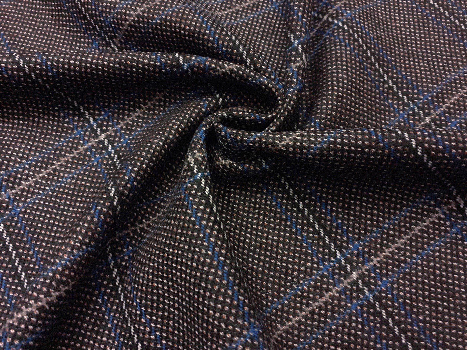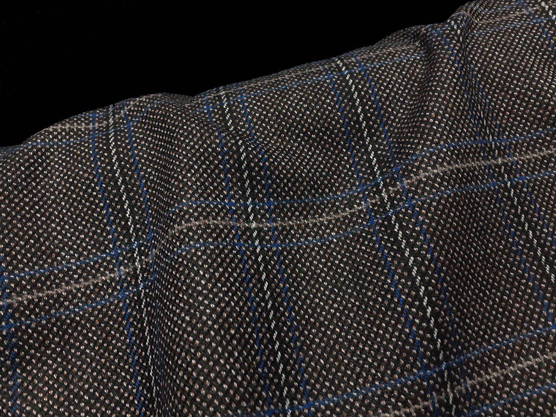 Tessuto in lana merino per giacconi a riquadri blu su fondo marrone