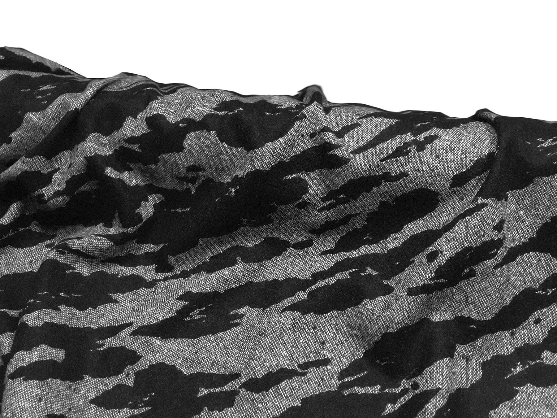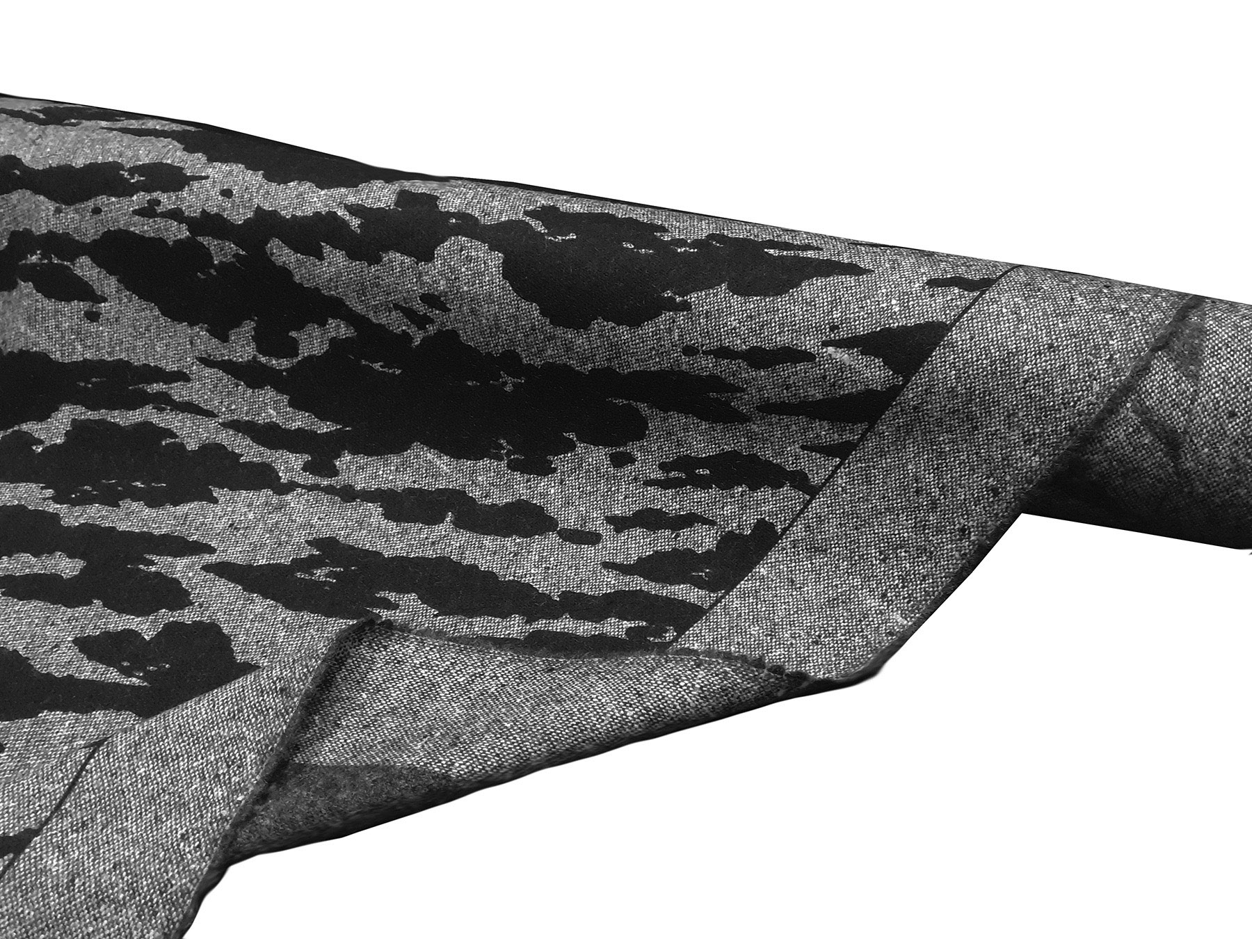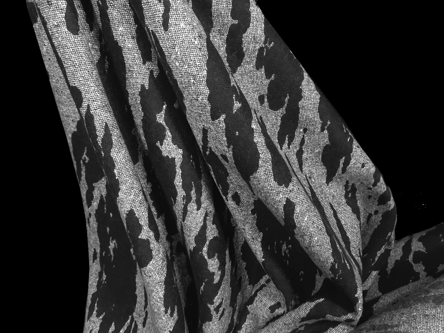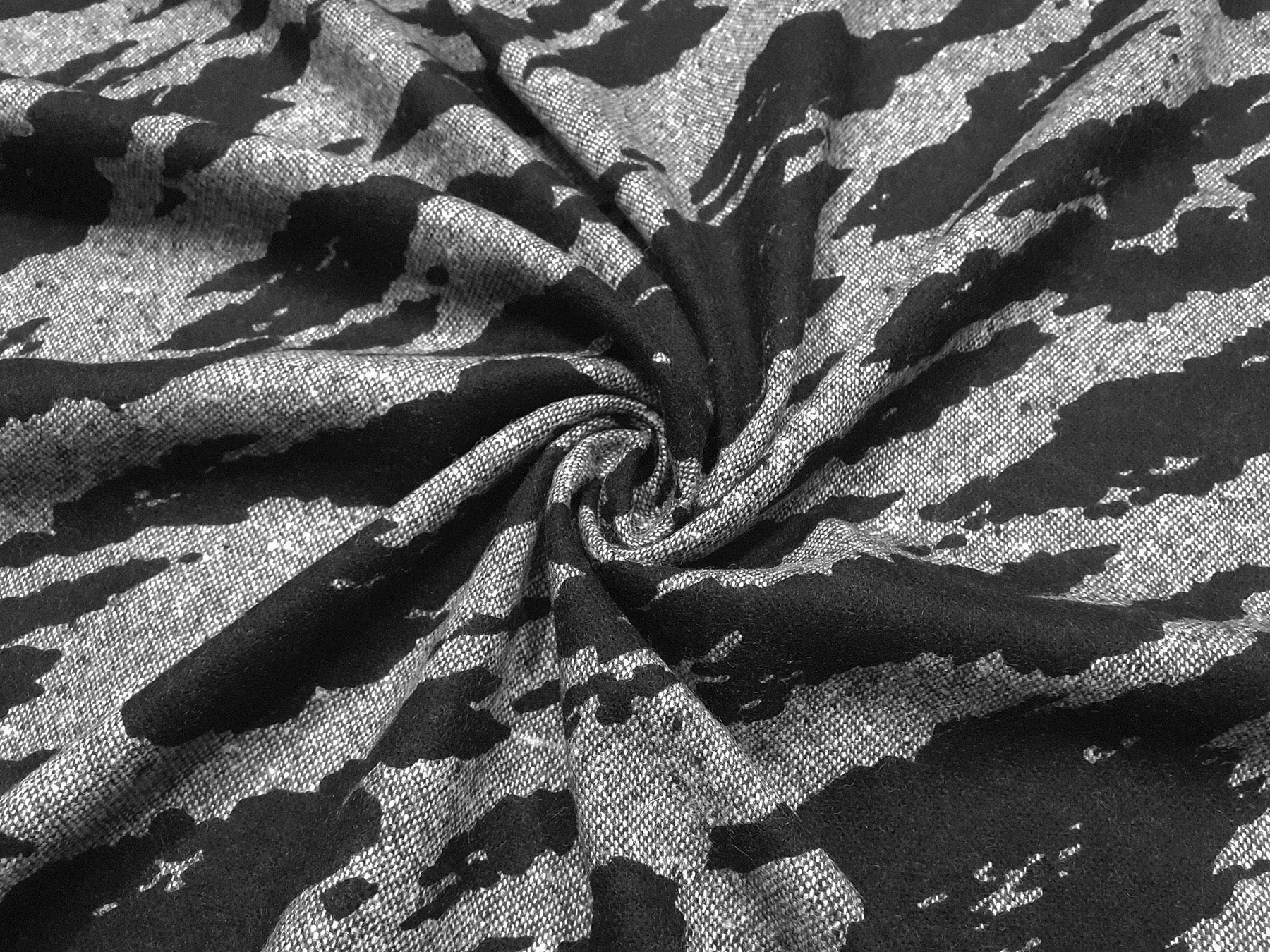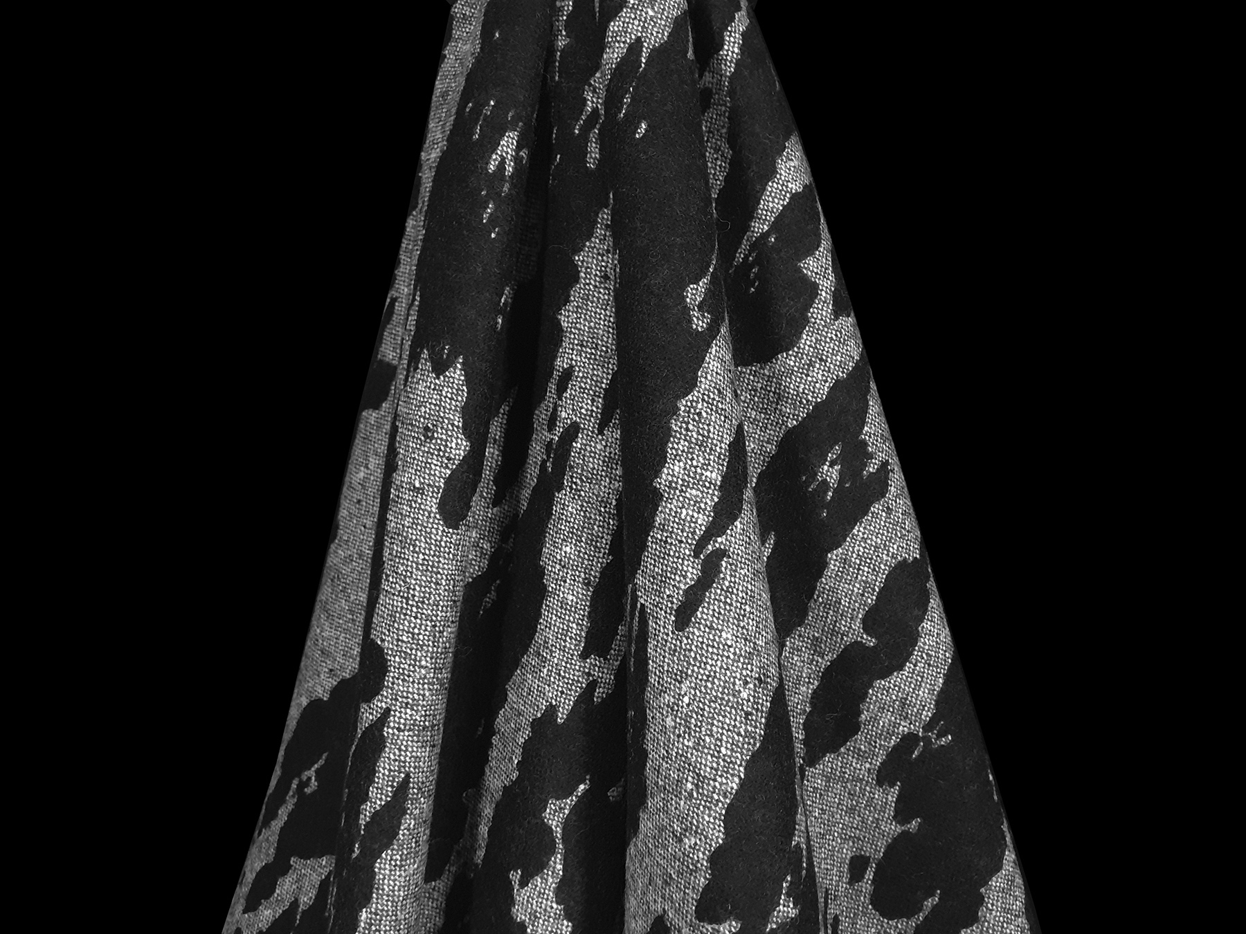 Questo tessuto, di produzione italiana, è caratterizzato da un intreccio di fili irregolari bianchi e neri che formano il classico effetto “tweed” con disegno astratto stampato. Di peso medio e mano morbida viene usato come tessuto invernale per taileur e abiti.