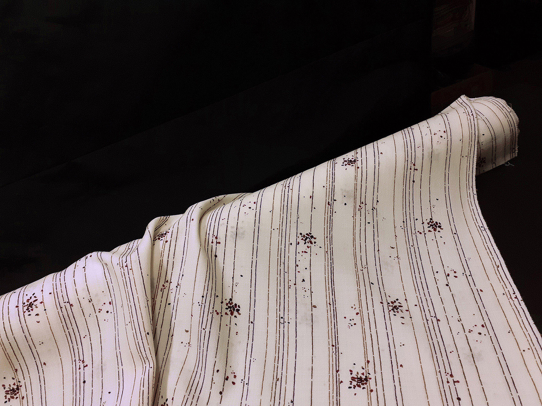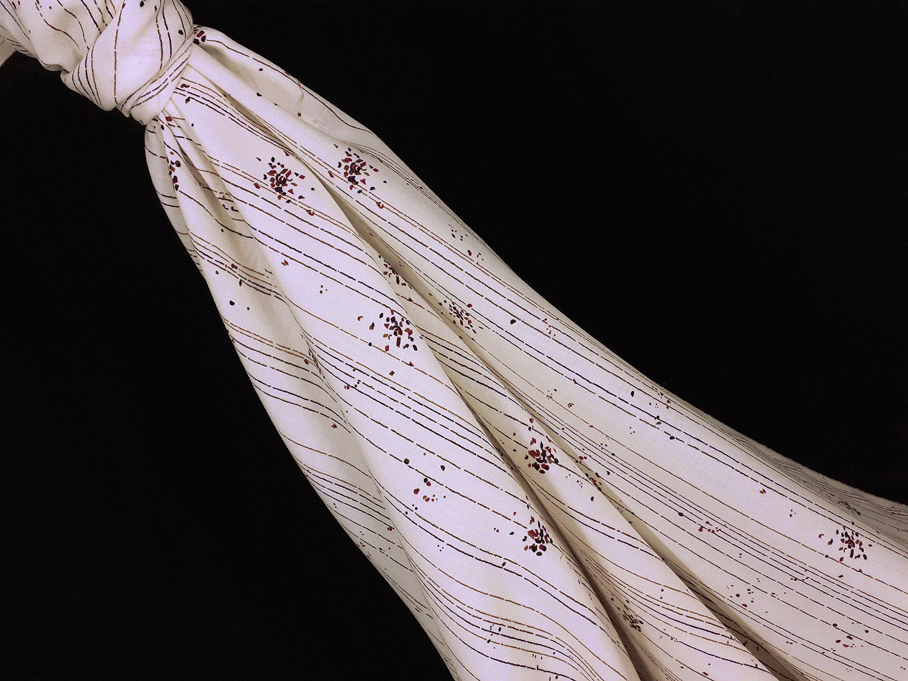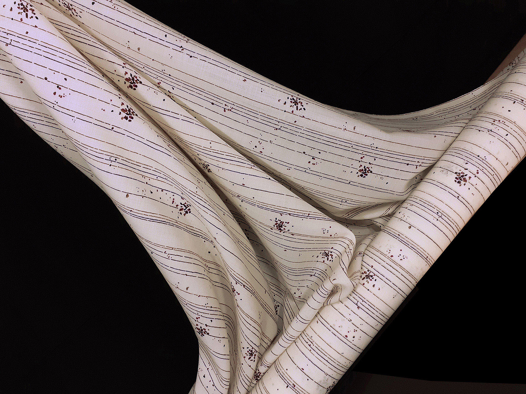 Mussola di lana a righe assimetriche e fiorellini su fondo avorio