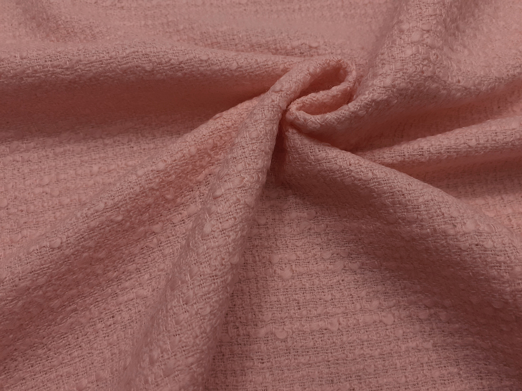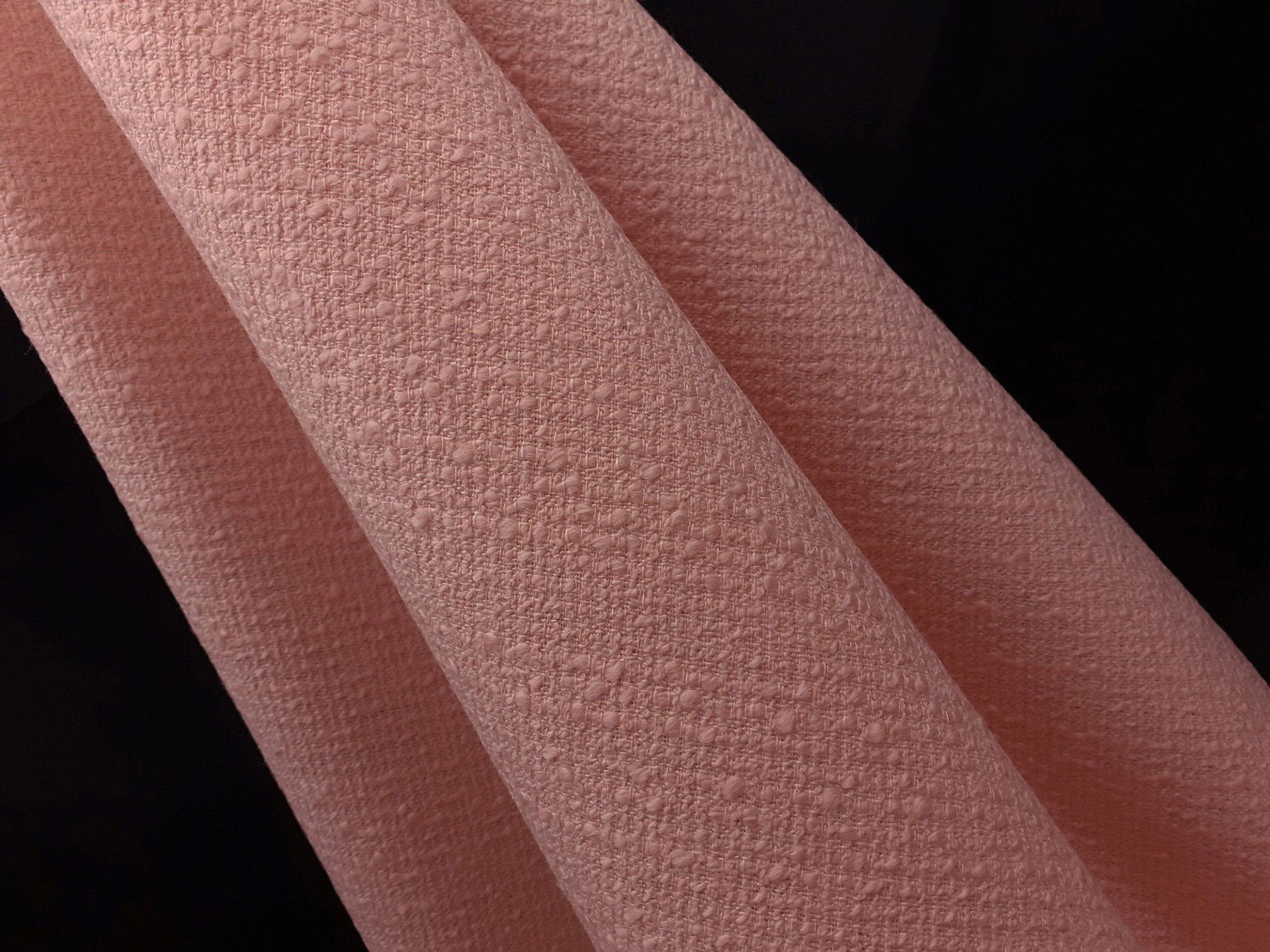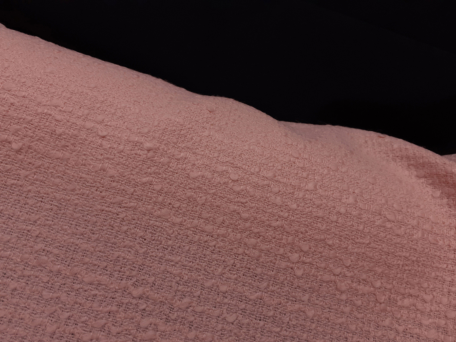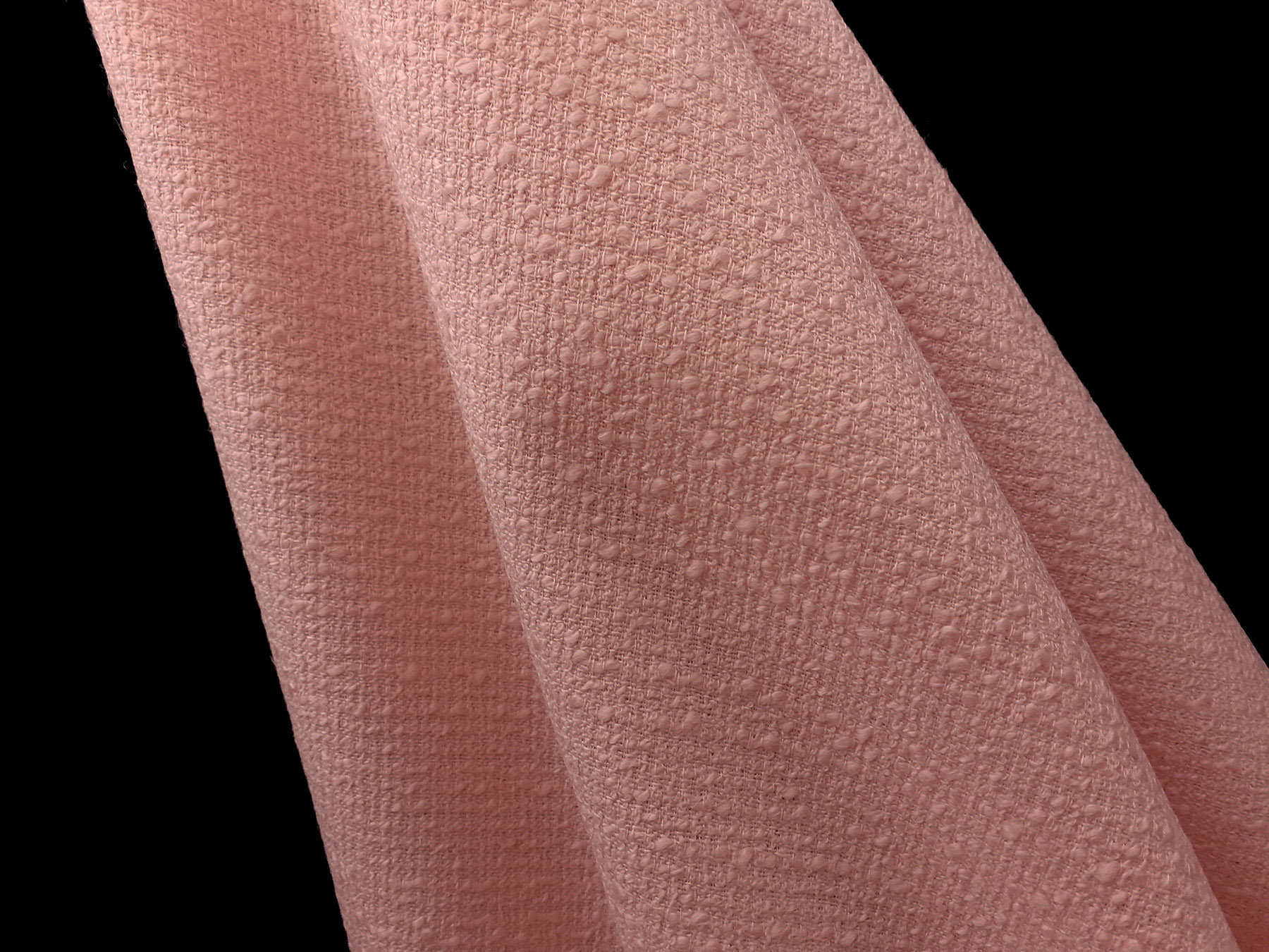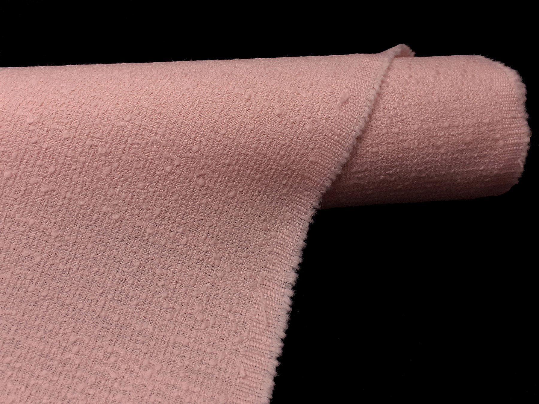 In questo tessuto Chanel – con armatura a stuoia – gli effetti di filatura bouclé e frisé sono intrecciati con filati pettinati più resistenti. La mano è morbida e corposa, ideale per la realizzazione di capispalla, abiti e gonne.