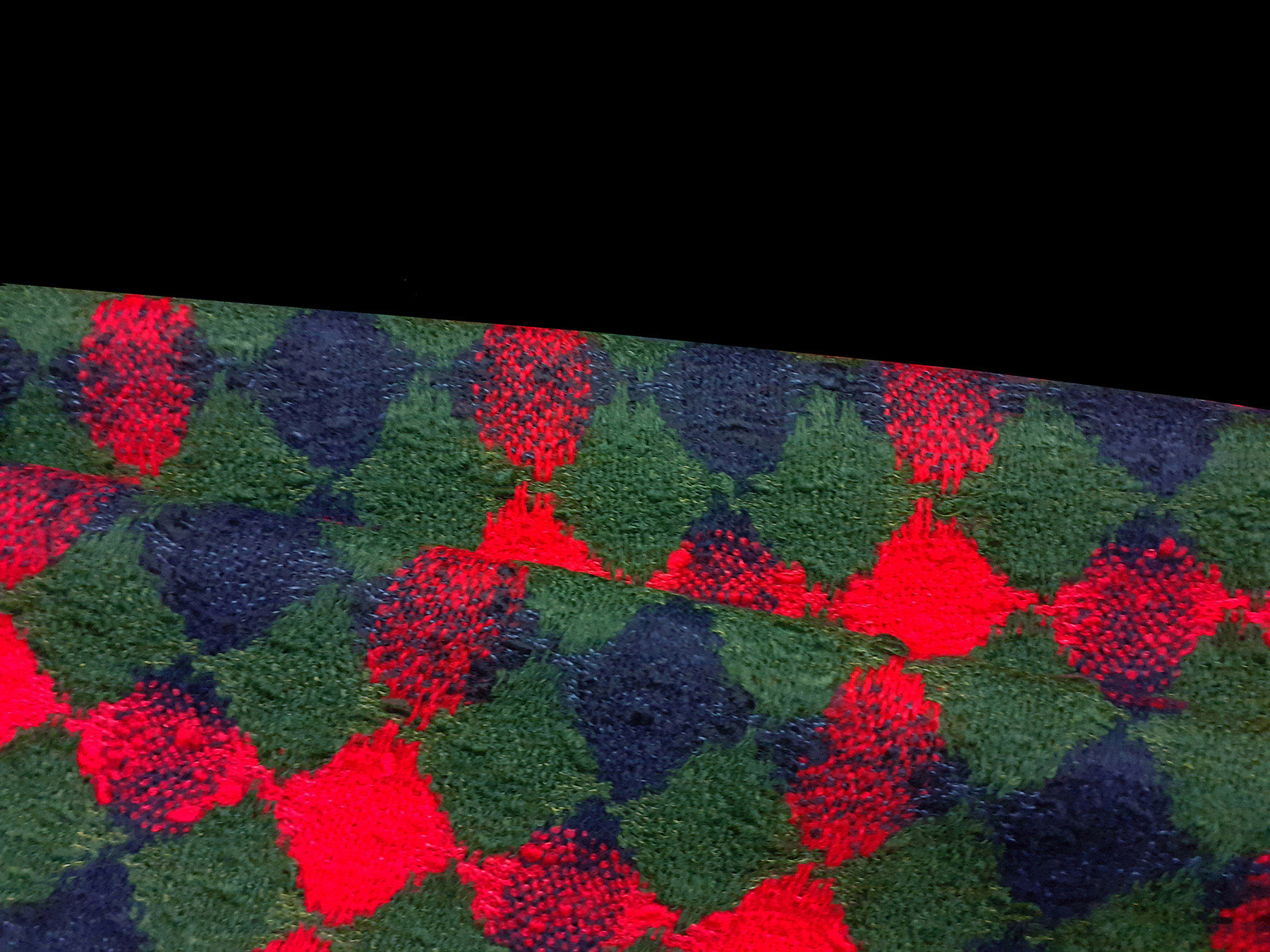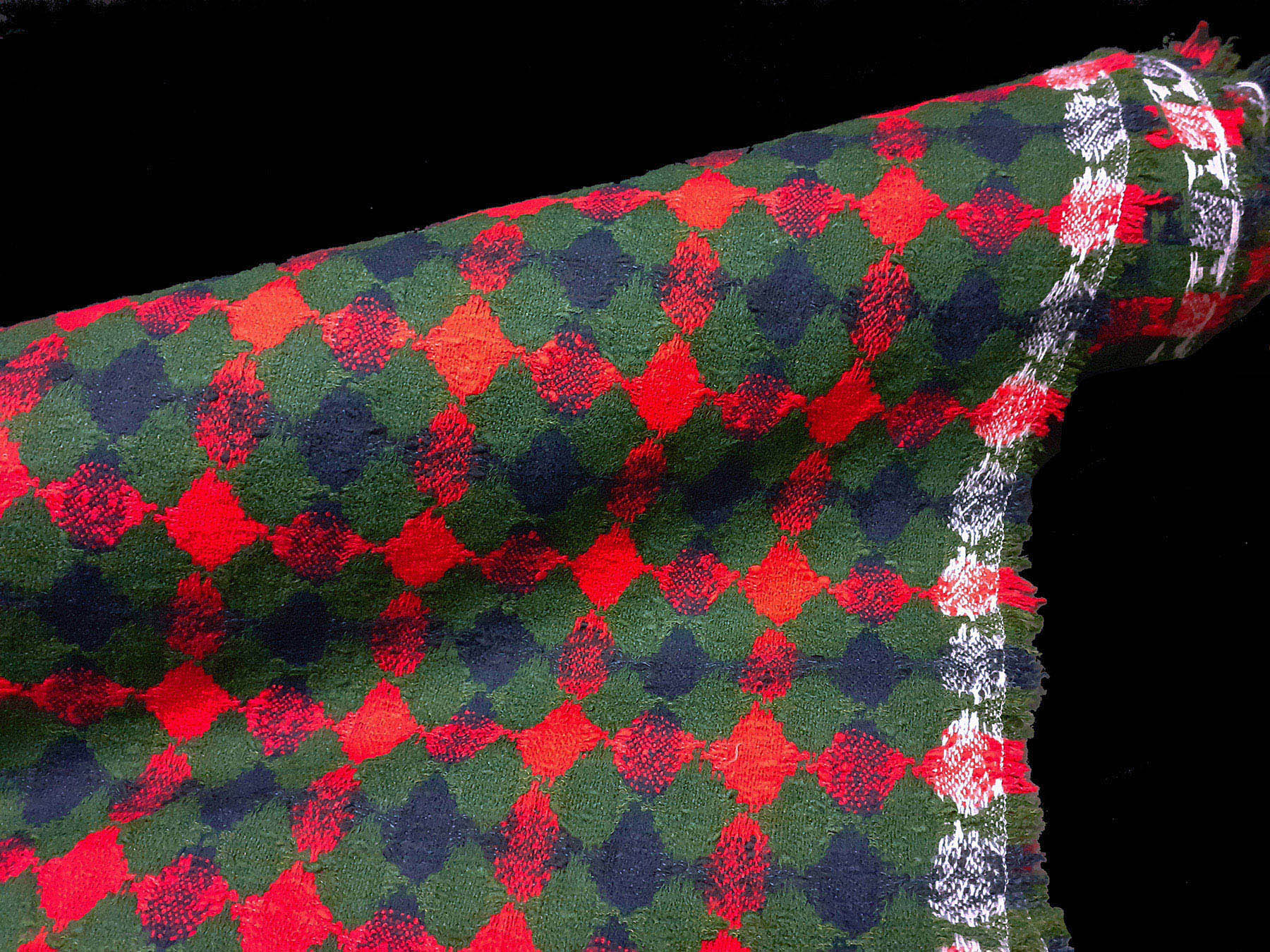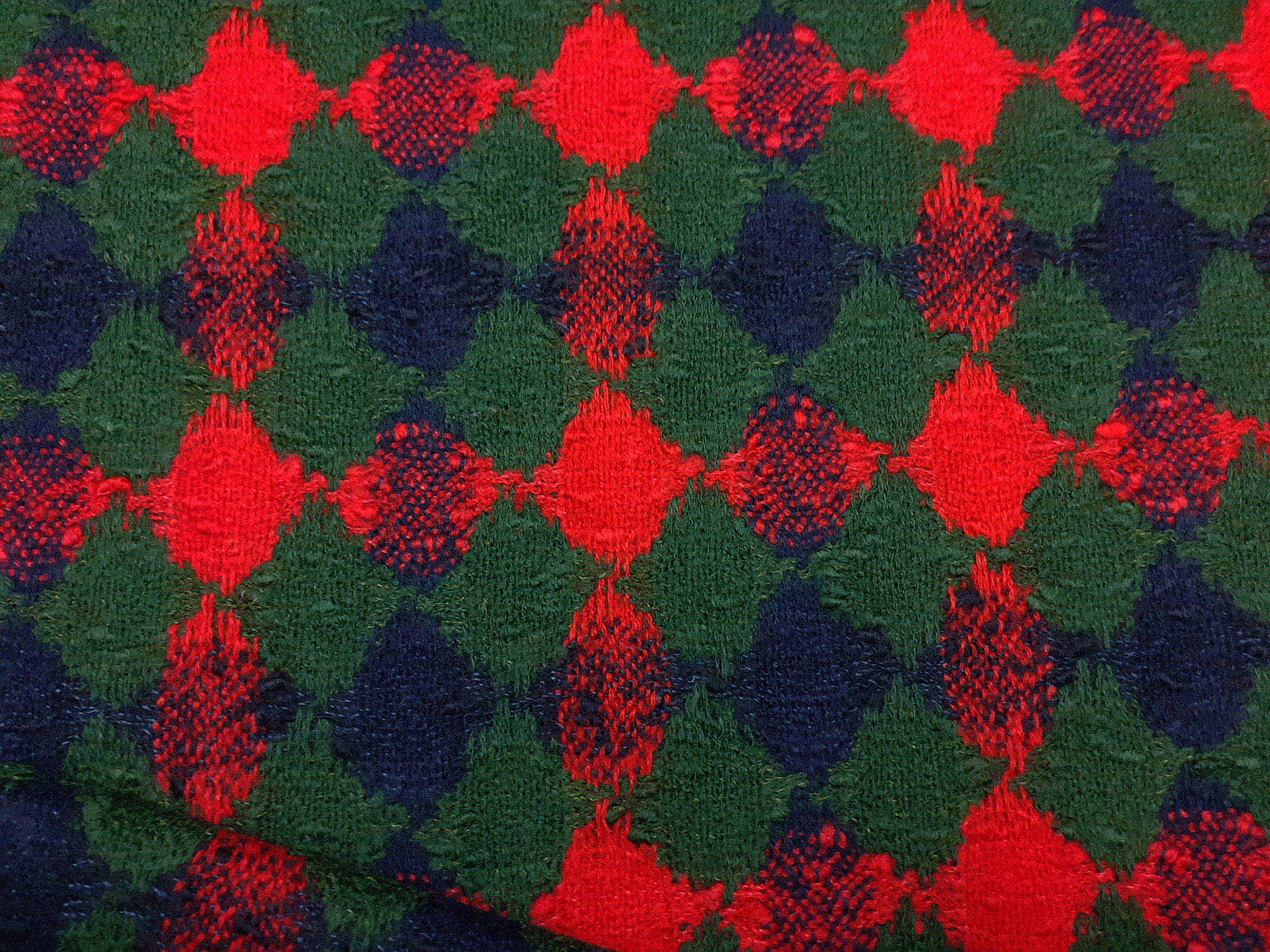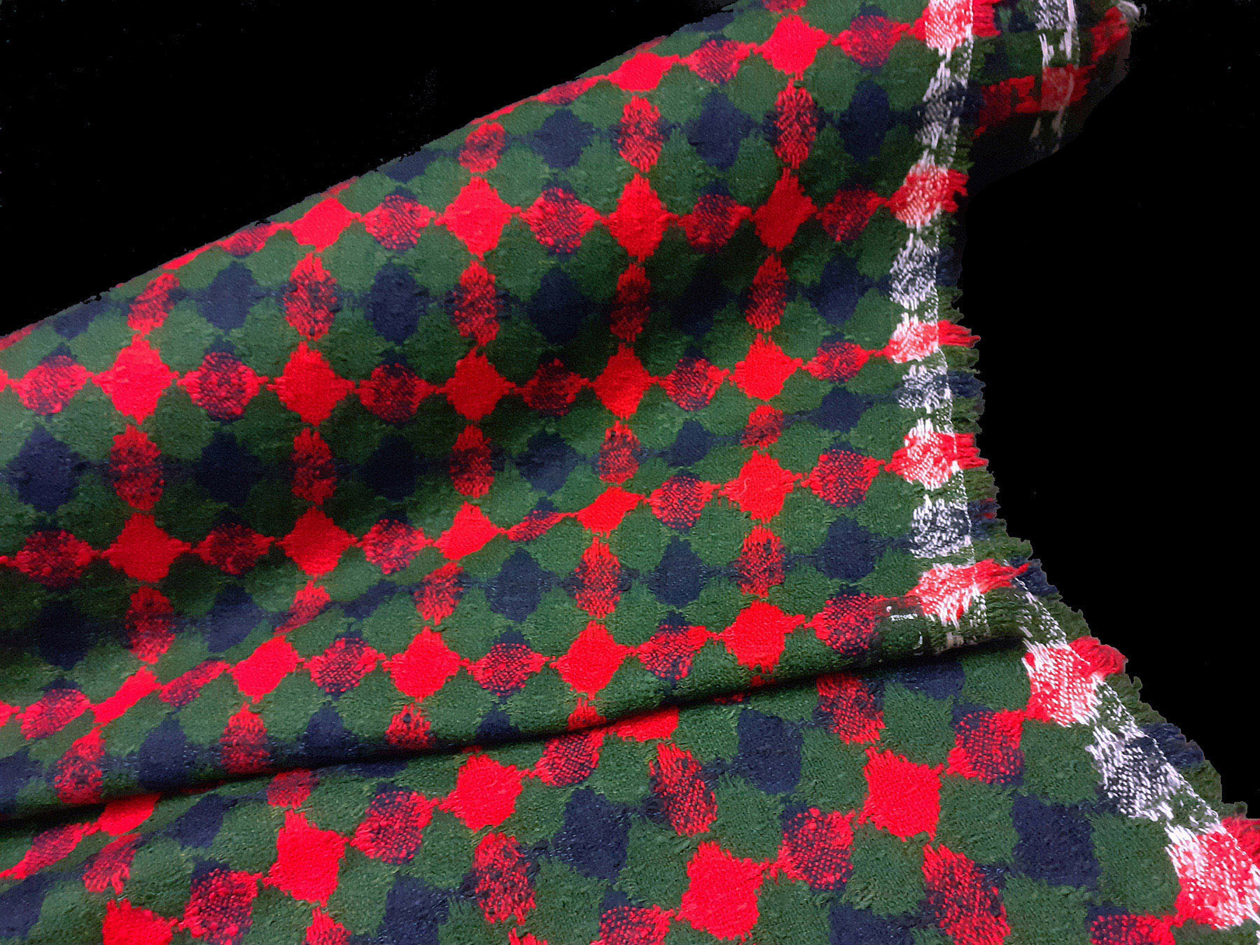 Chanel in lana merino a losanghe blu e rosse su fondo verde