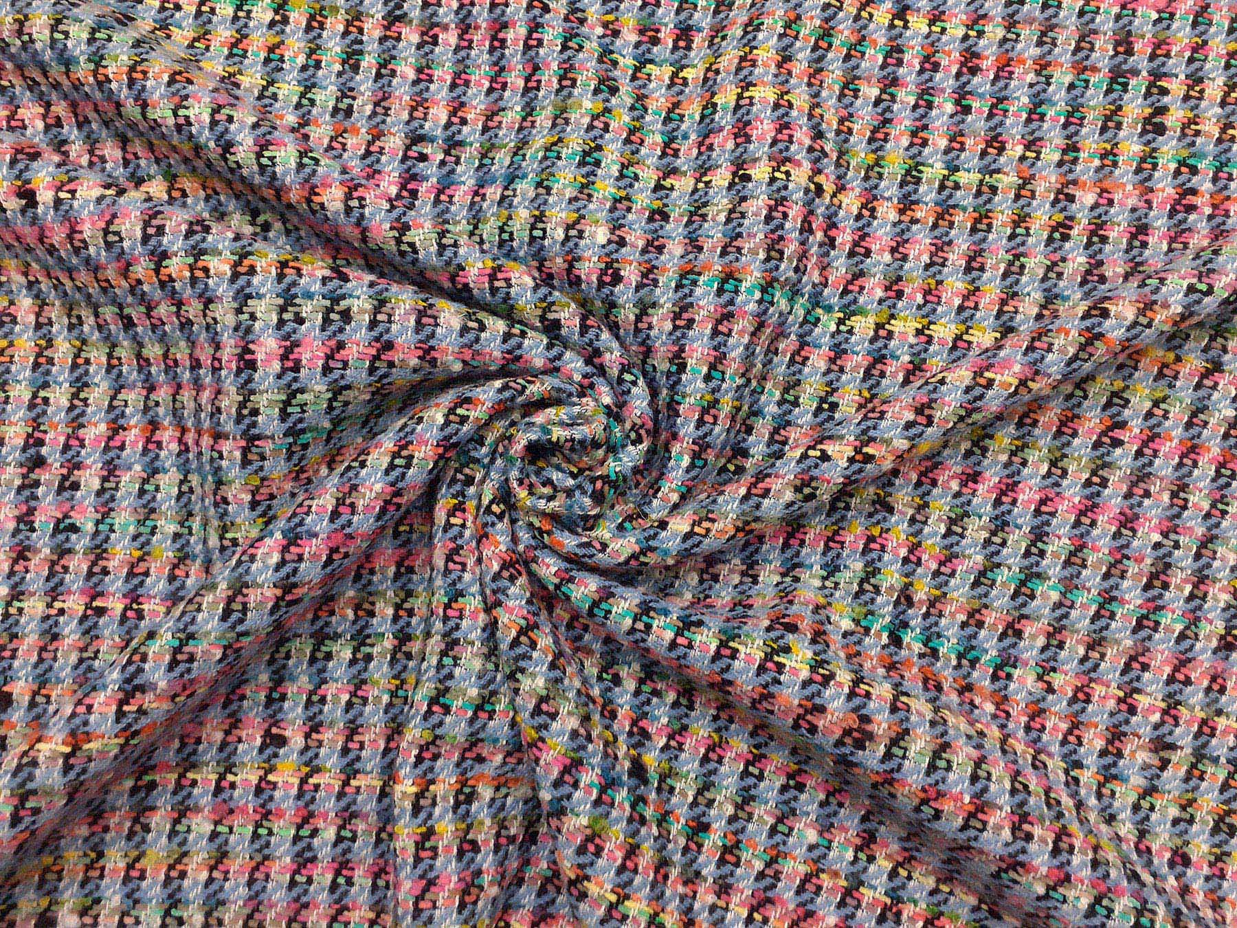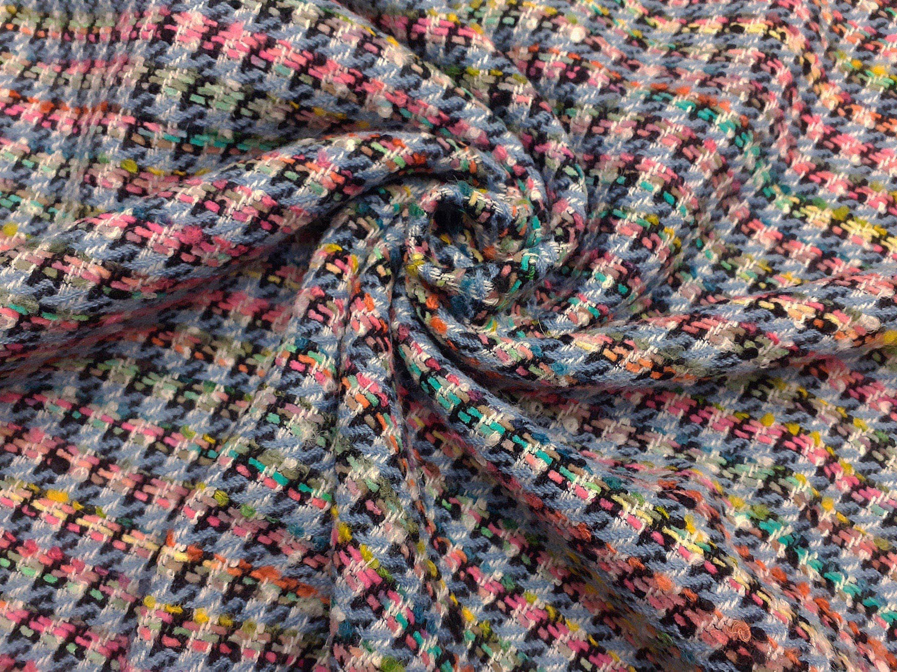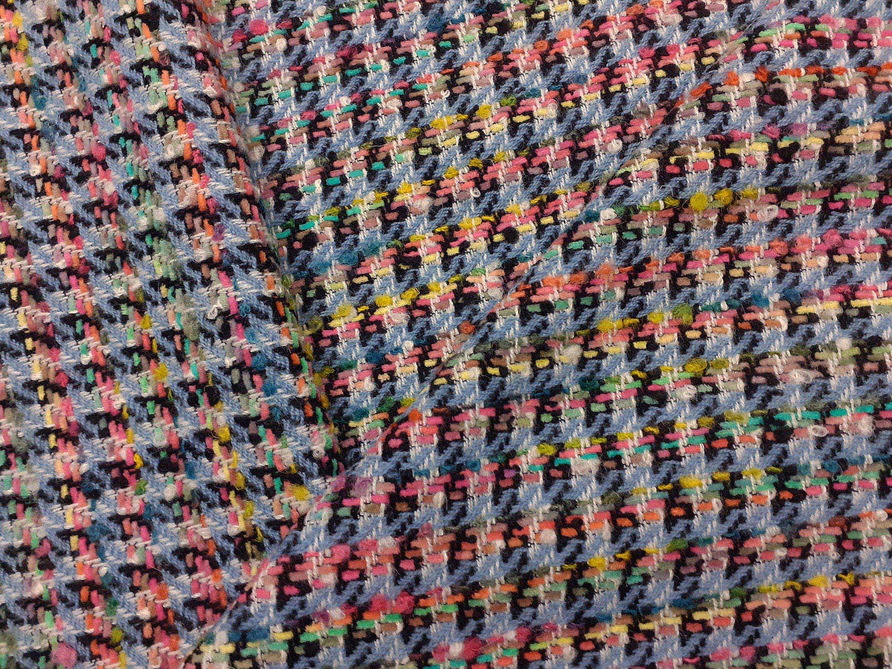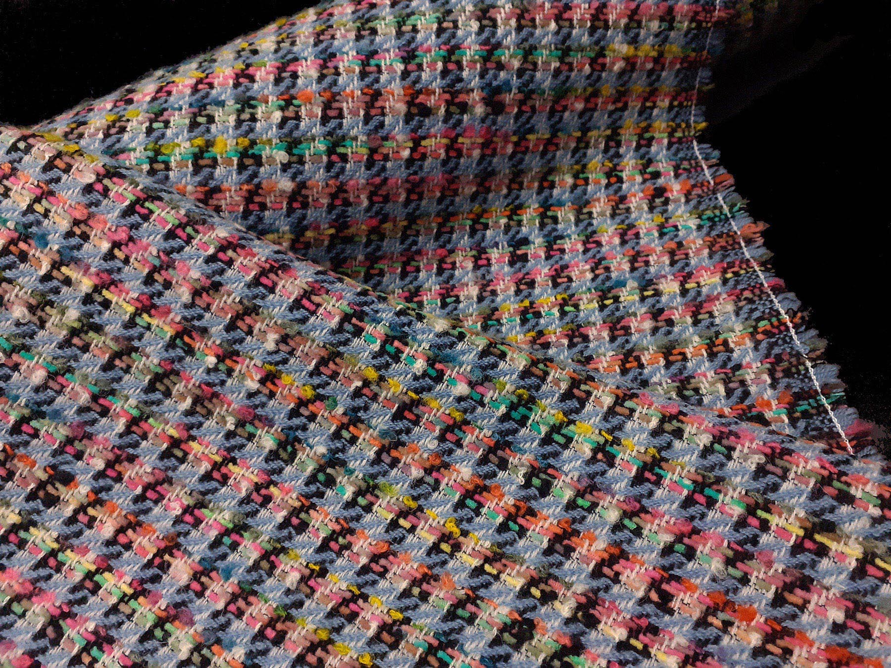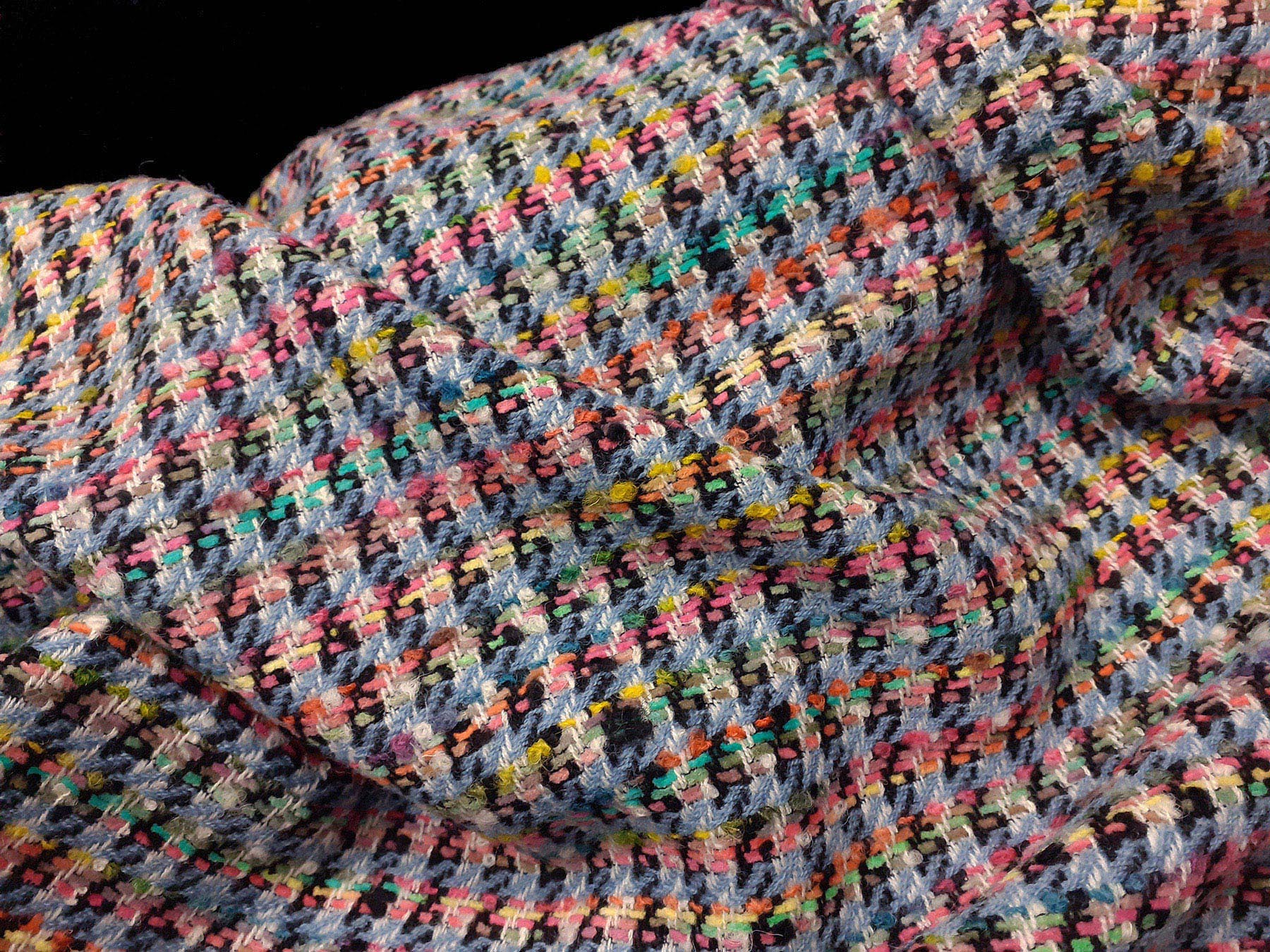 In questo tessuto Chanel – con armatura a stuoia – gli effetti di filatura sono intrecciati con filati pettinati. La mano è morbida e corposa, ideale per la realizzazione di capispalla, abiti e gonne.