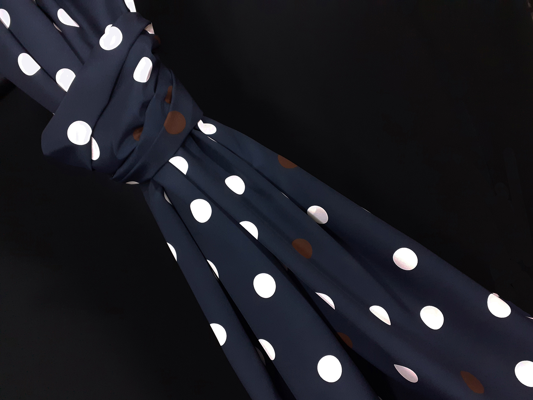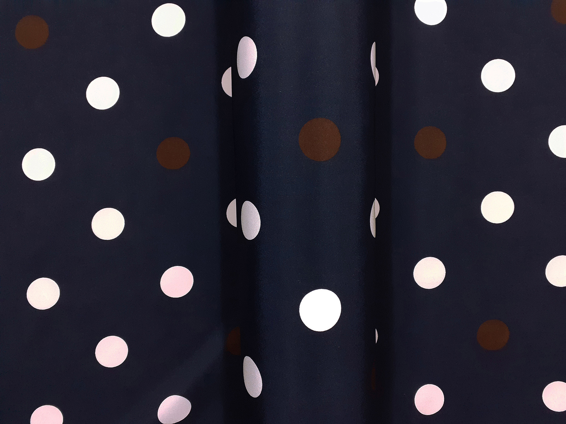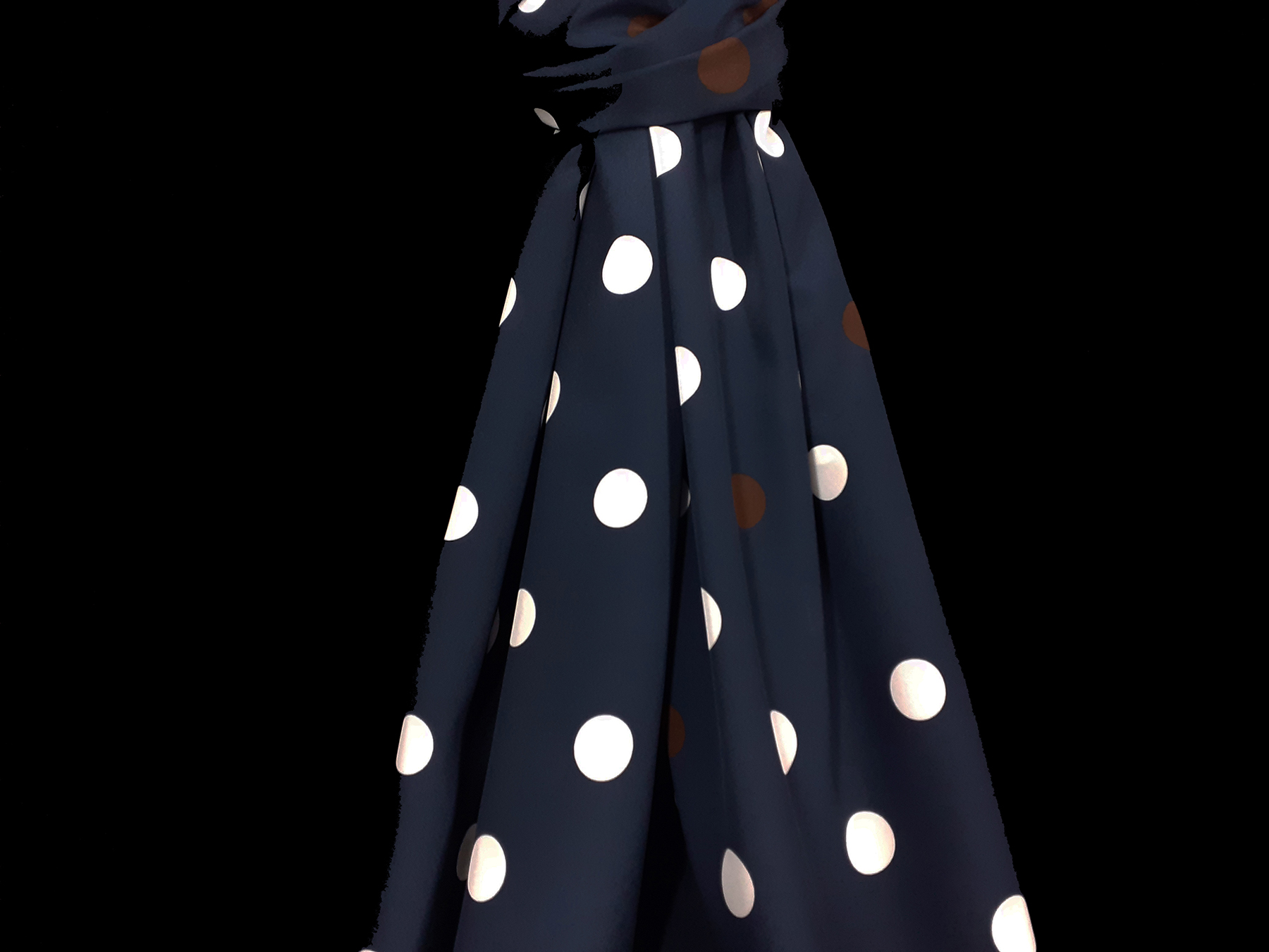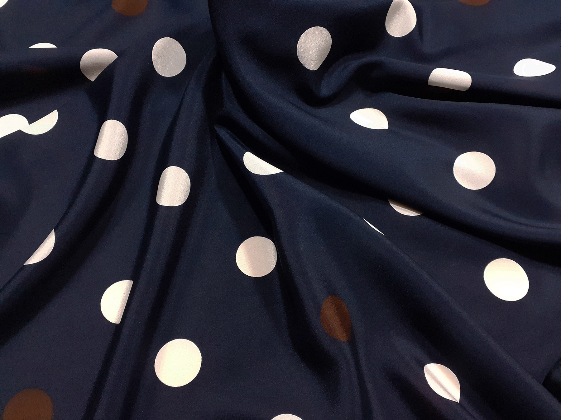 Crepe de Chine in seta fantasia pois marron su fondo blu