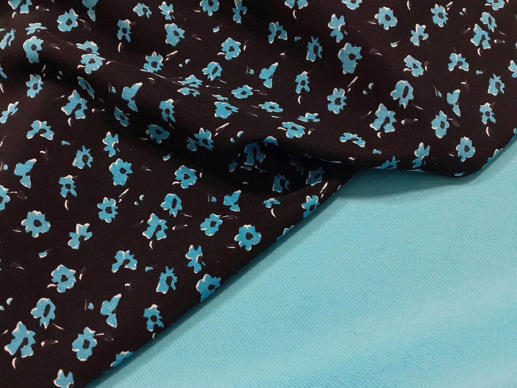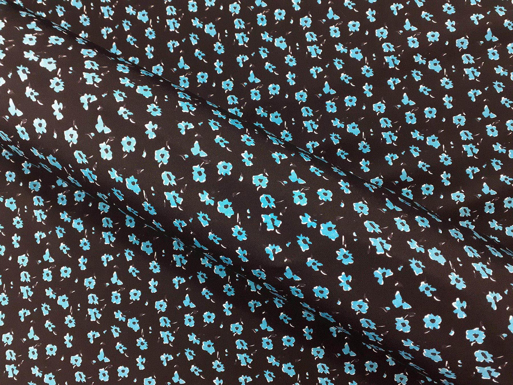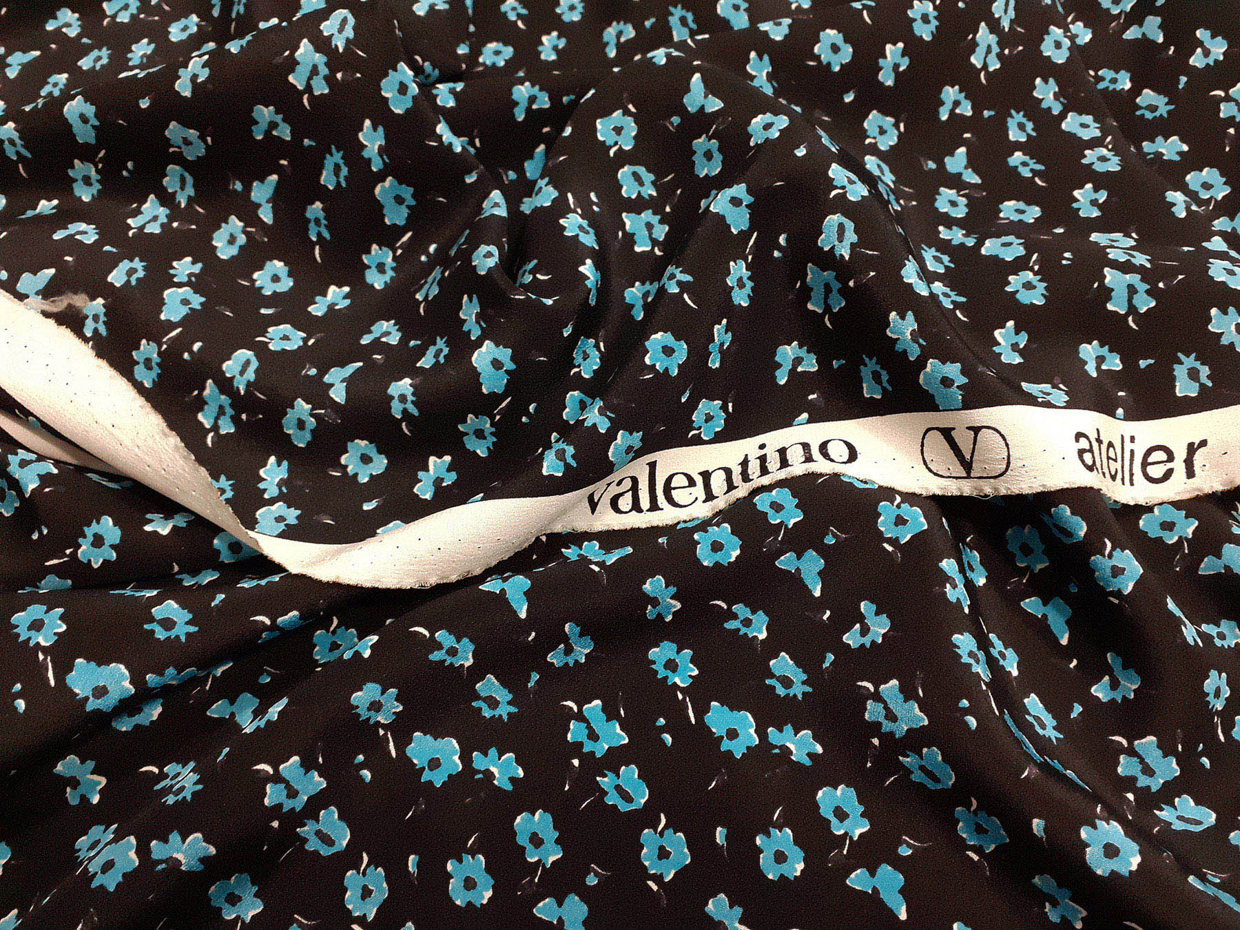 Crepe de Chine in seta fantasia floreale turchese su fondo nero. Valentino Atelier