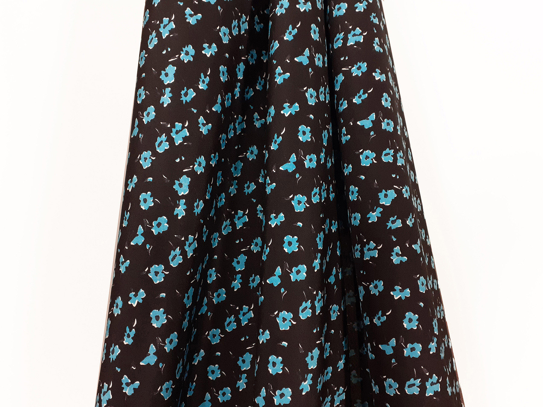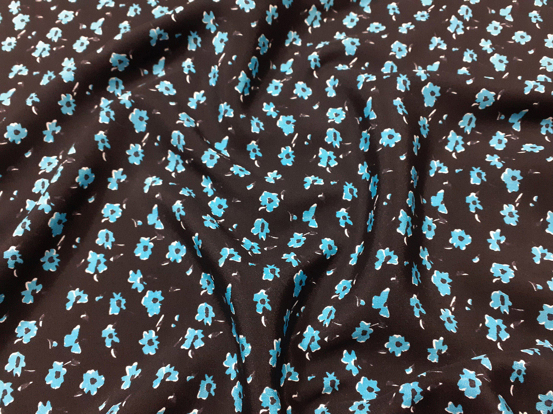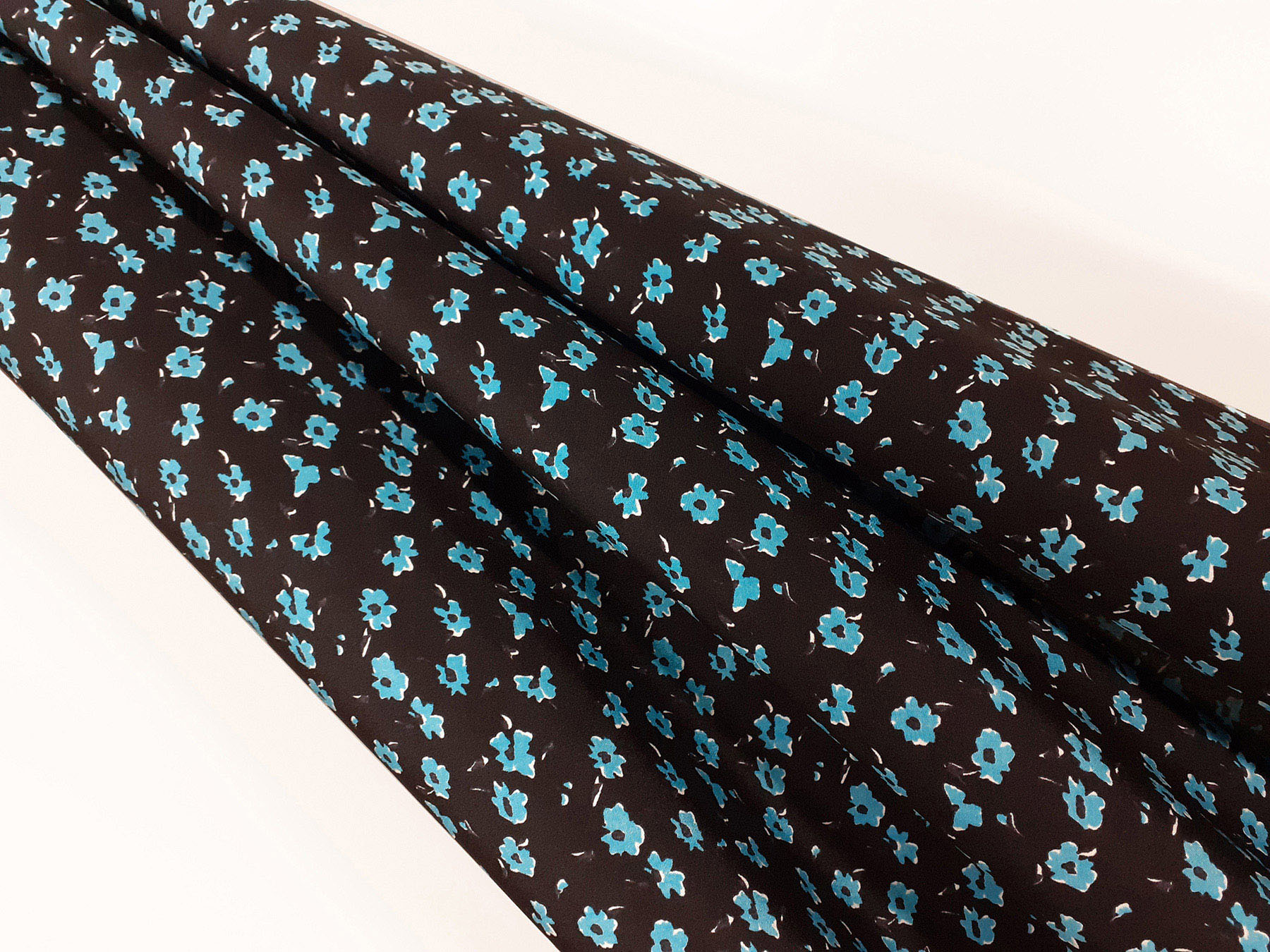 Crepe de Chine in seta fantasia floreale turchese su fondo nero. Valentino Atelier