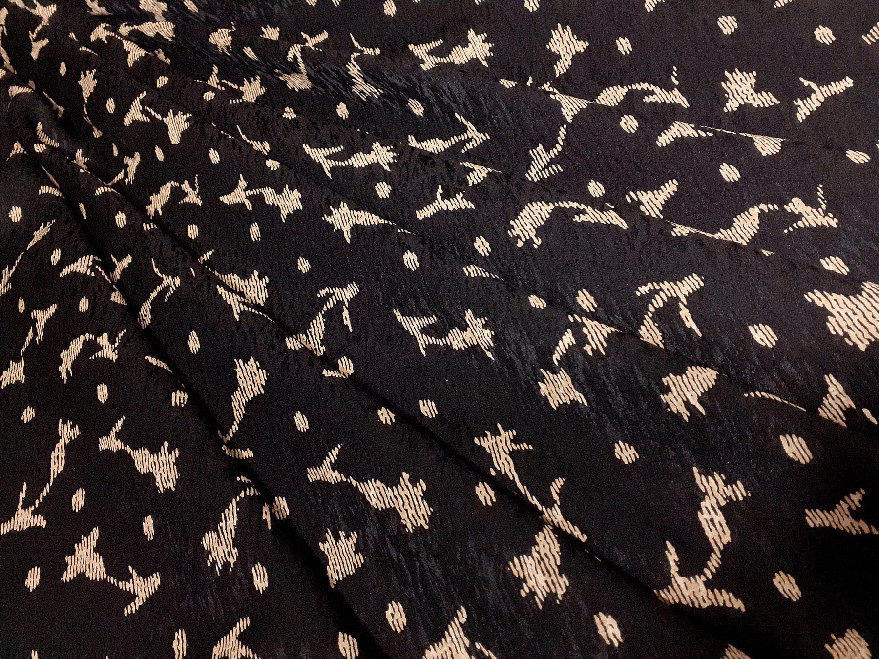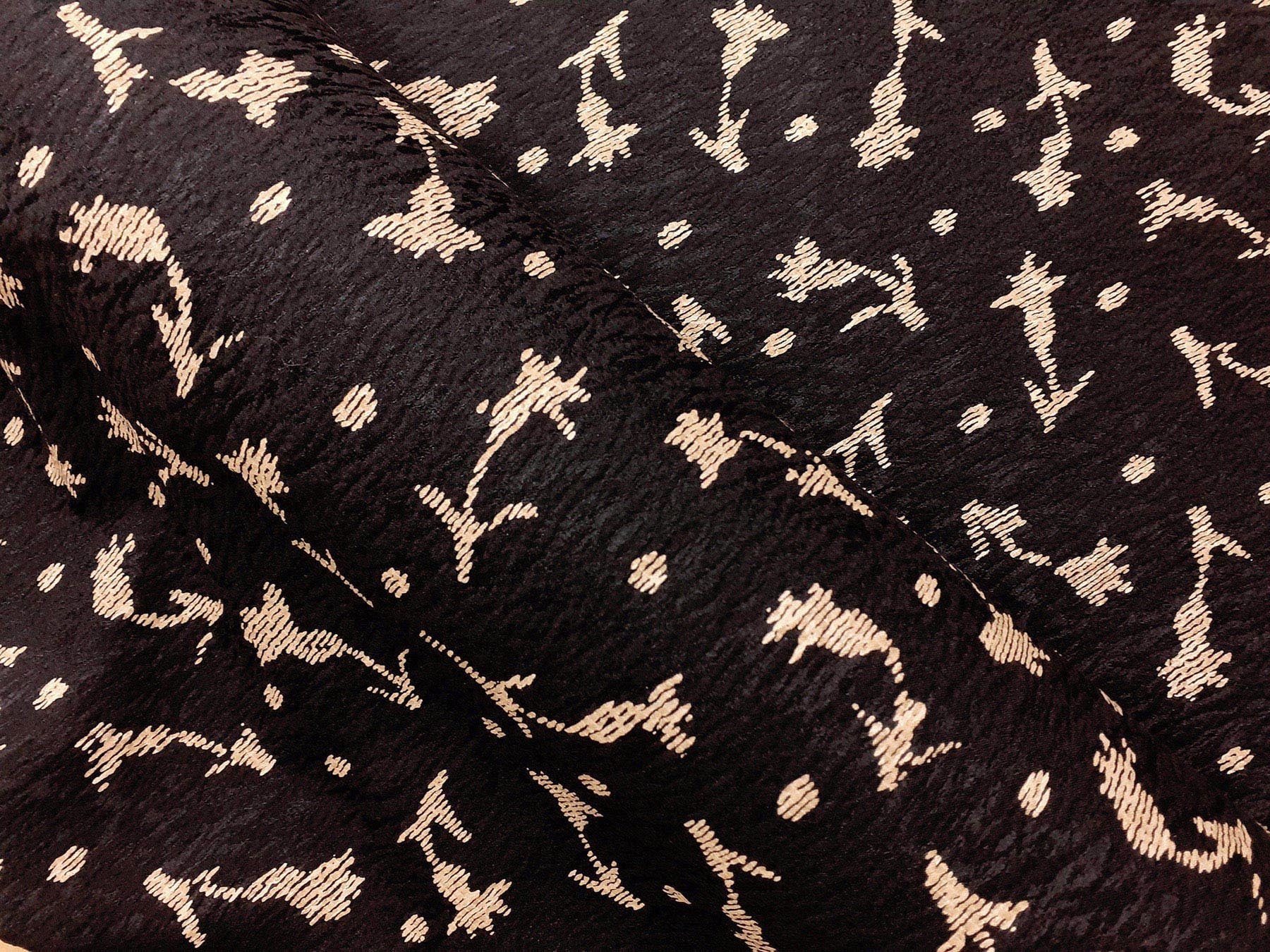 In questo tessuto di seta pura, prodotto a Como, la lavorazione jacquard con il contrasto fra lucido e opaco, crea un piacevole effetto di tridimensionalità. Perfetto per la realizzazione di abiti ampi e sinuosi, grazie alla sua morbidezza e caduta, può essere utilizzato anche per capi più lineari che mettono in evidenza la ricchezza e la particolarità di questo tipo di tessuto.