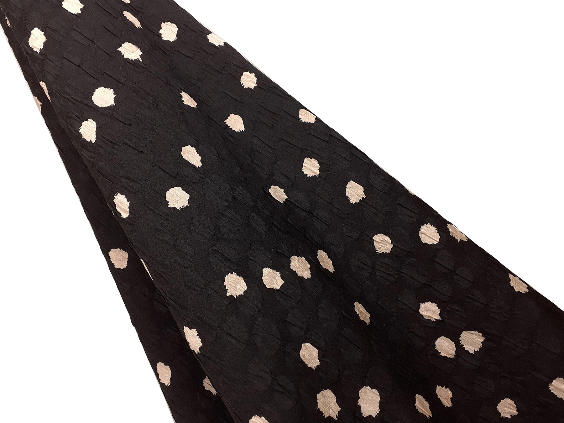 In questo tessuto di seta pura, prodotto a Como, la lavorazione jacquard con il contrasto fra lucido e opaco, crea un piacevole effetto di tridimensionalità. Perfetto per la realizzazione di abiti ampi e sinuosi, grazie alla sua morbidezza e caduta, può essere utilizzato anche per capi più lineari che mettono in evidenza la ricchezza e la particolarità di questo tipo di tessuto.