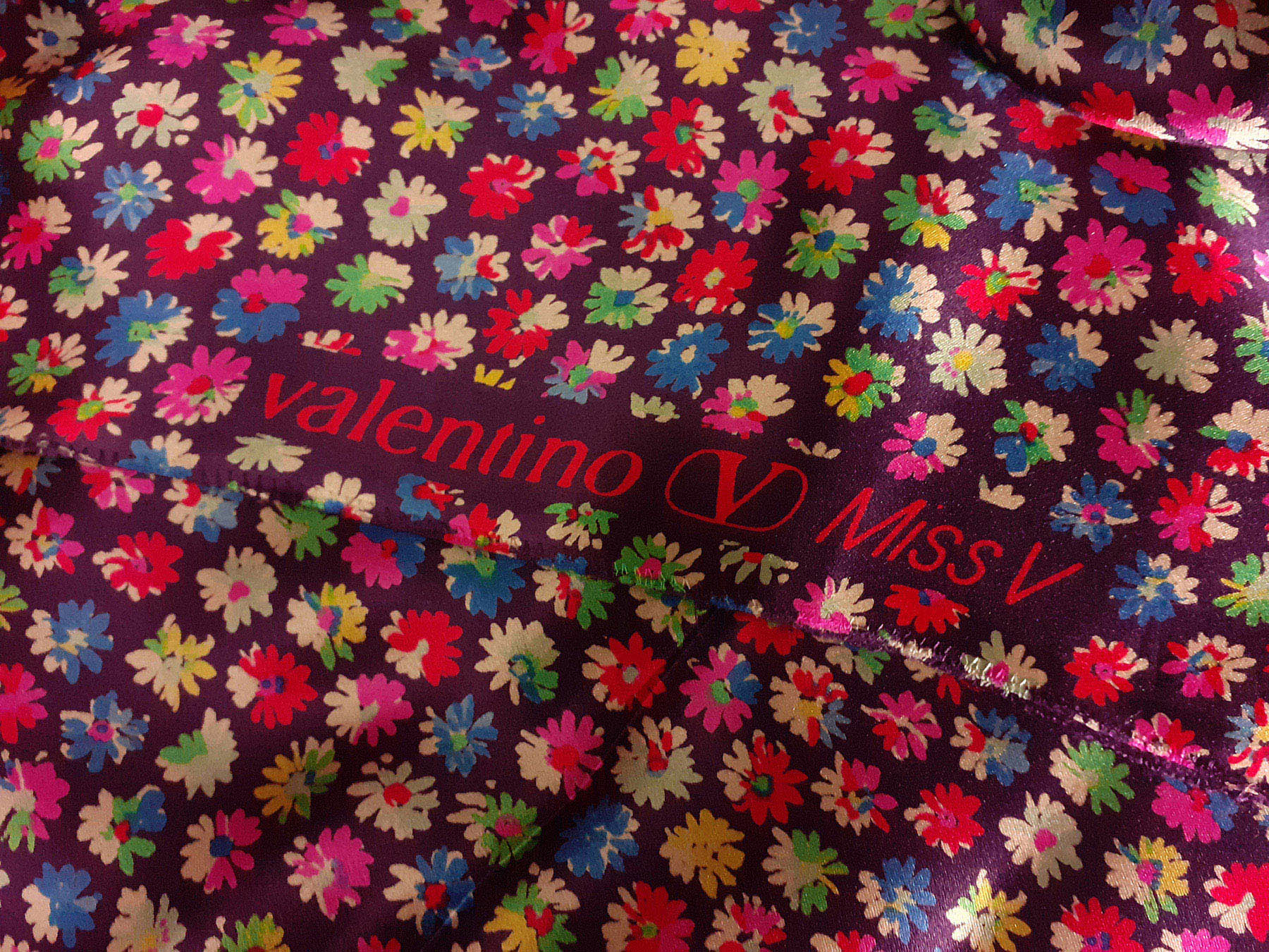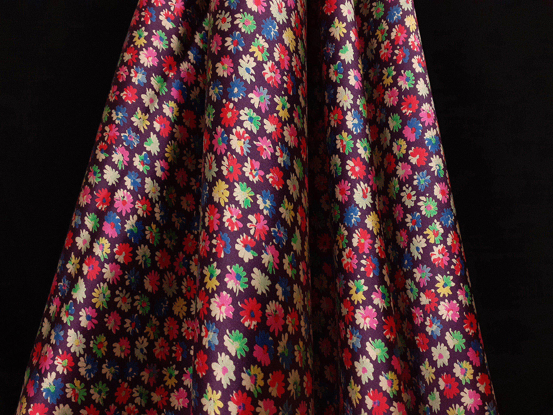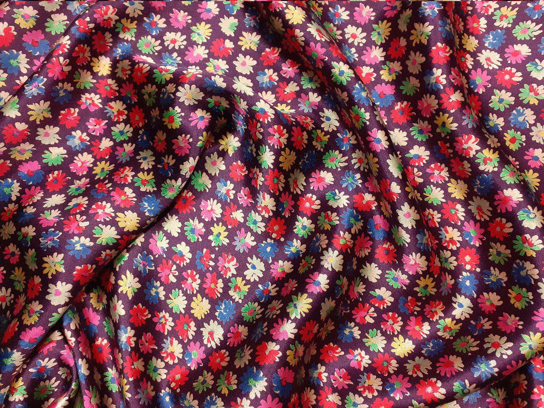 Raso di seta fantasia floreale su fondo viola melanzana. Valentino Miss V