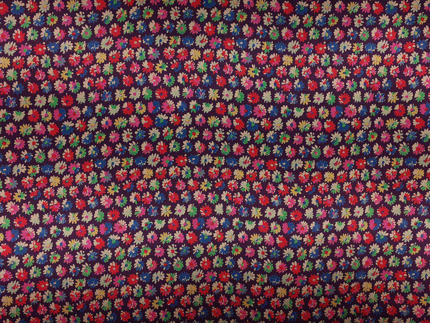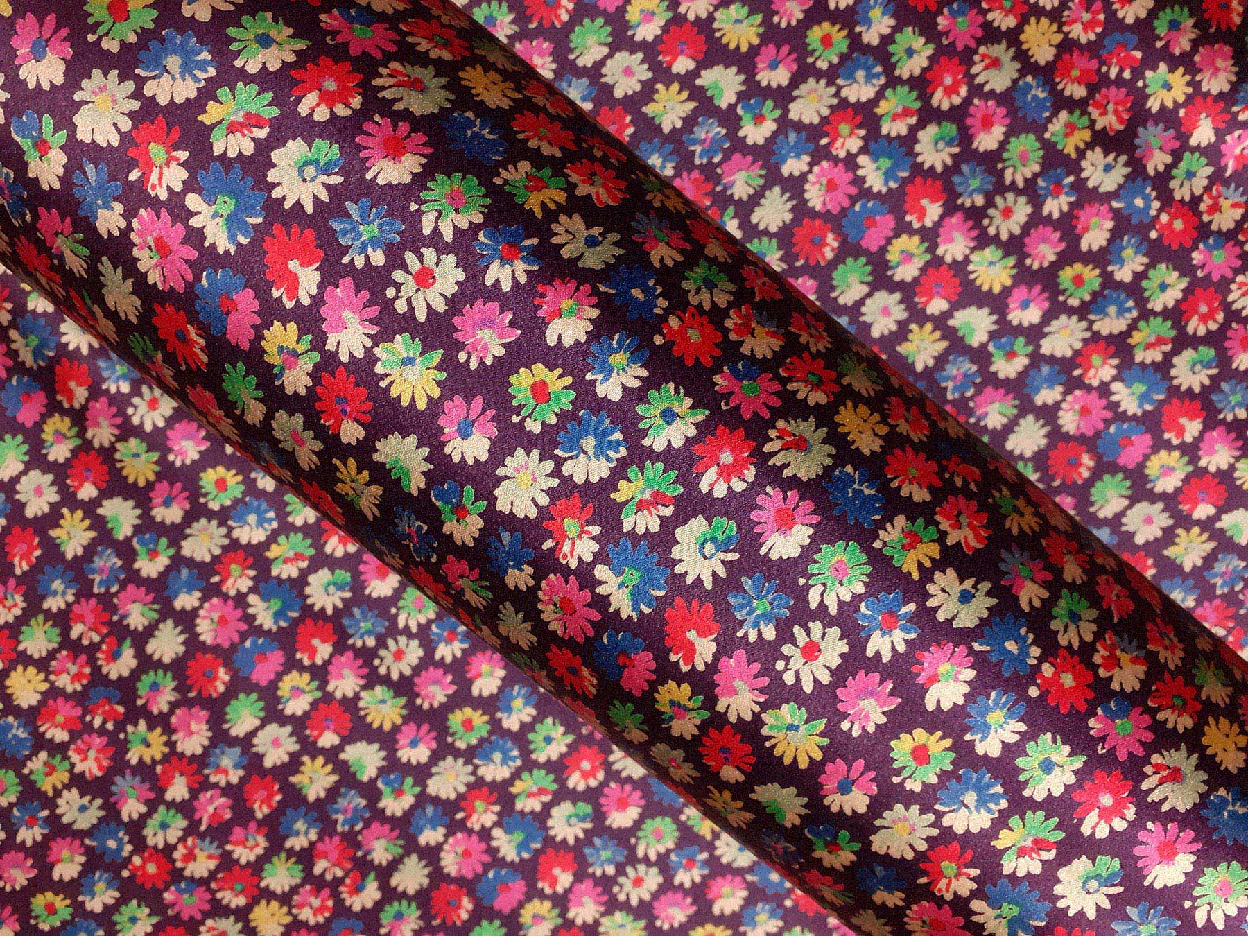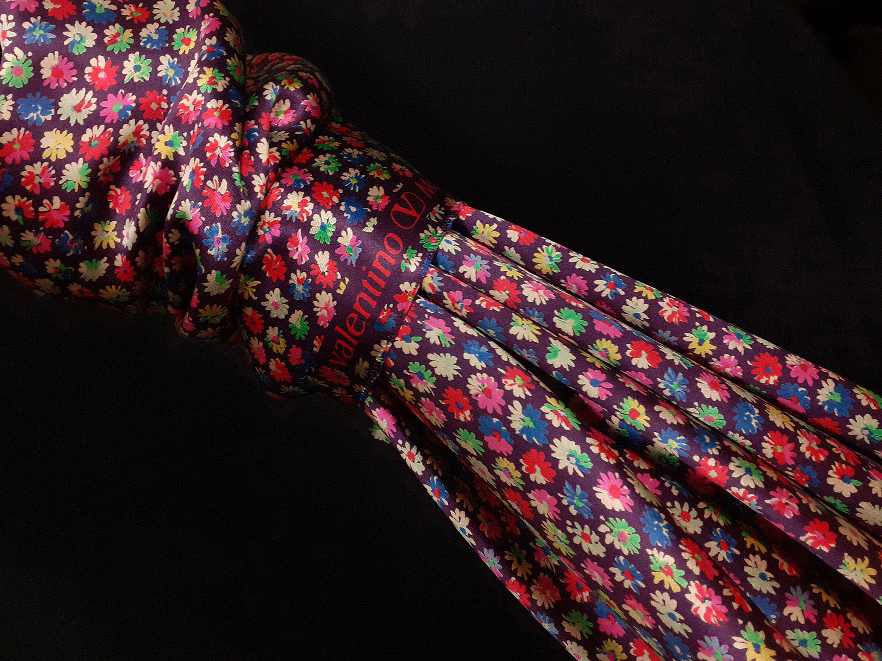 Raso di seta fantasia floreale su fondo viola melanzana. Valentino Miss V