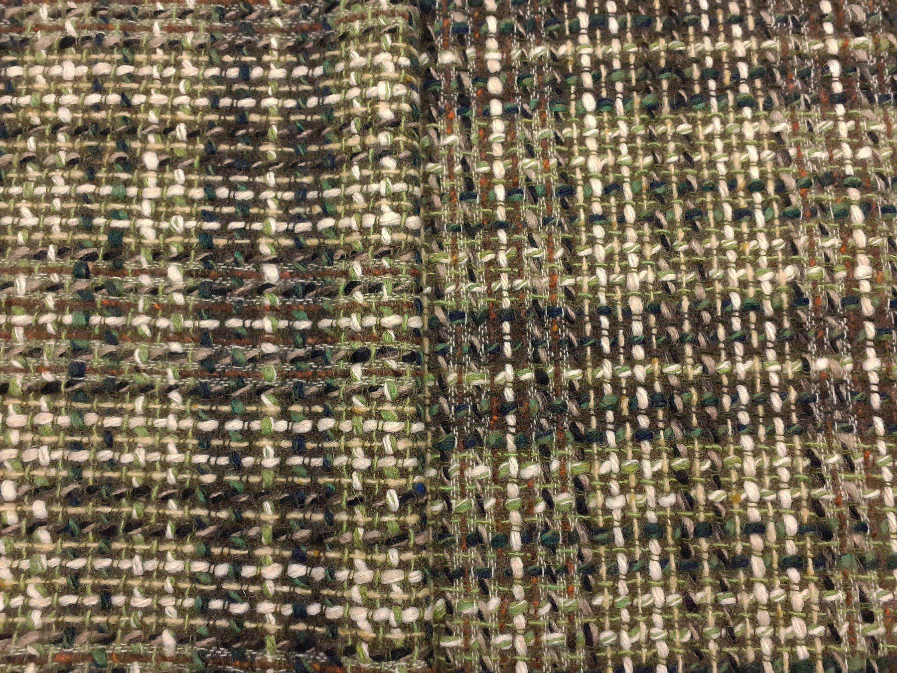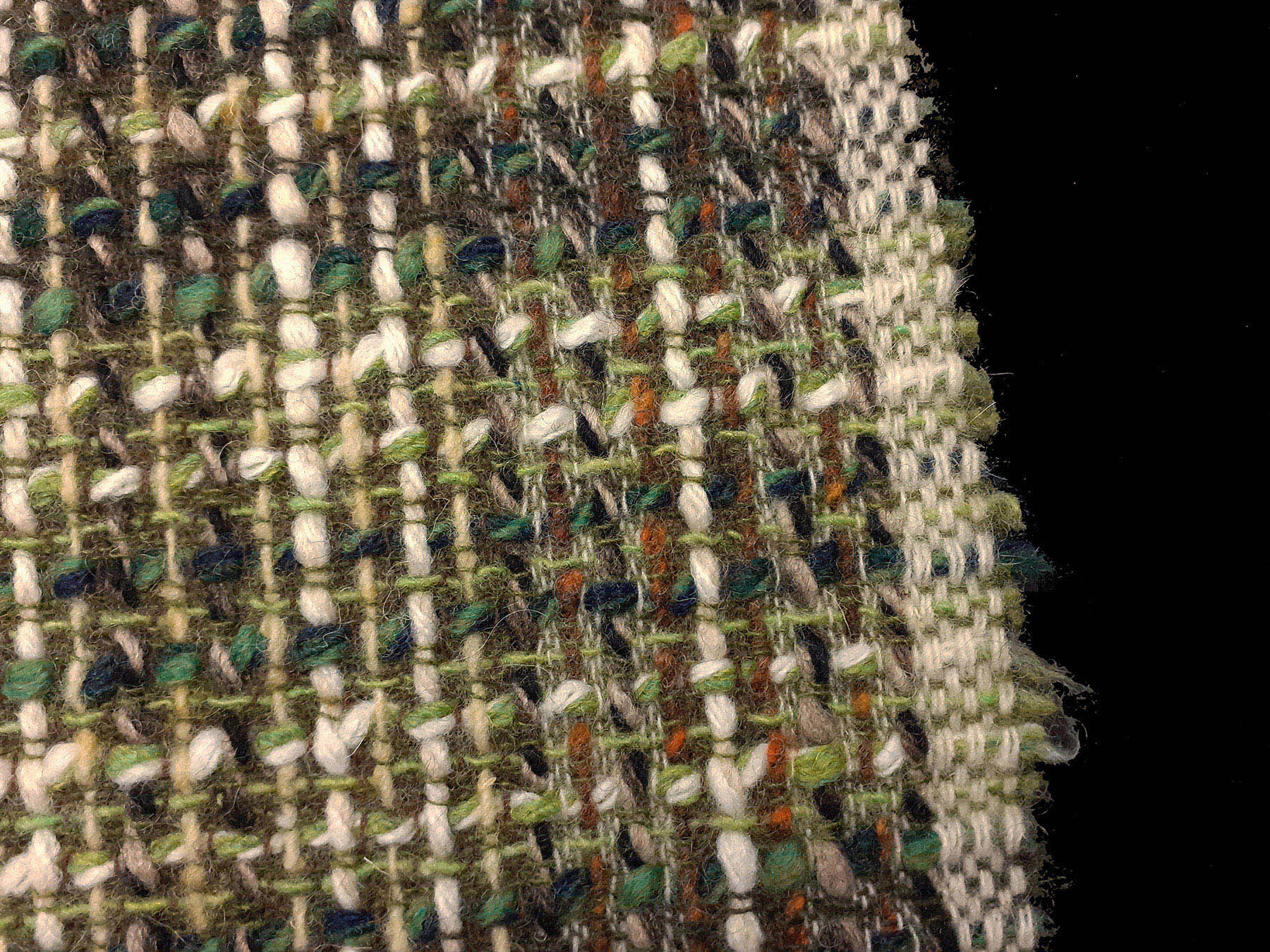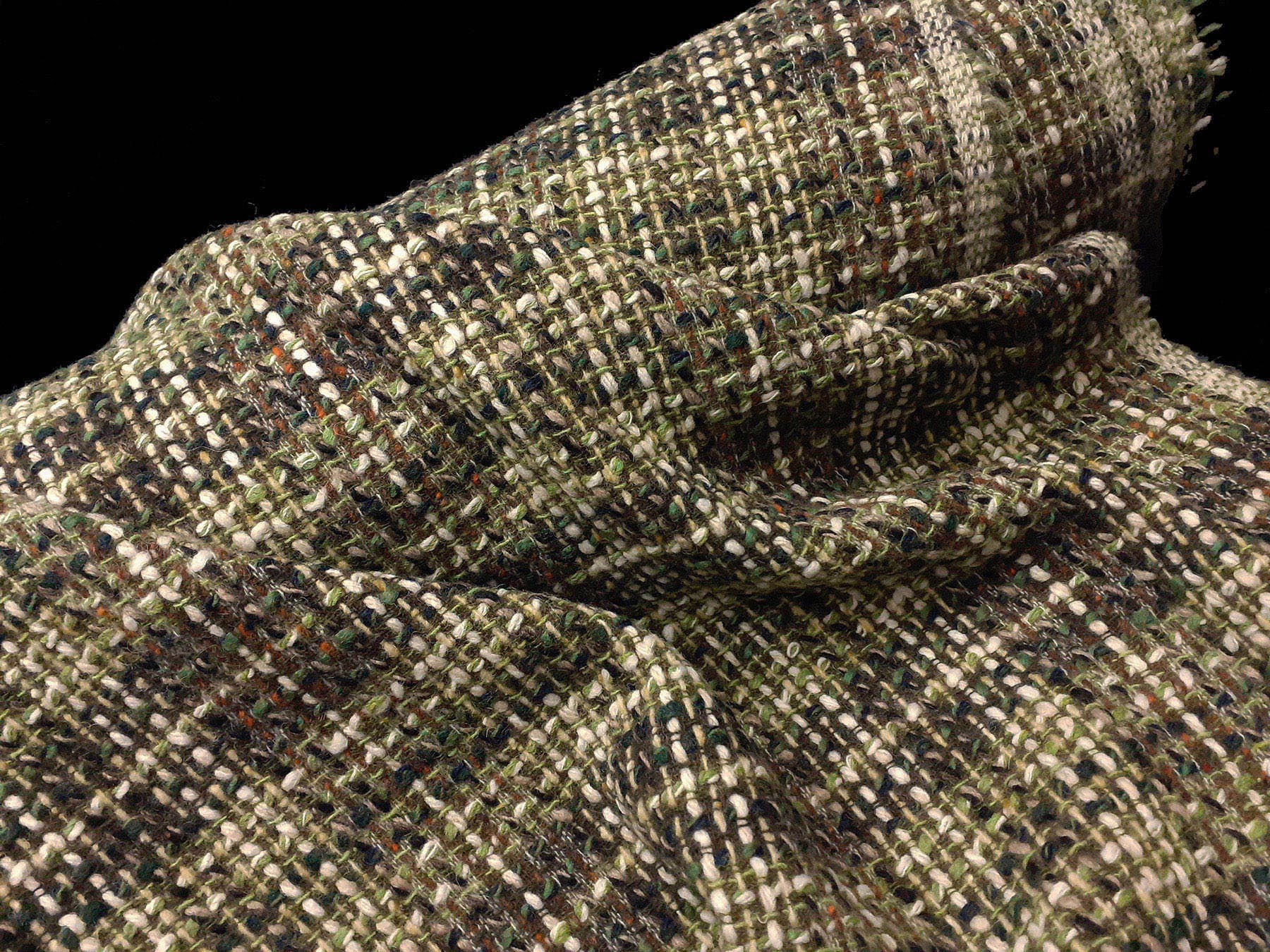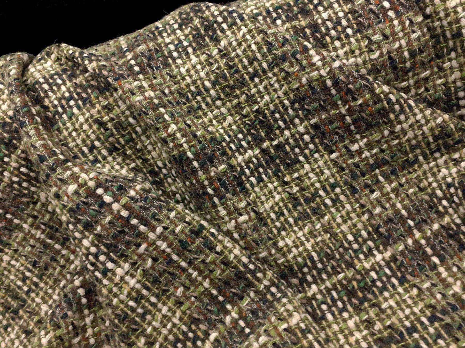 In questo tessuto Chanel – con armatura a stuoia – gli effetti di filatura bouclé sono intrecciati con filati pettinati più resistenti. Di peso medioleggero ha mano morbida e corposa, ideale per la realizzazione di capispalla, abiti e gonne.