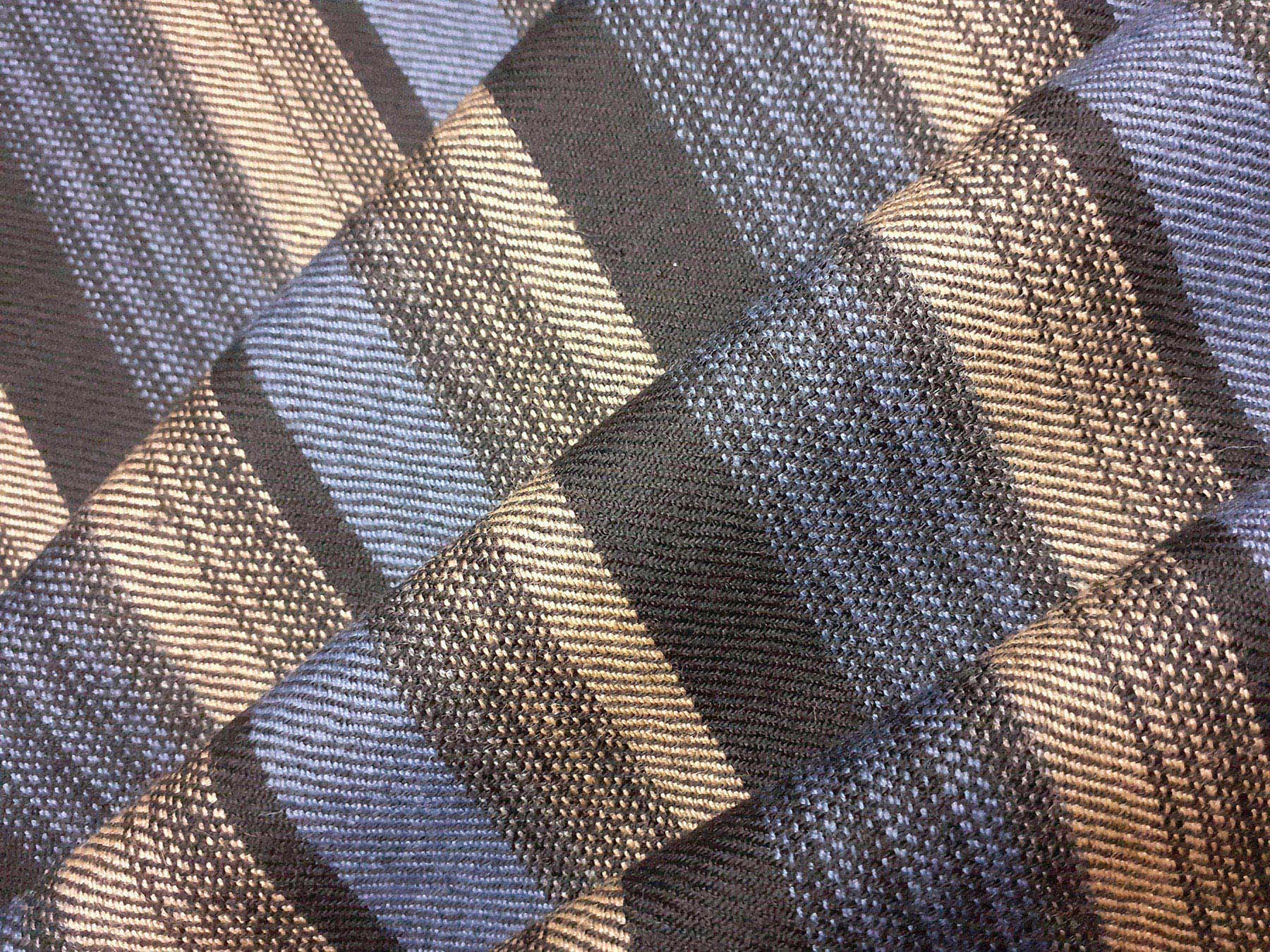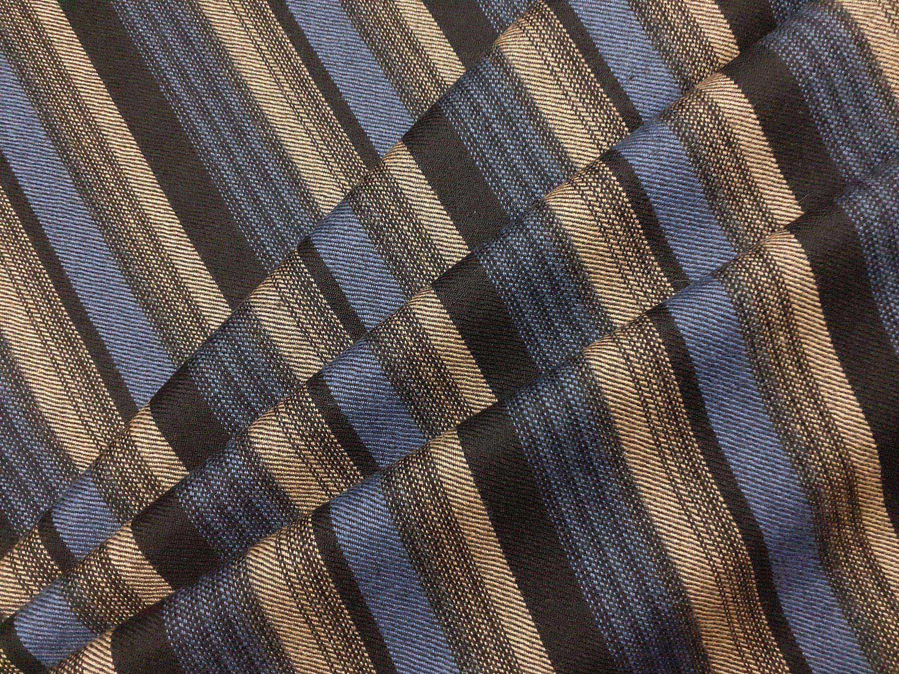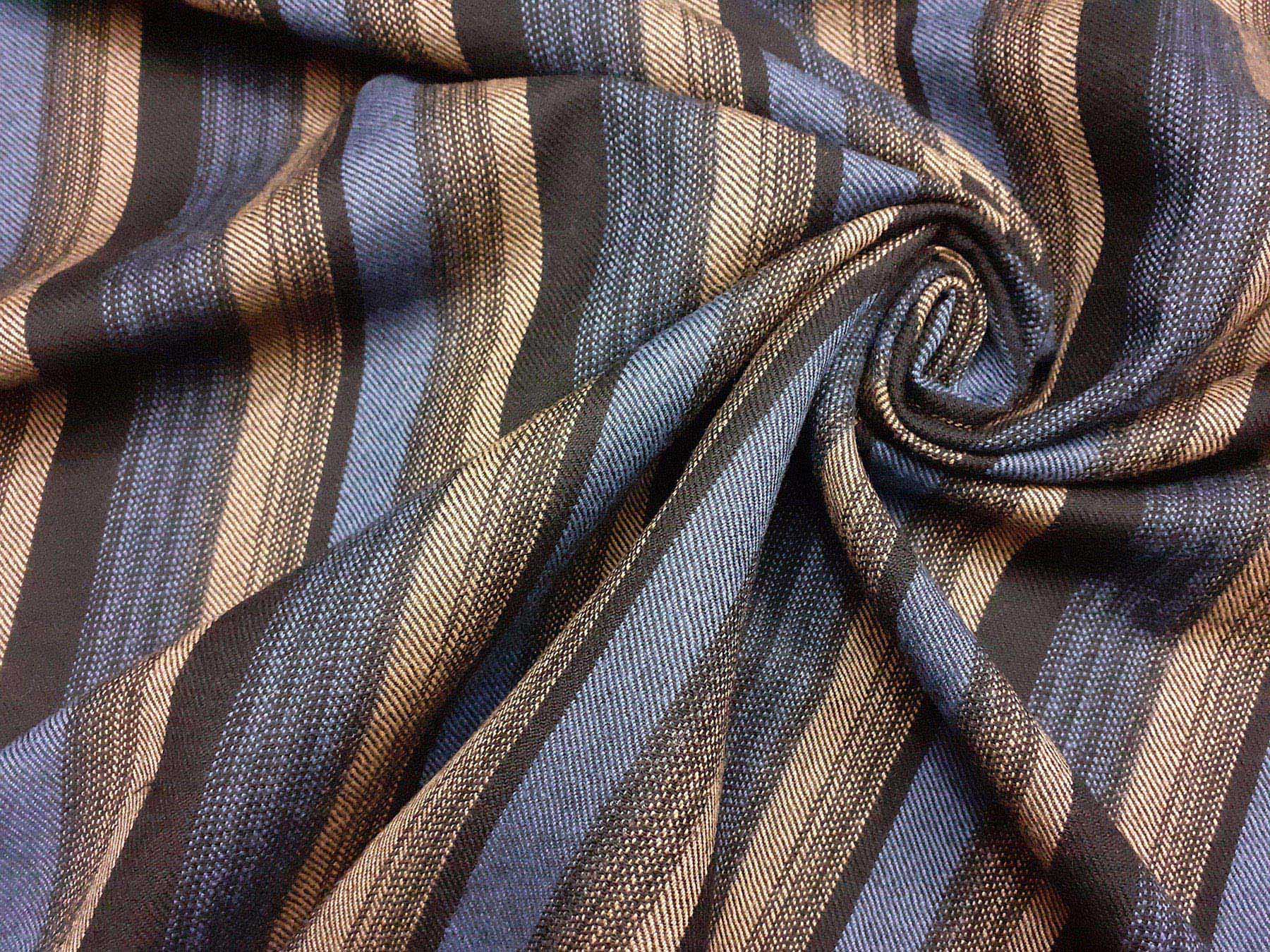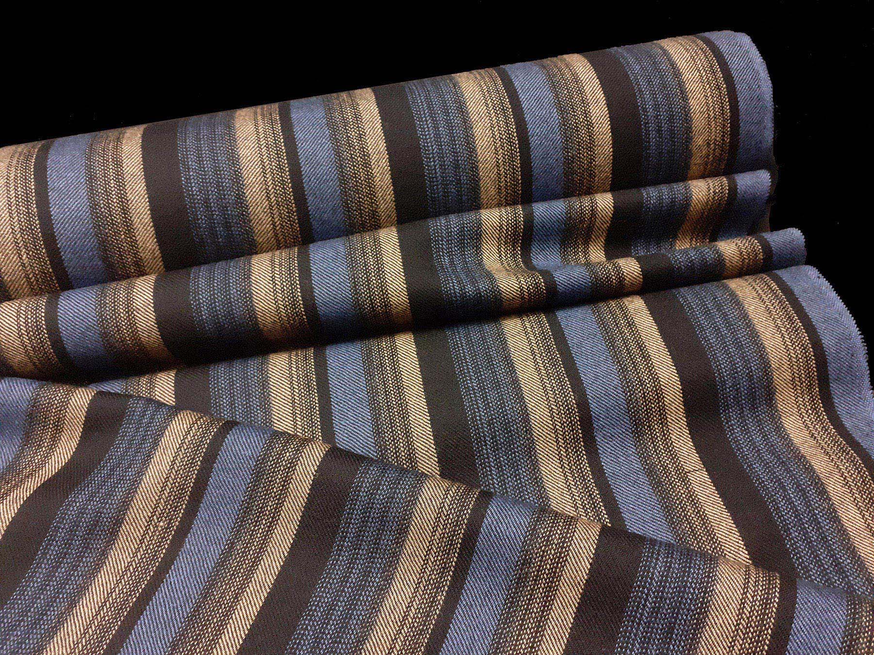 Tessuto in lana merino a righe irregolari azzurro, nero e beige