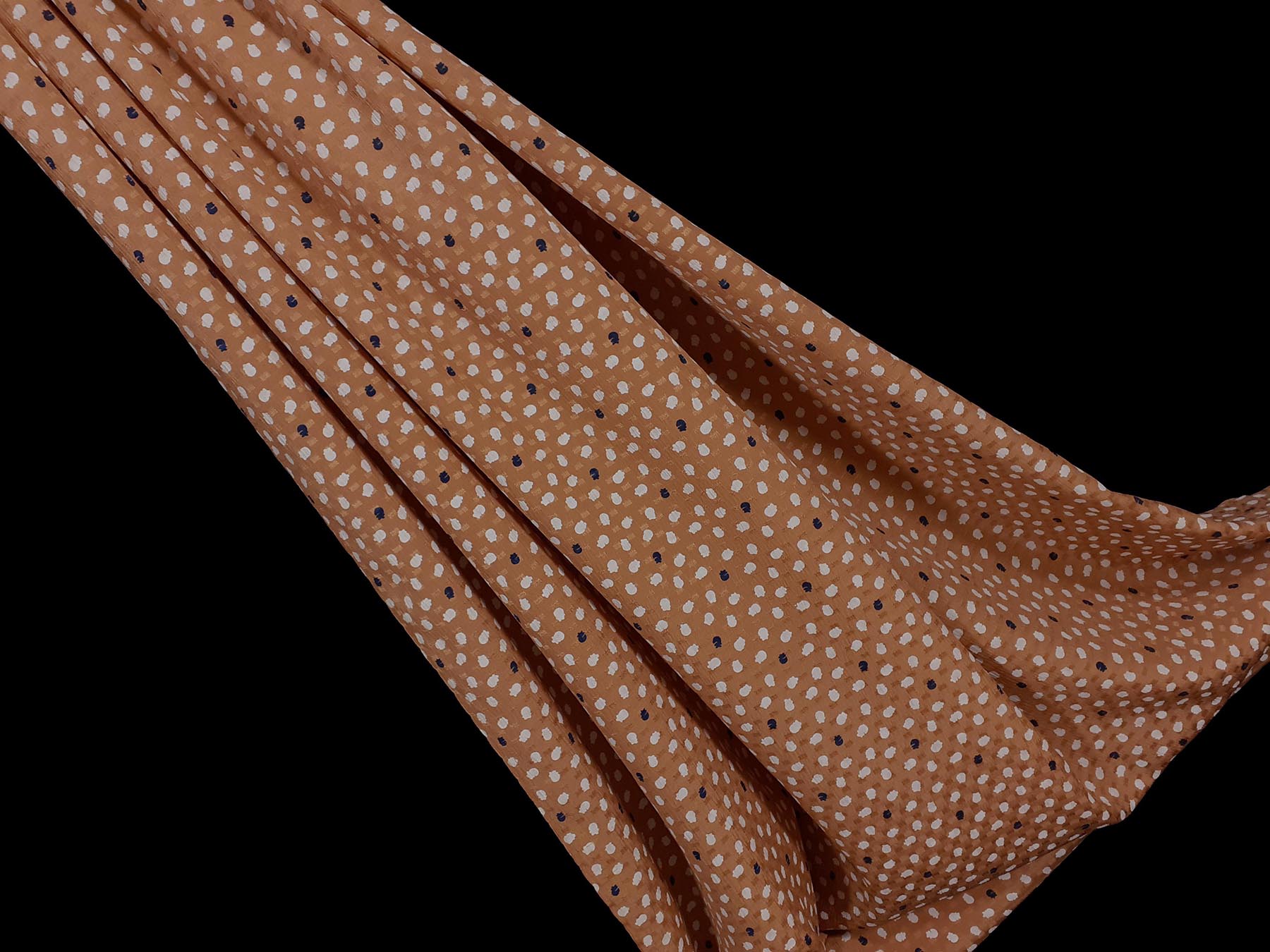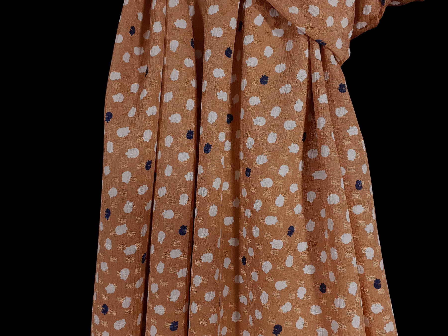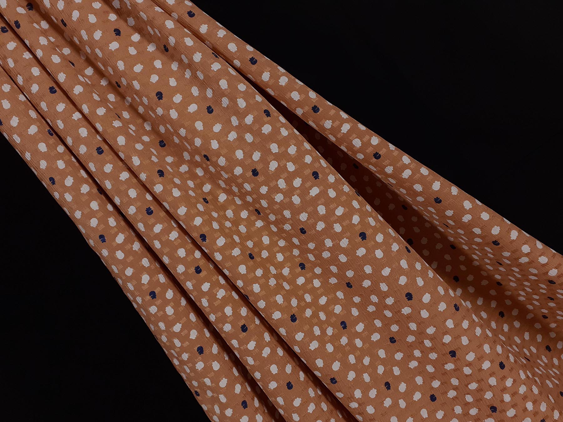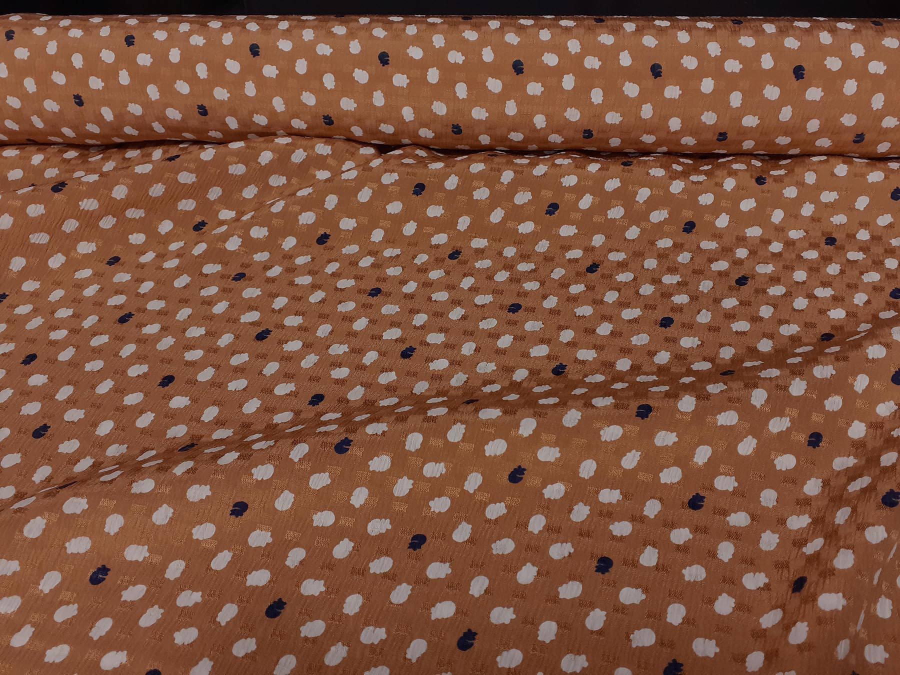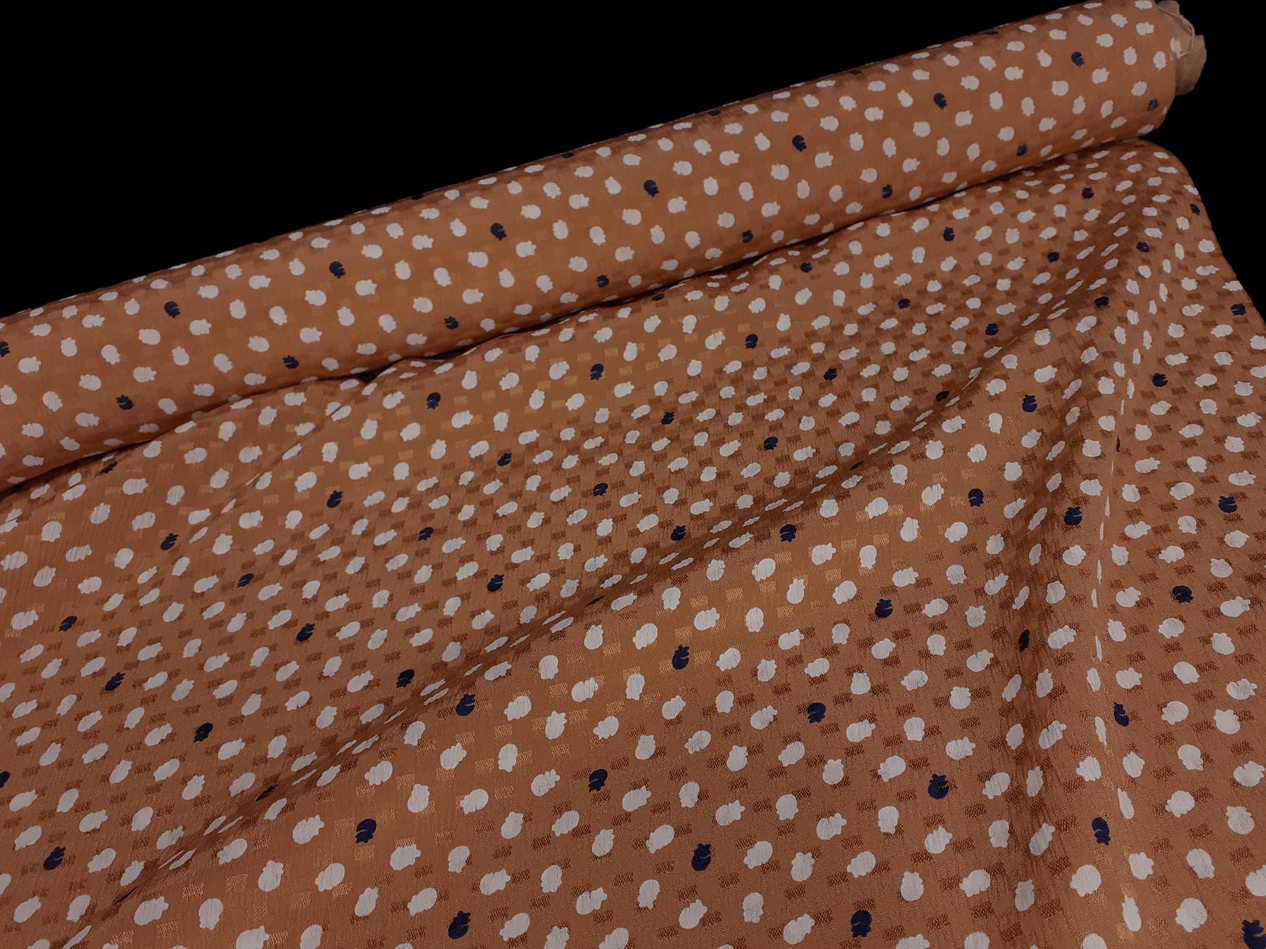 Seta jacquard fondo ocra brillante con pois stilizzati bianchi e neri