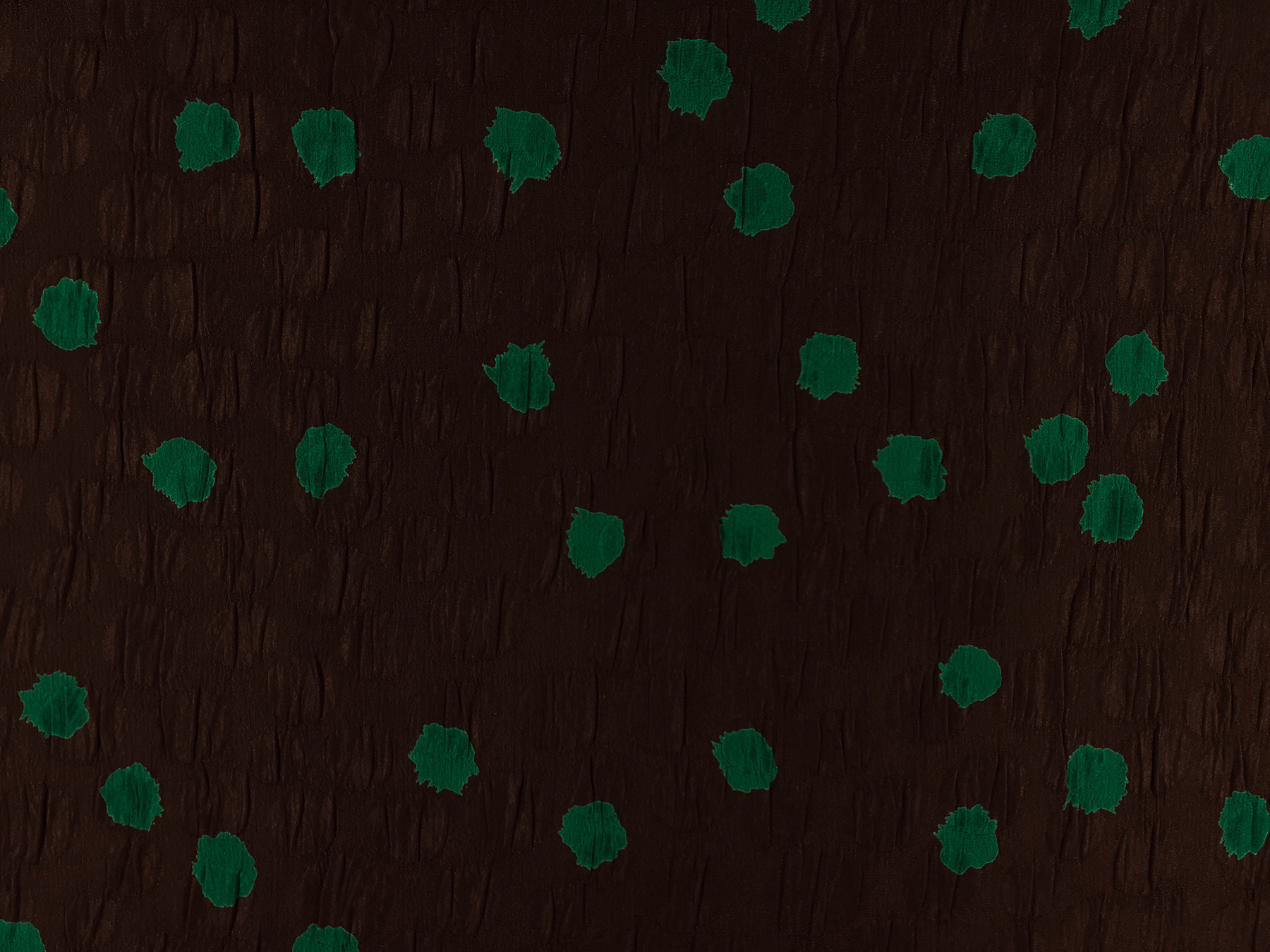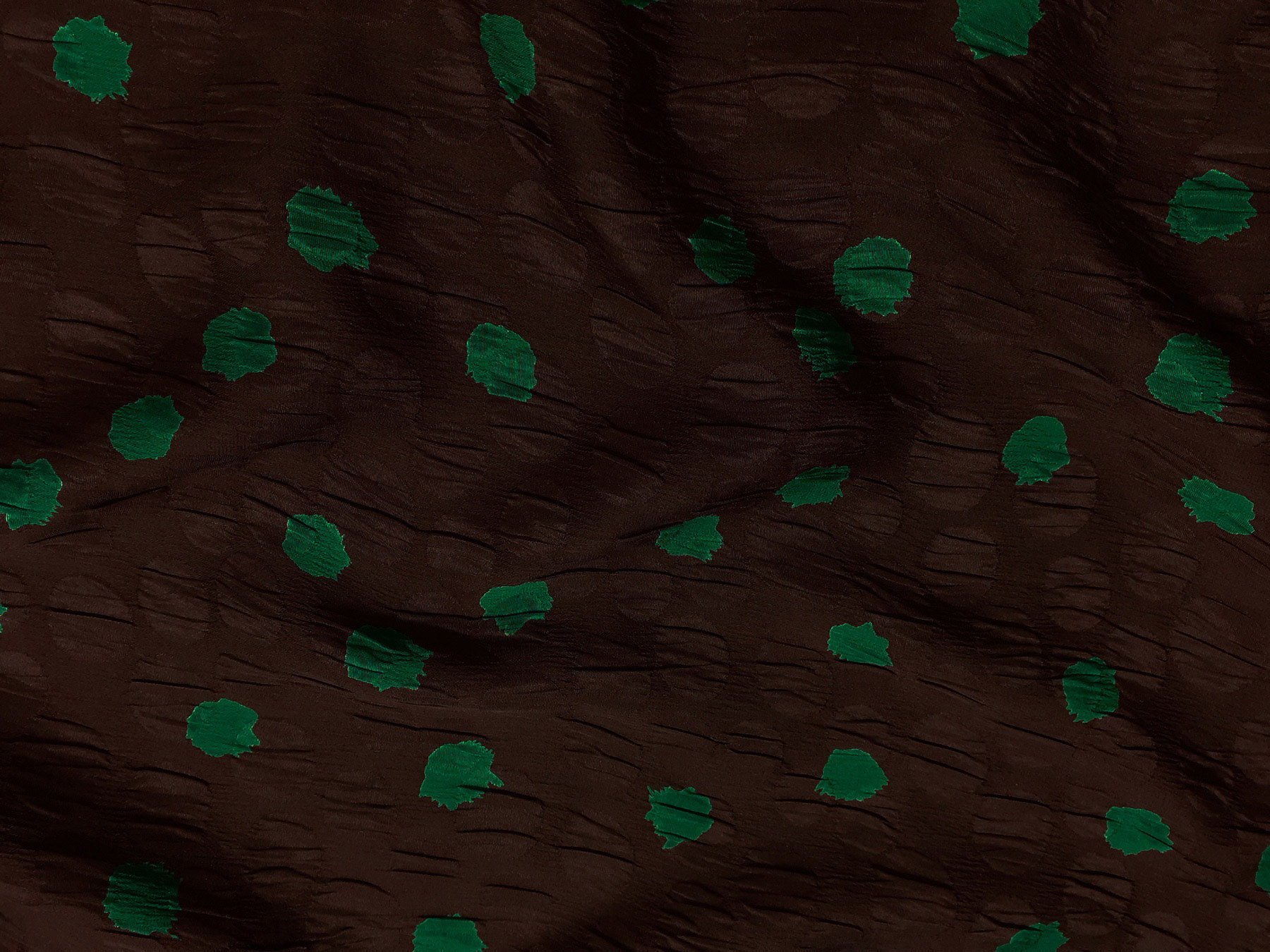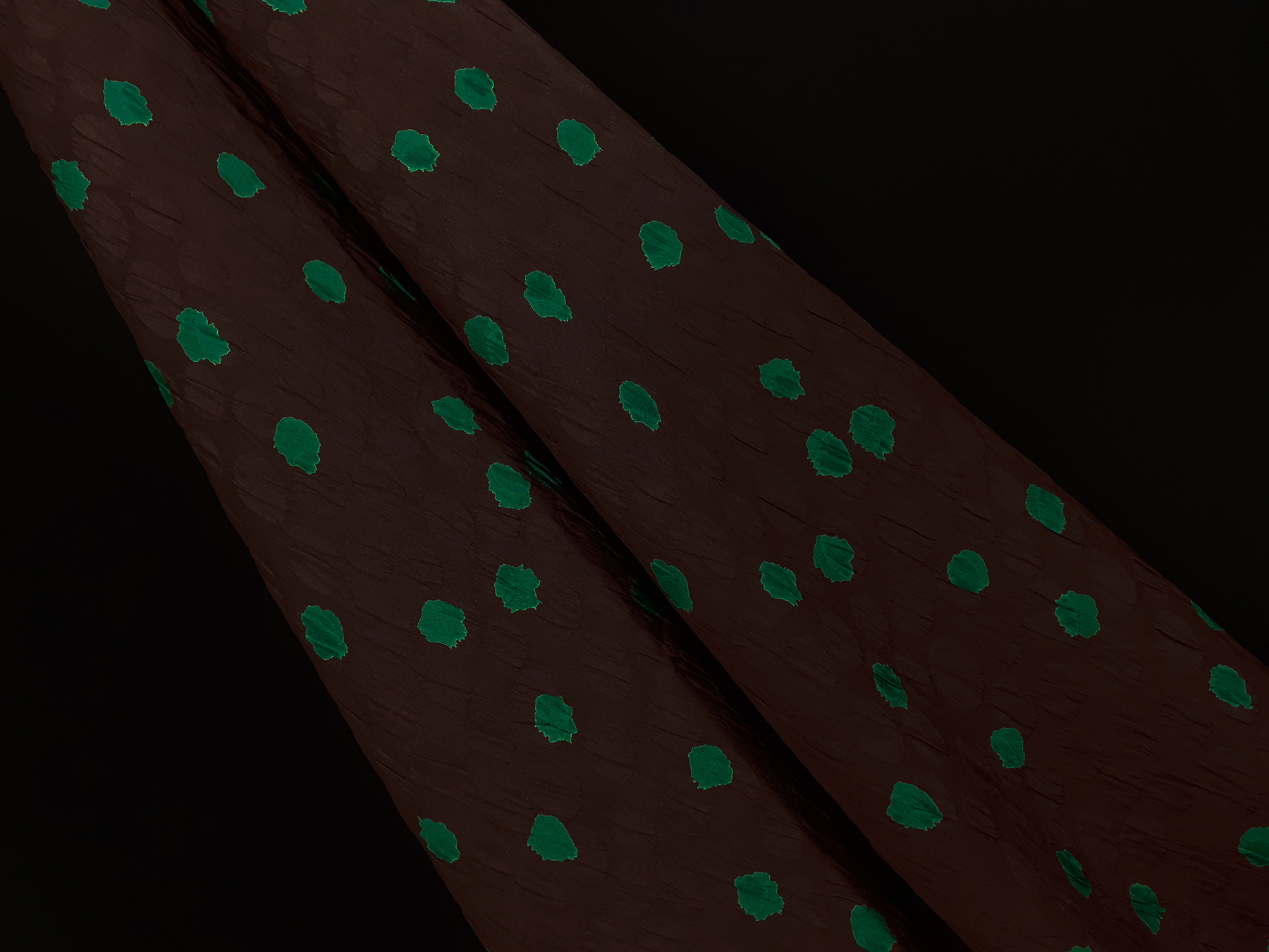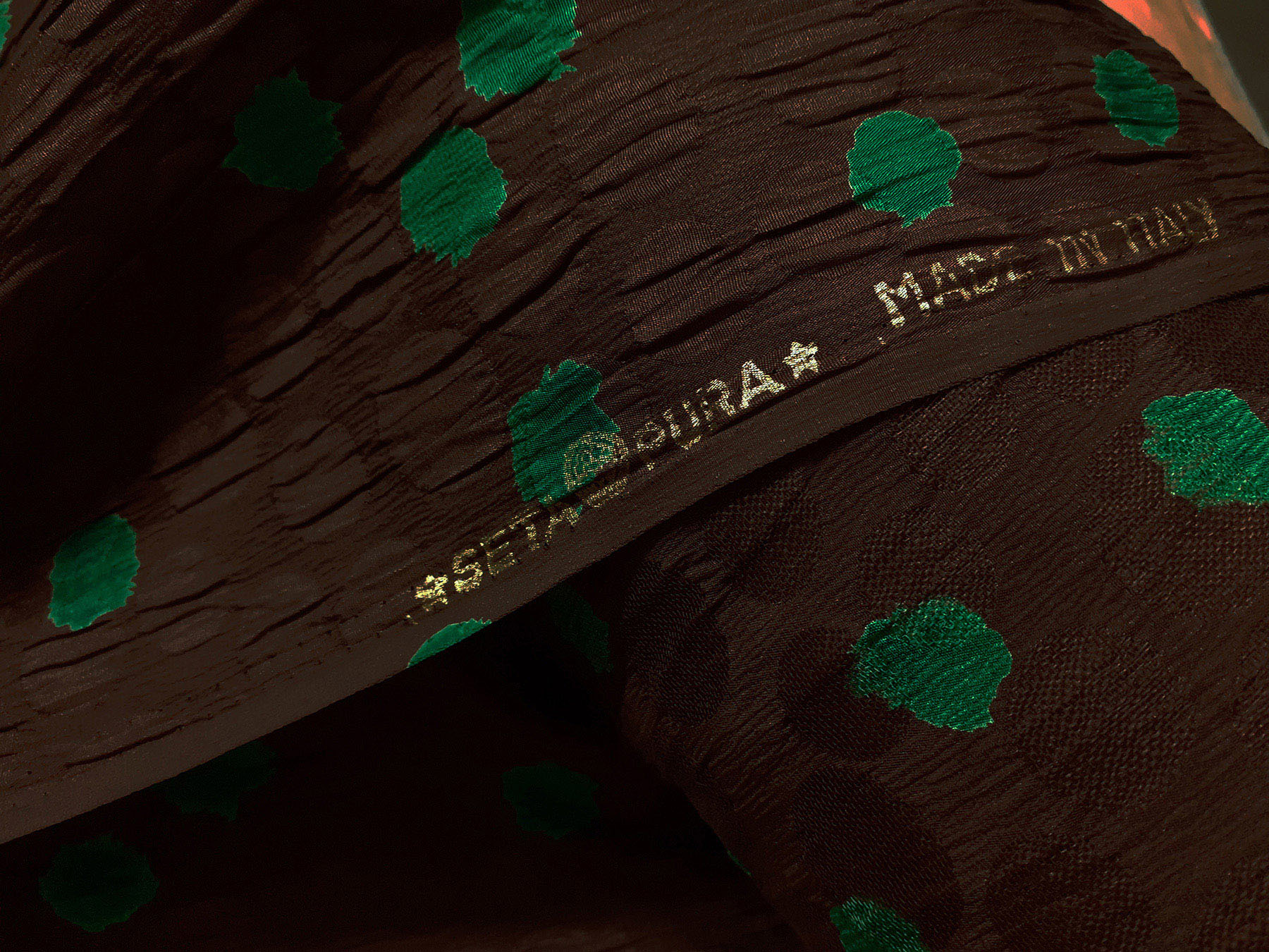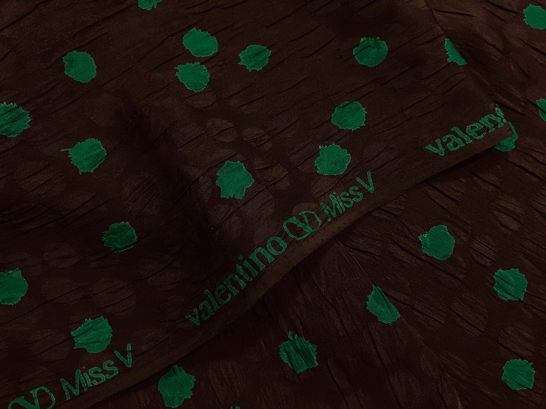 Seta jacquard fantasia astratta verde su fondo marrone rossiccio. Valentino Miss V