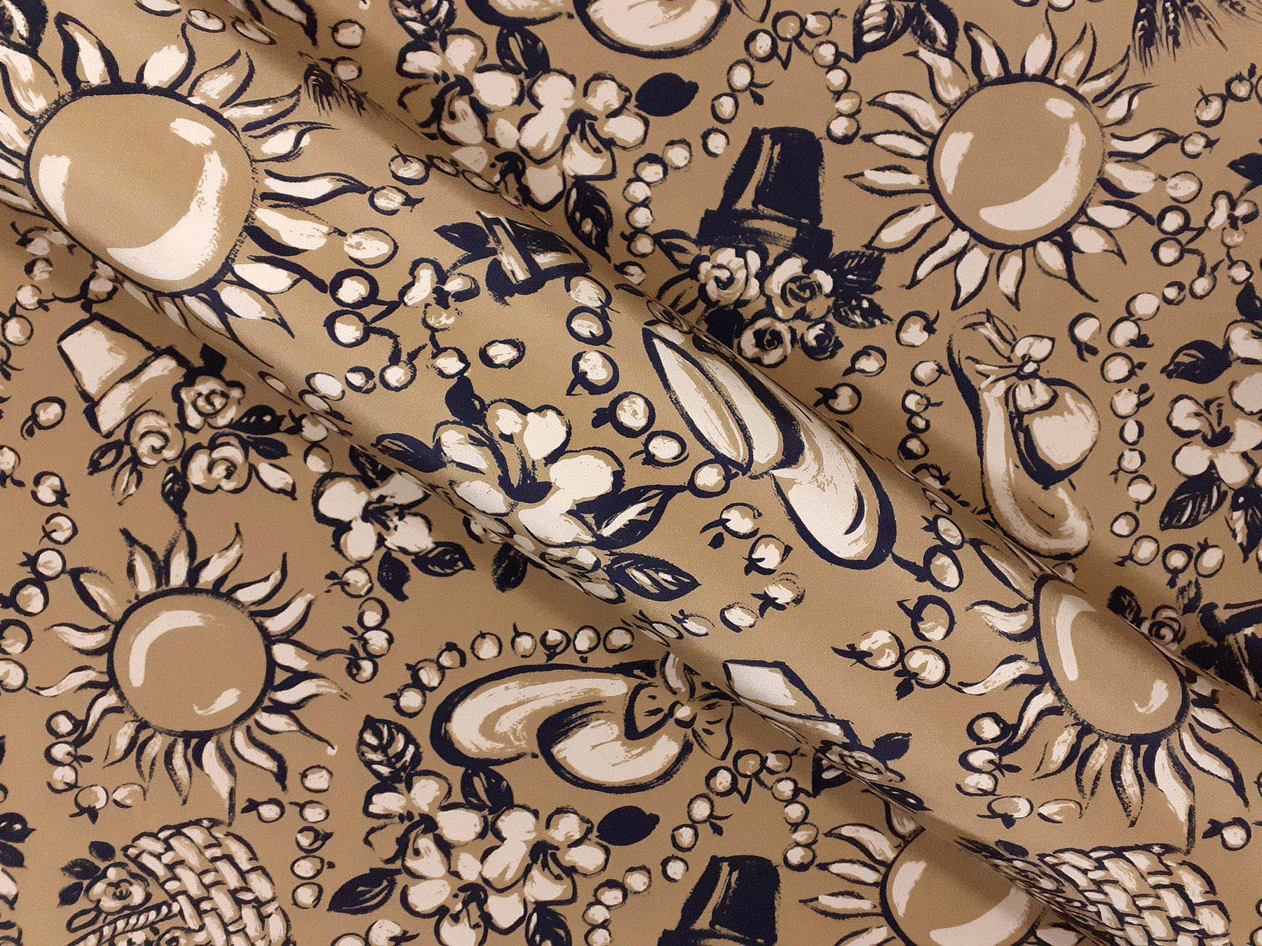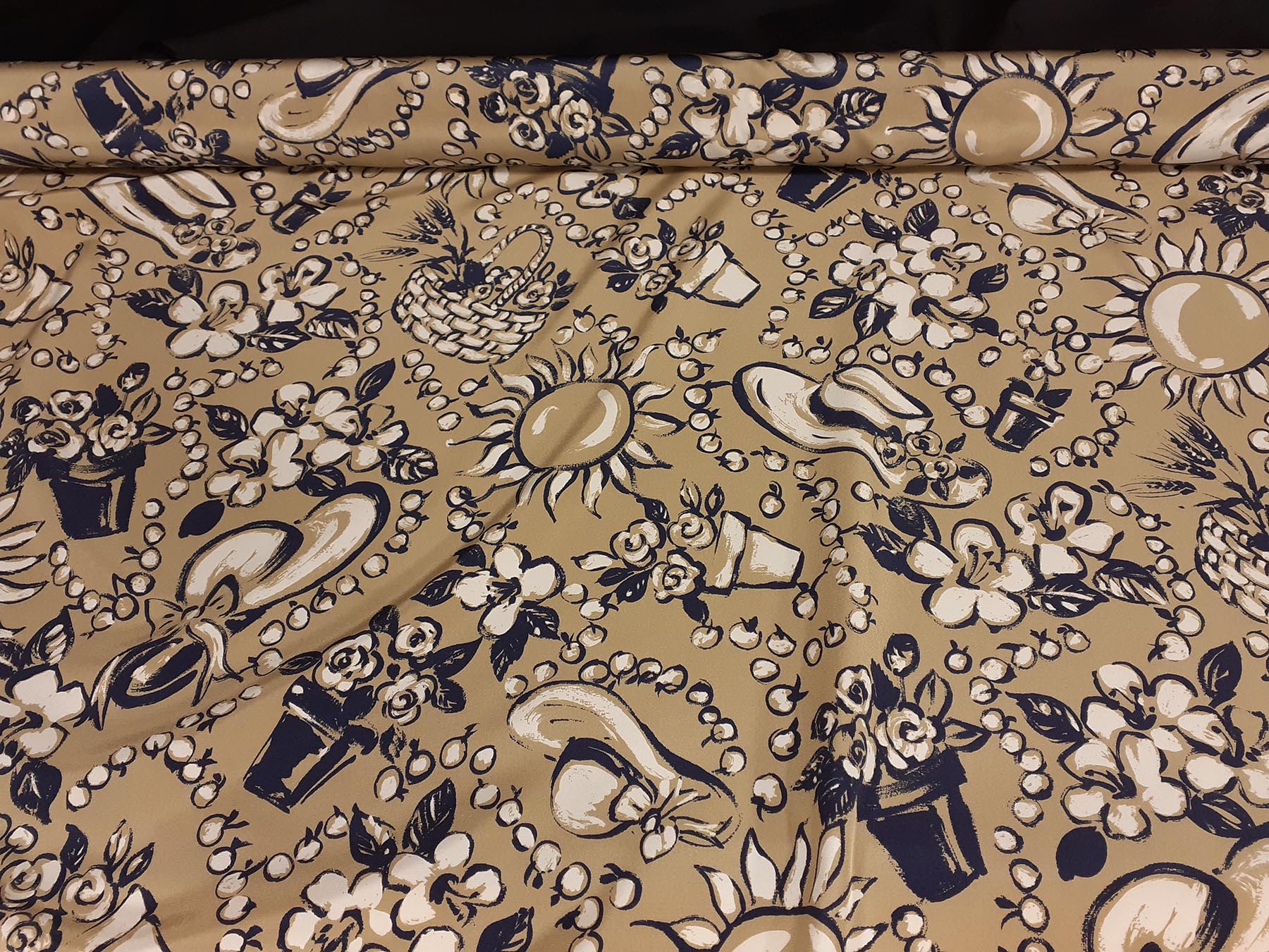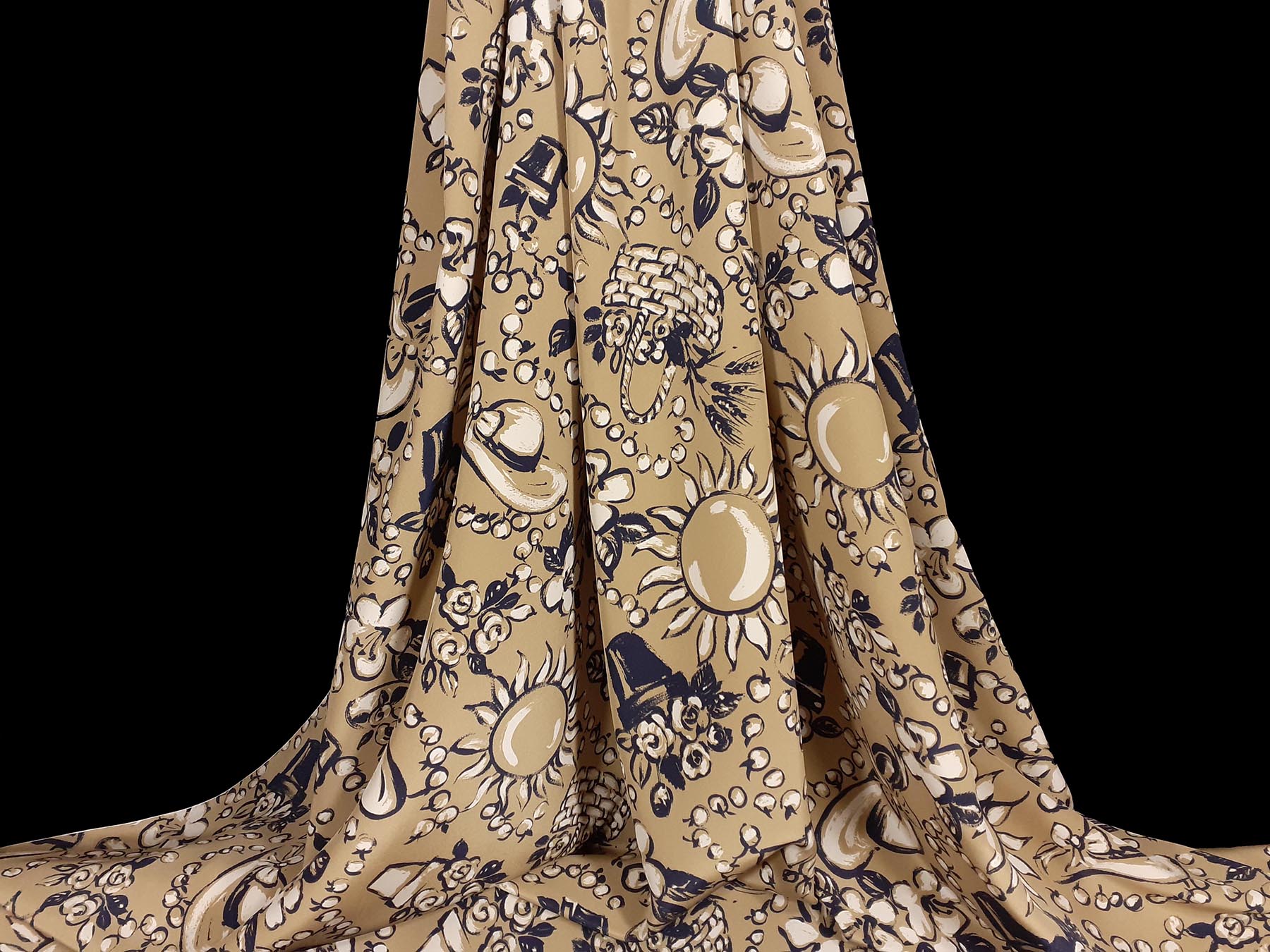 Crepe de Chine in seta fantasia blu e bianca su fondo beige