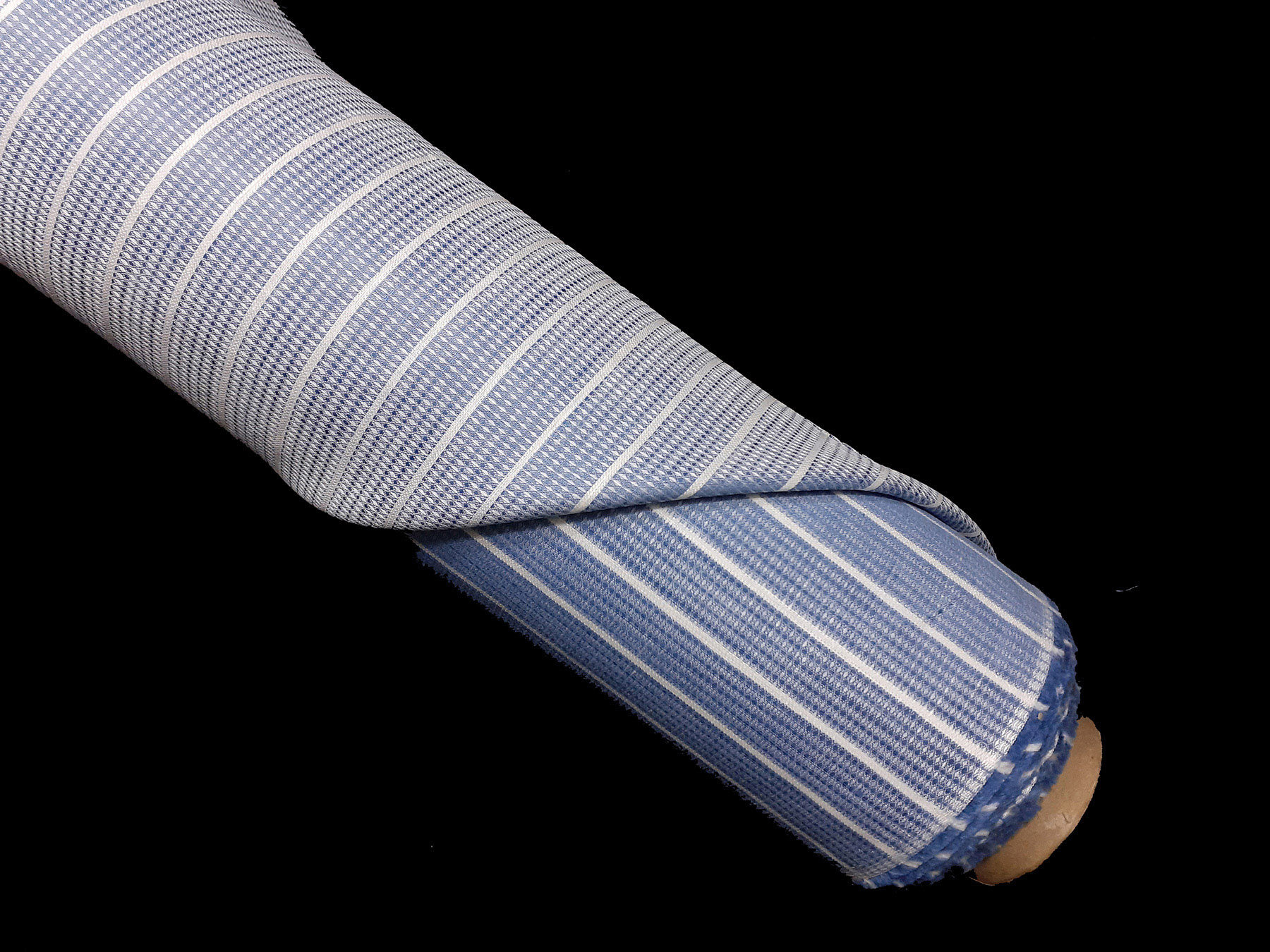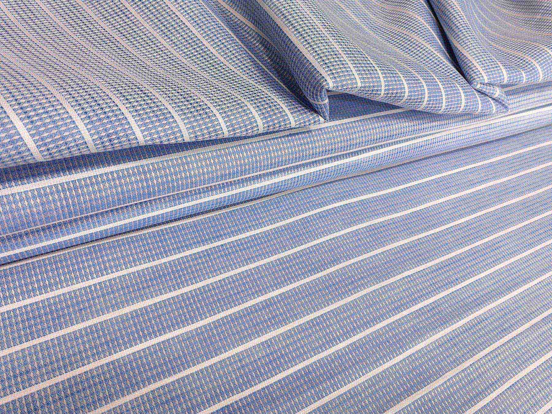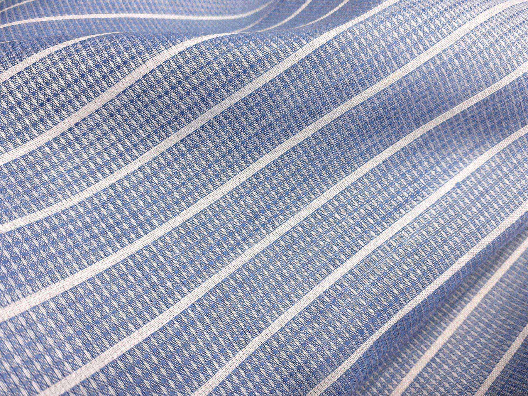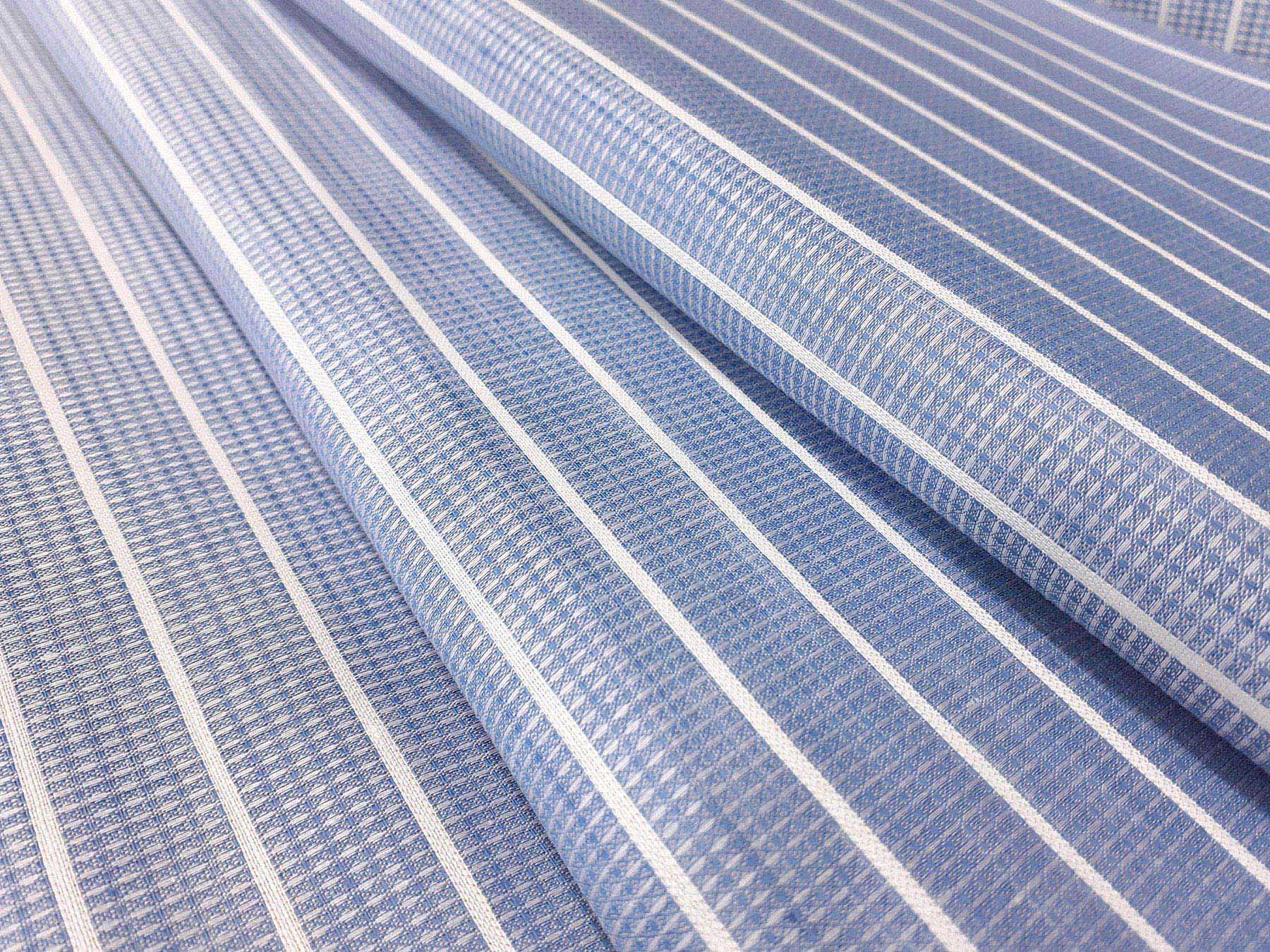 Tessuto per camicie in puro lino righe bianche su fondo azzurro.