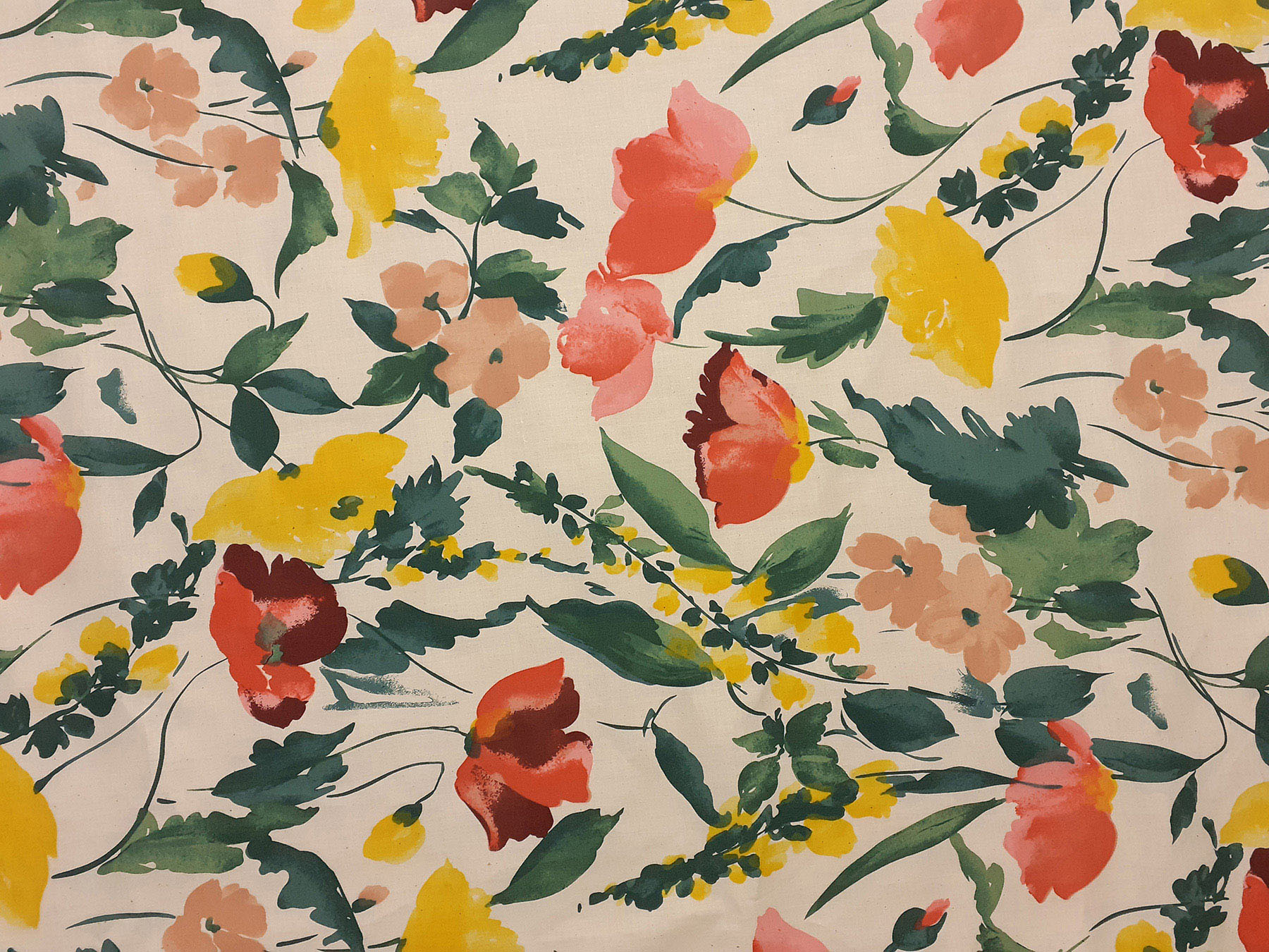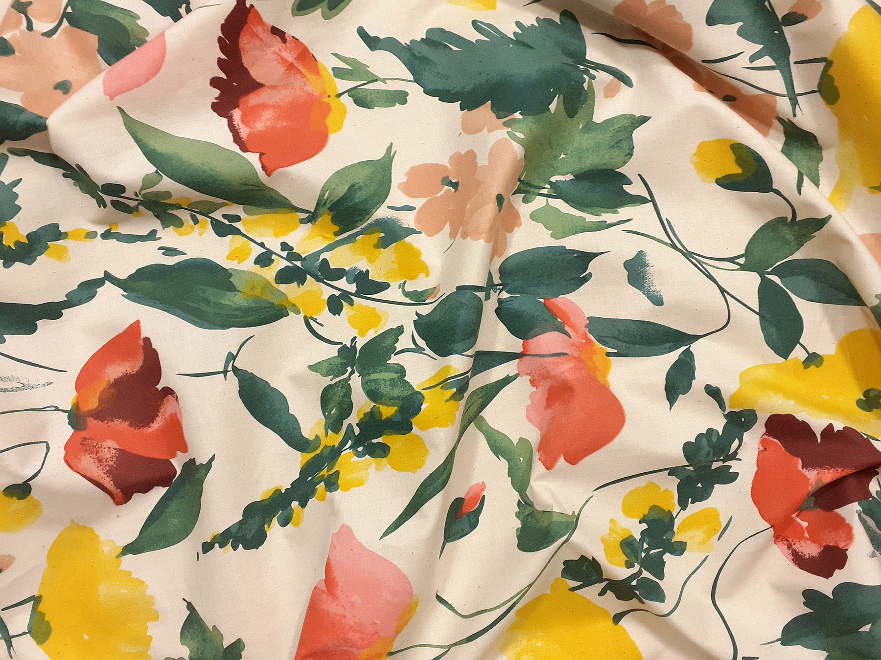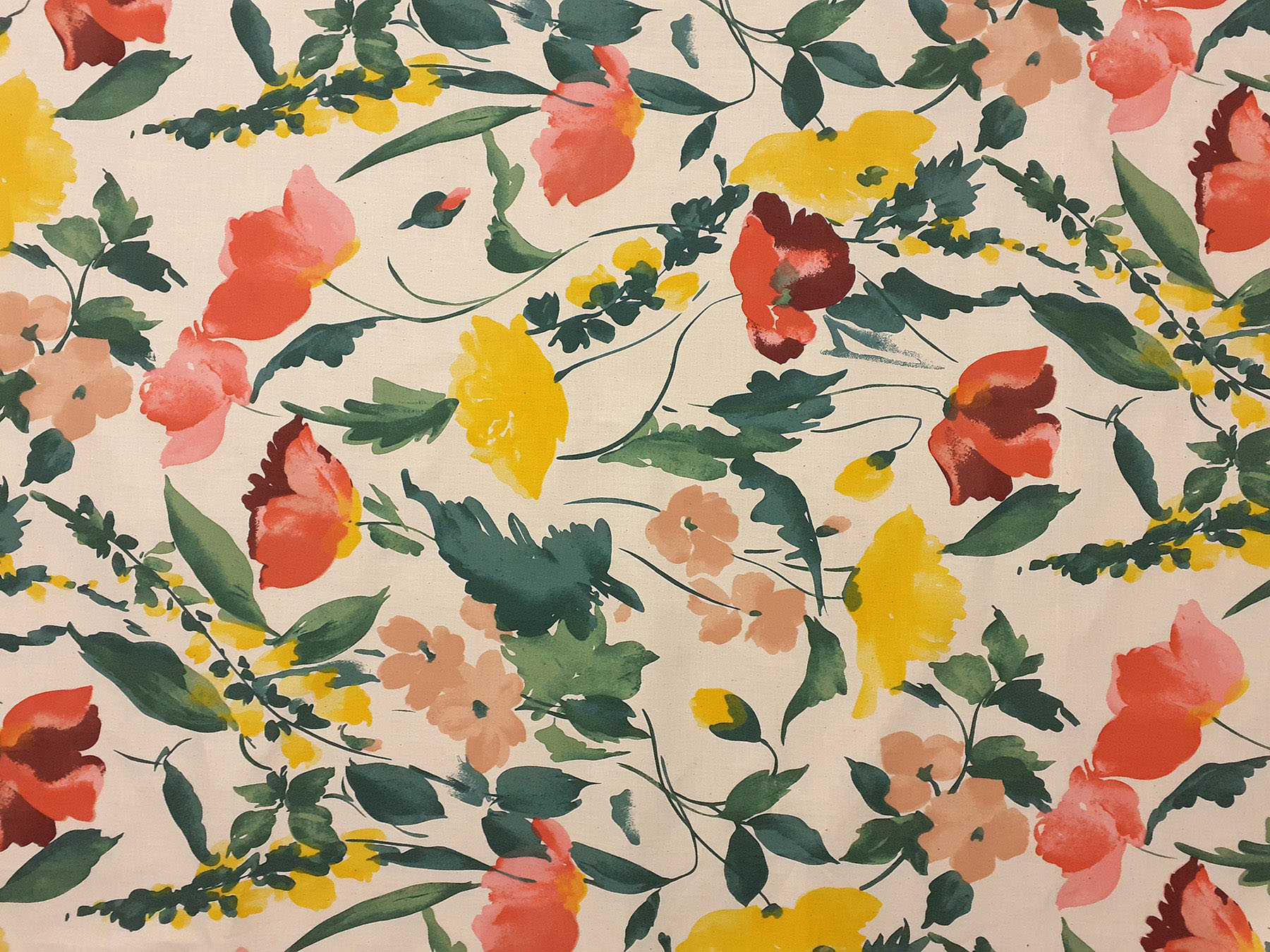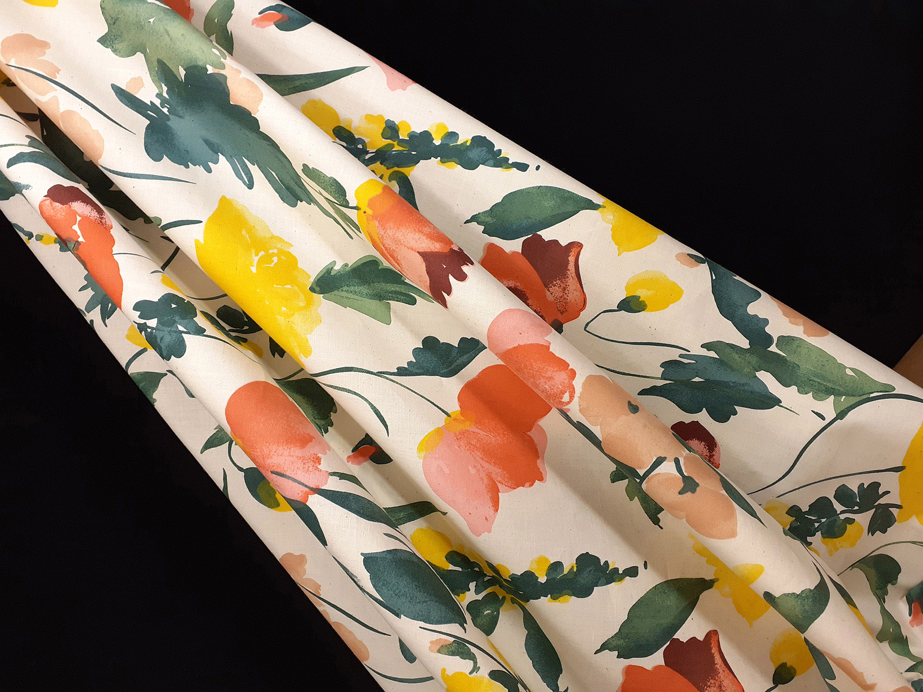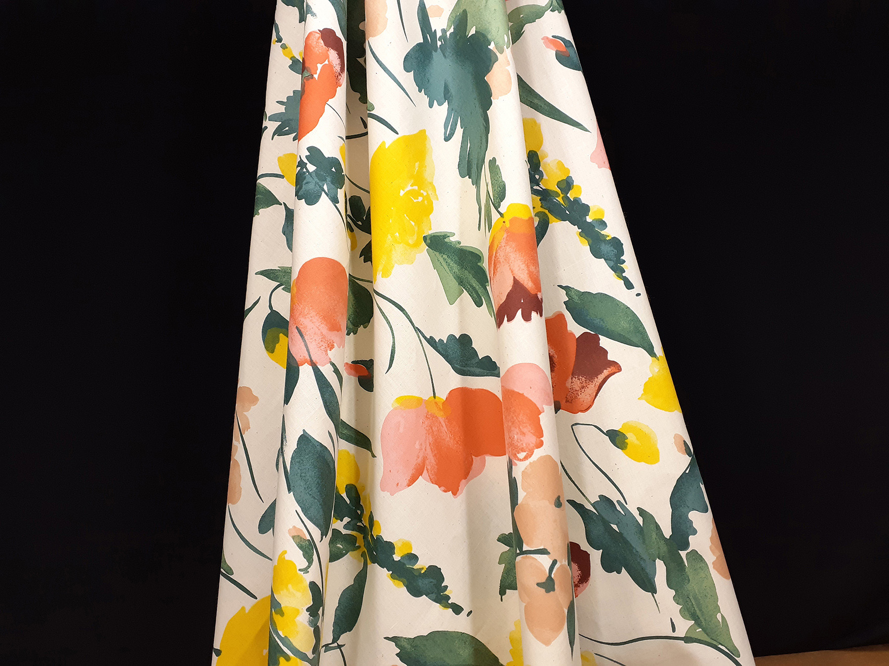Tessuto stampato su un fondo in puro cotone non trattato e non sbiancato di medio peso. Sono presenti piccole irregolarità caratteristiche di questo tipo di lavorazione. Ha mano asciutta, compatta e resistente. Viene utilizzato per la realizzazione di abiti femminili dalle linee semplici, gonne e capi spalla.