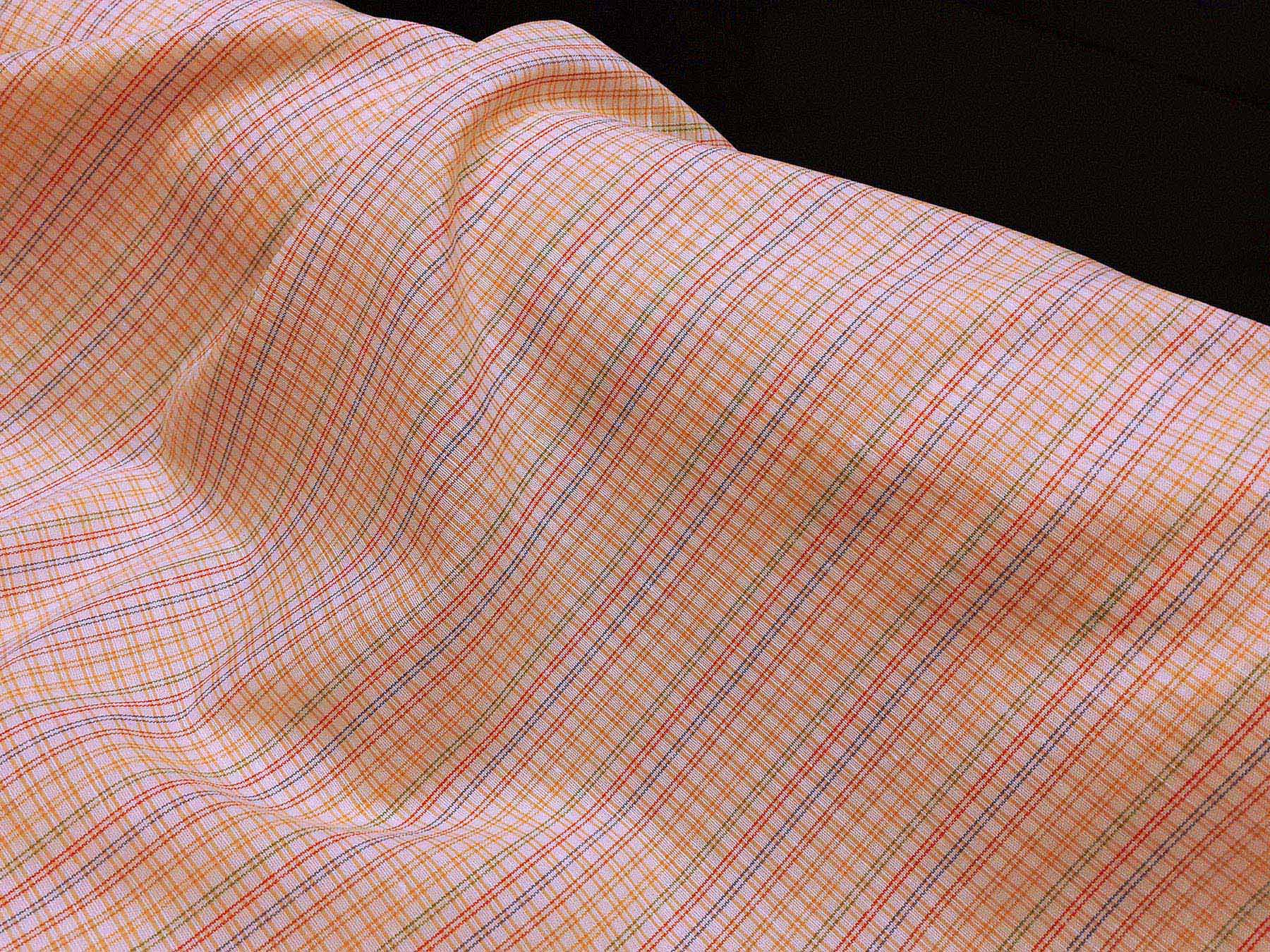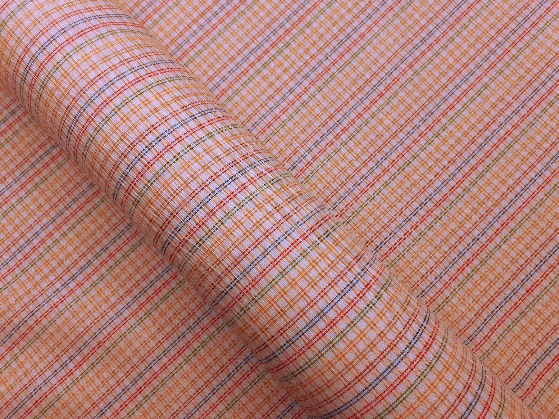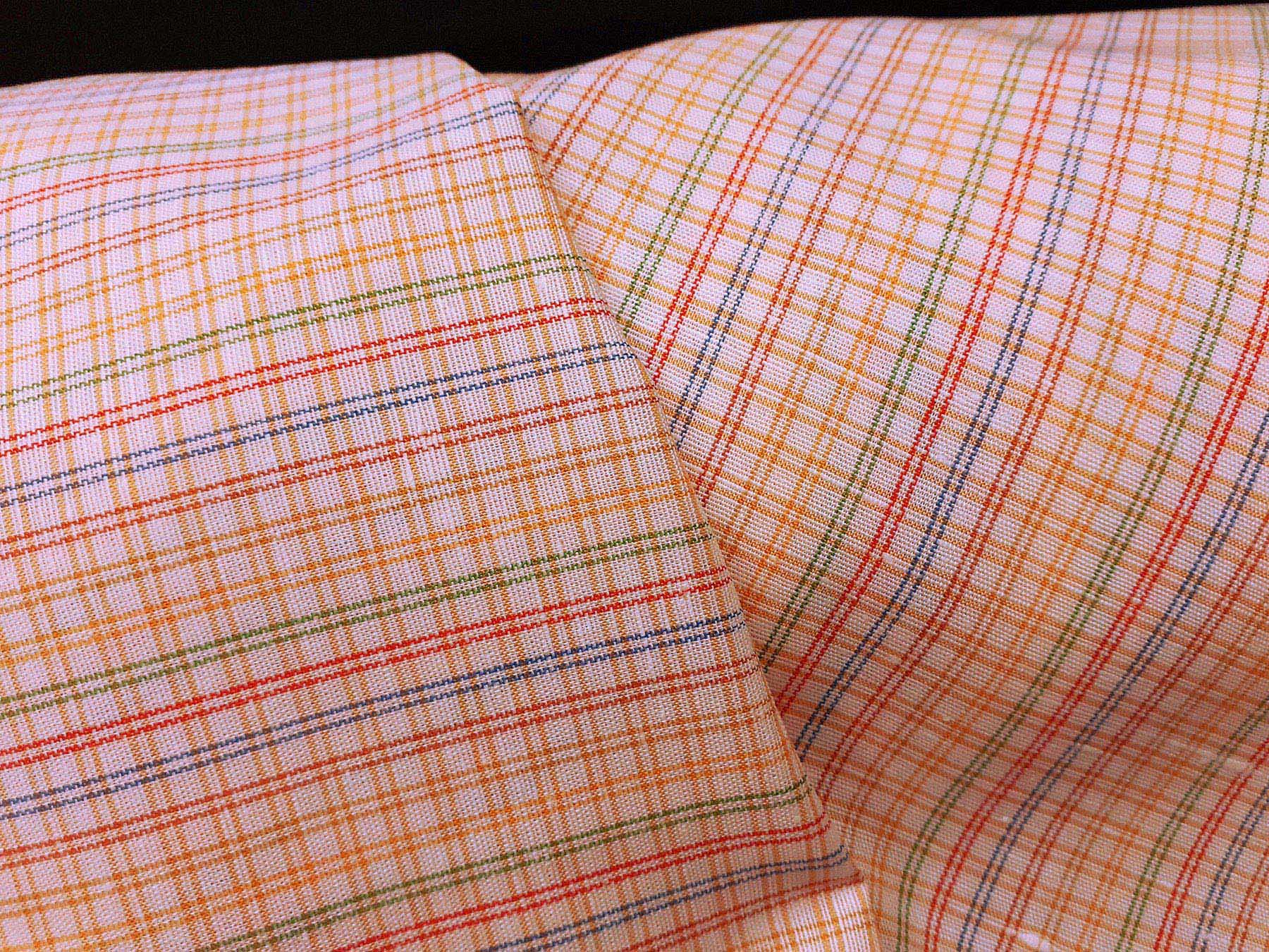 Tessuto lino e cotone a quadretti e righe multicolori su fondo bianco.