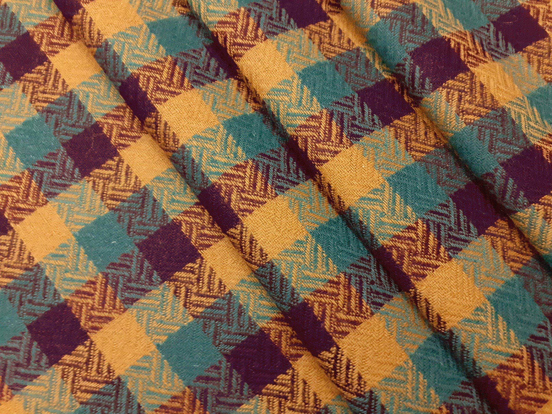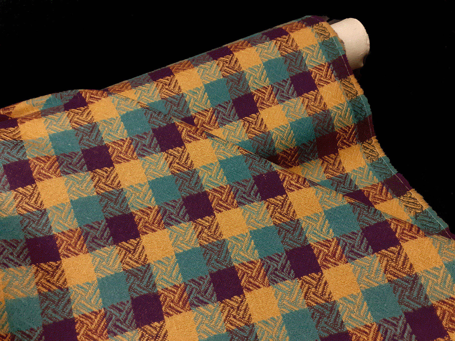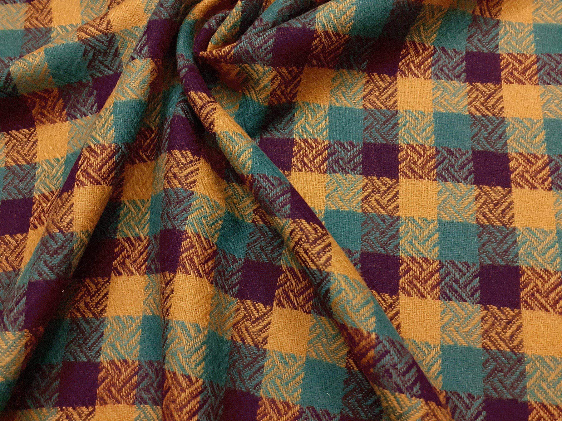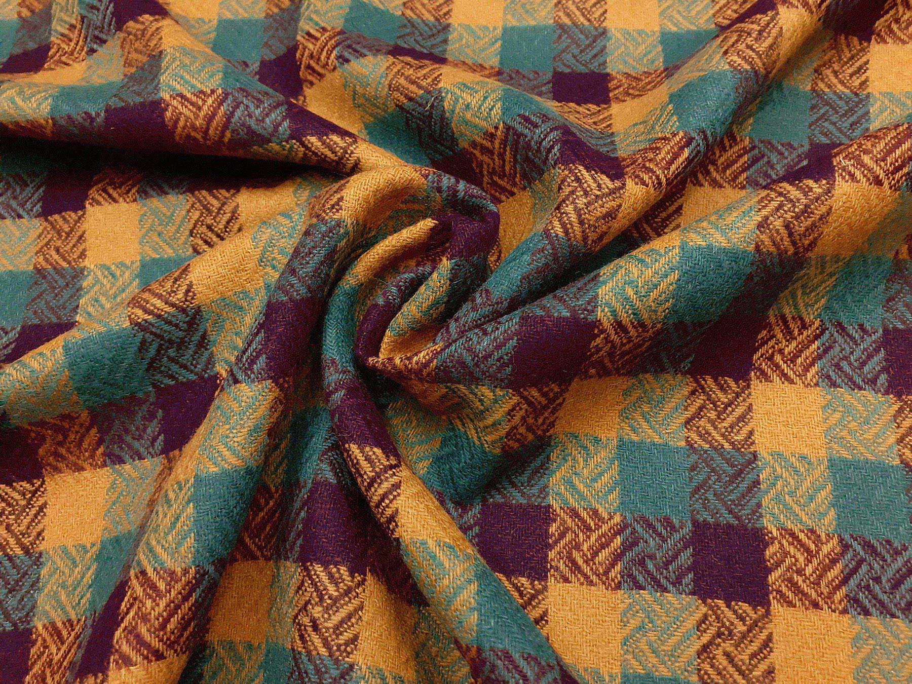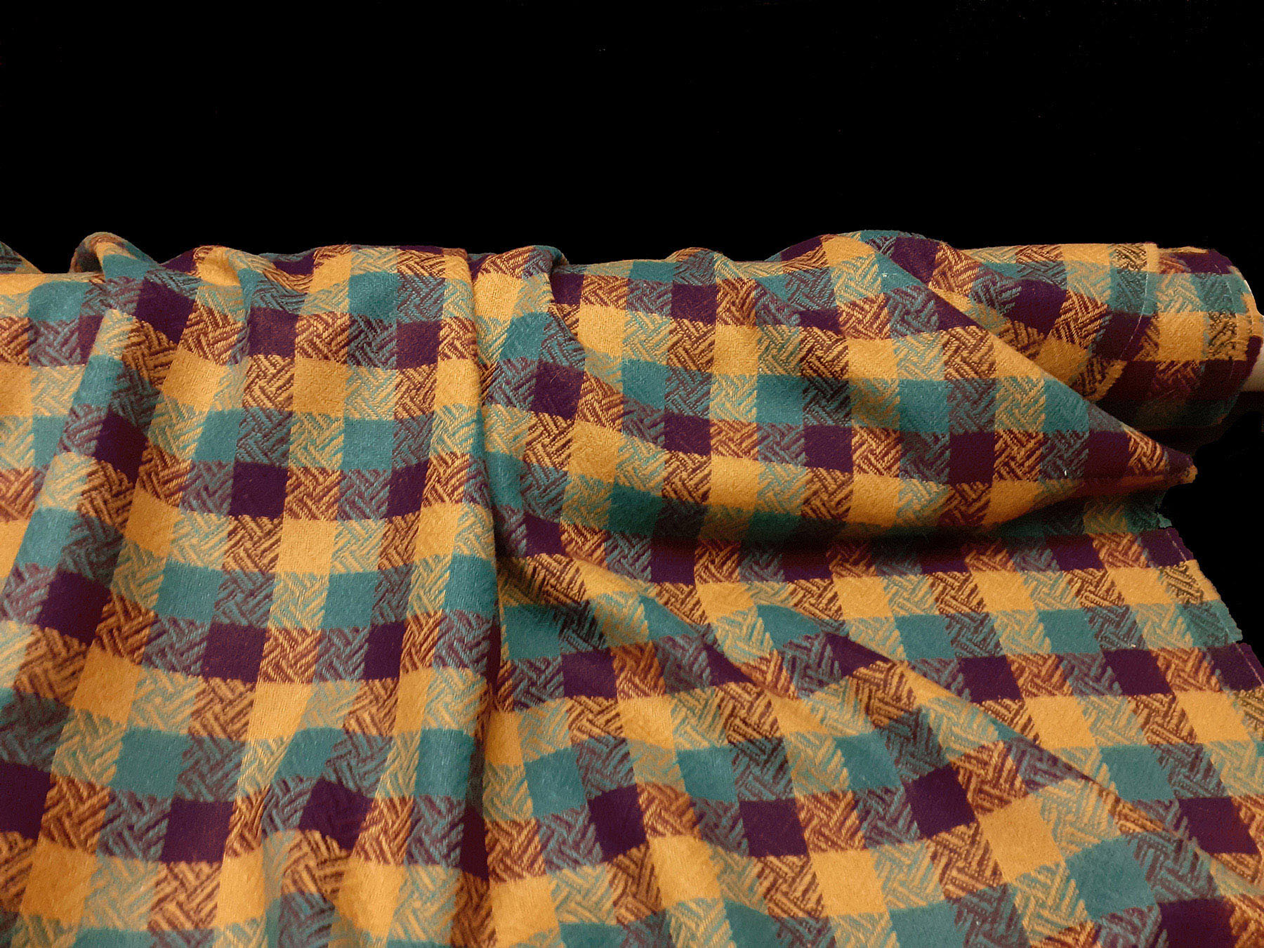 Tessuto jacquard in lana a riquadri tinta ocra, bordeaux e turchese