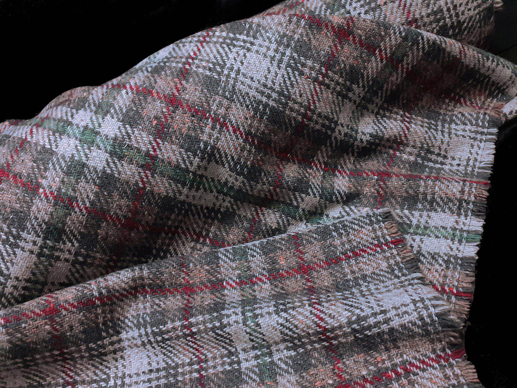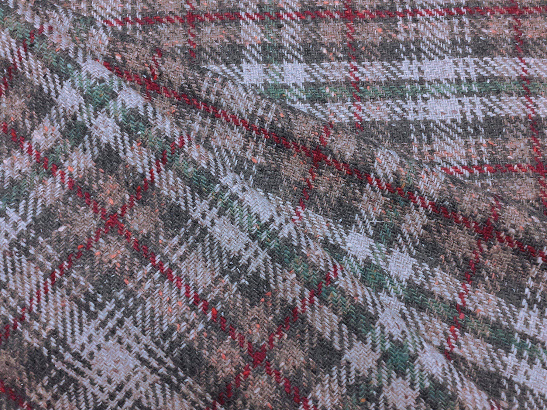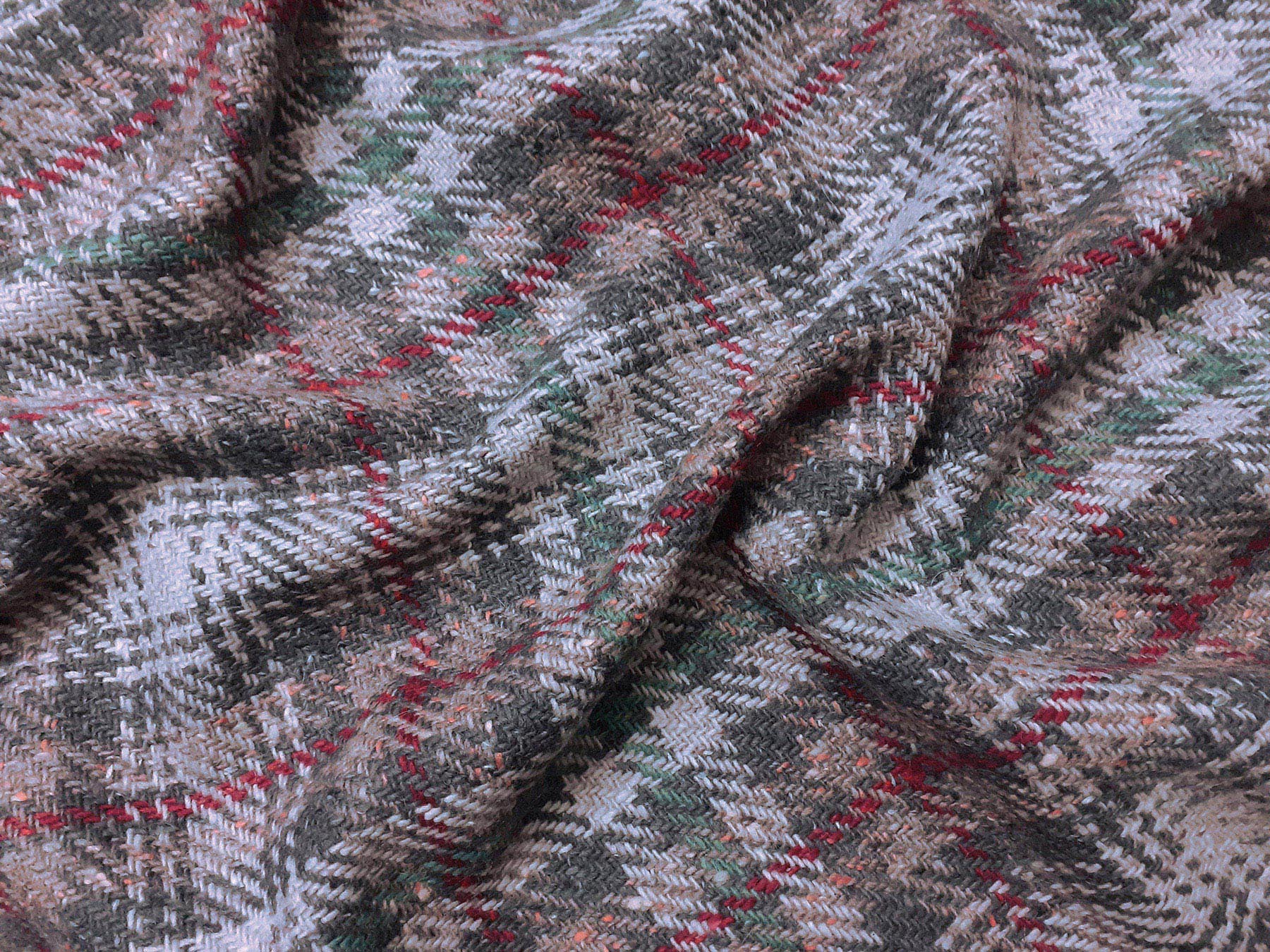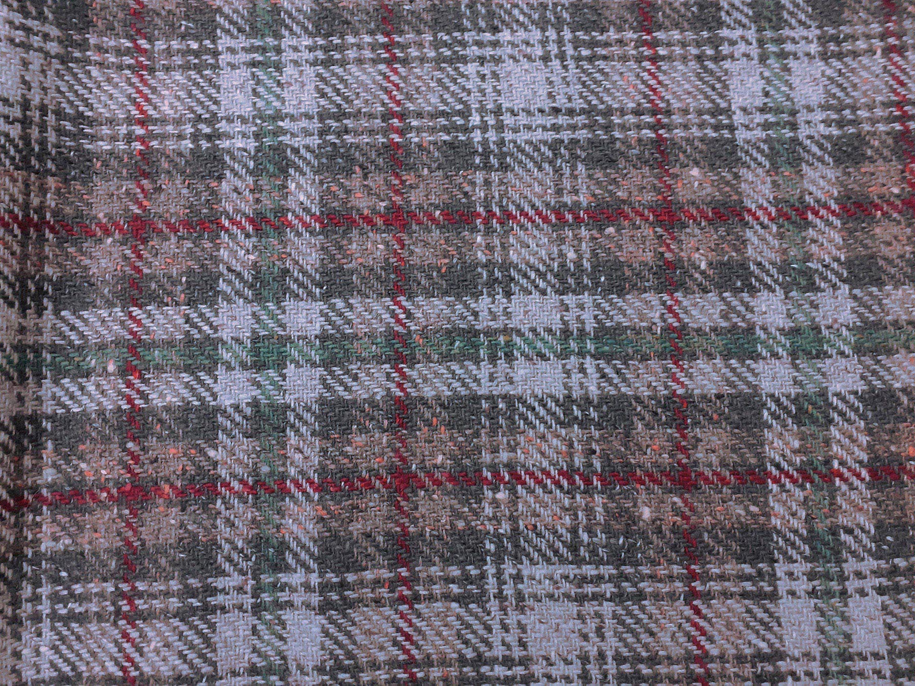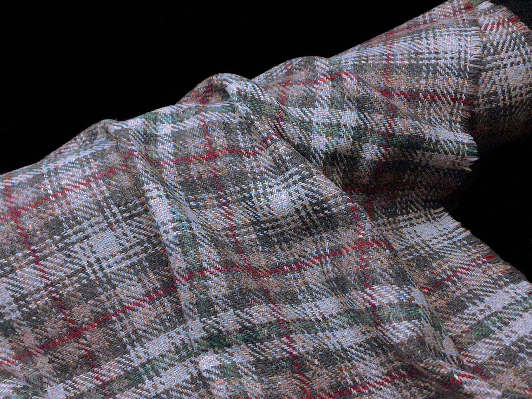 Tessuto in lana fondo grigio perla e beige con riquadro rosso e verde