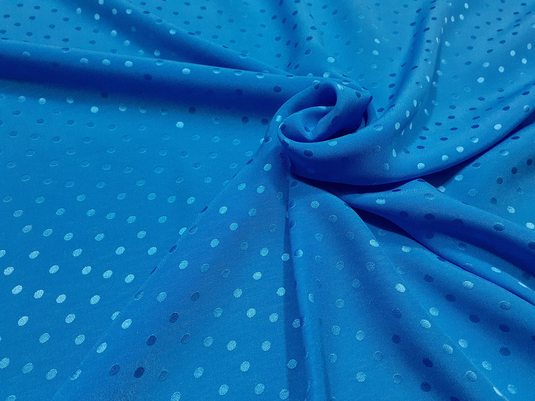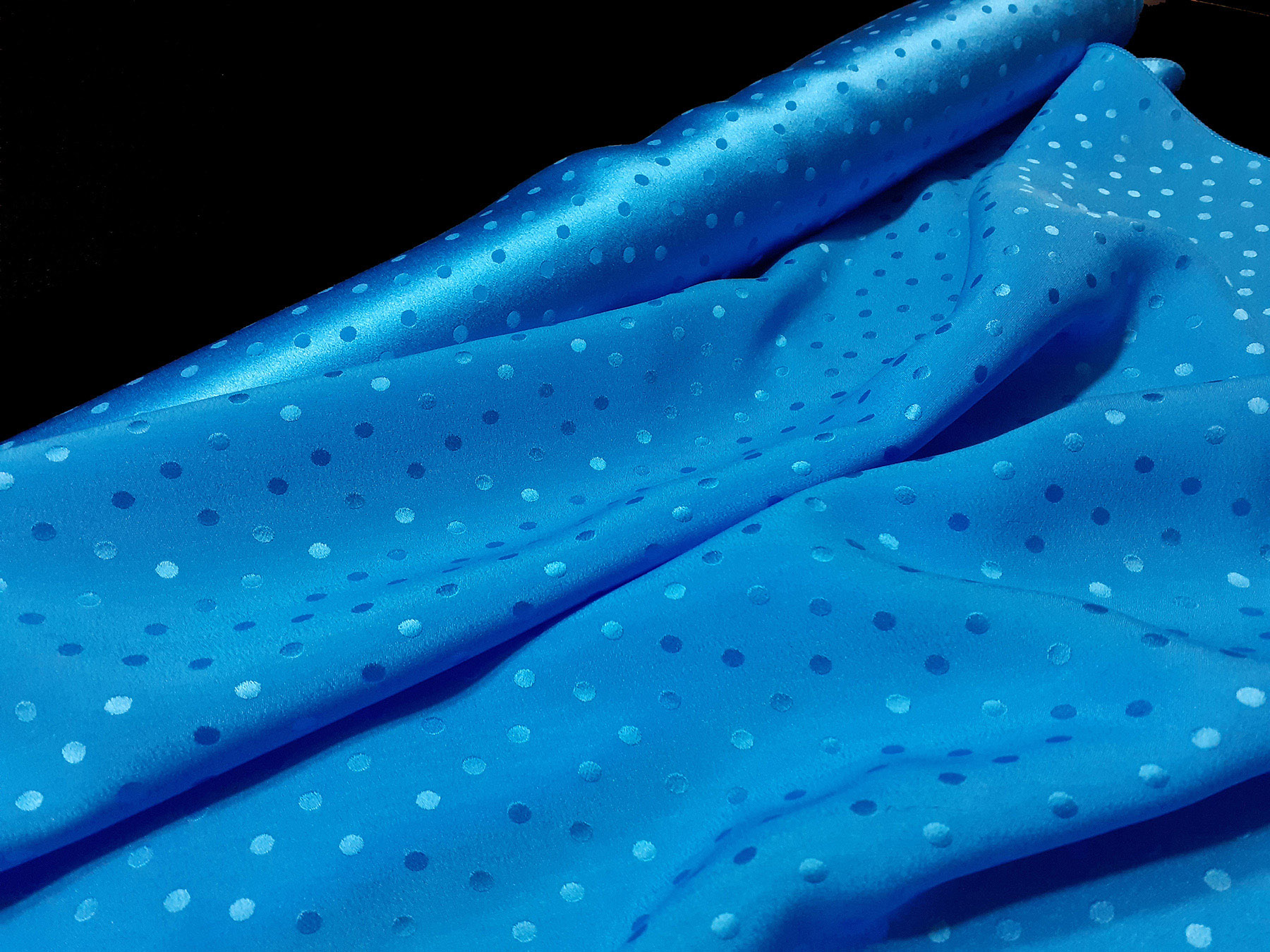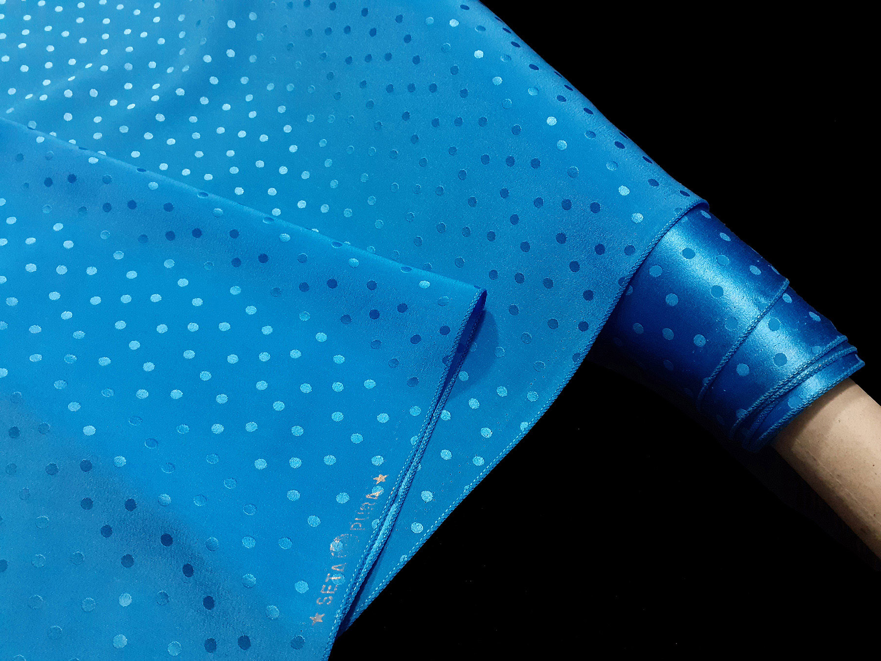 In questo tessuto di seta pura, prodotto a Como, la lavorazione jacquard con il contrasto fra lucido e opaco, crea un piacevole effetto di tridimensionalità. Perfetto per la realizzazione di abiti ampi e sinuosi, grazie alla sua morbidezza e caduta, può essere utilizzato anche per capi più lineari che mettono in evidenza la ricchezza e la particolarità di questo tipo di tessuto.