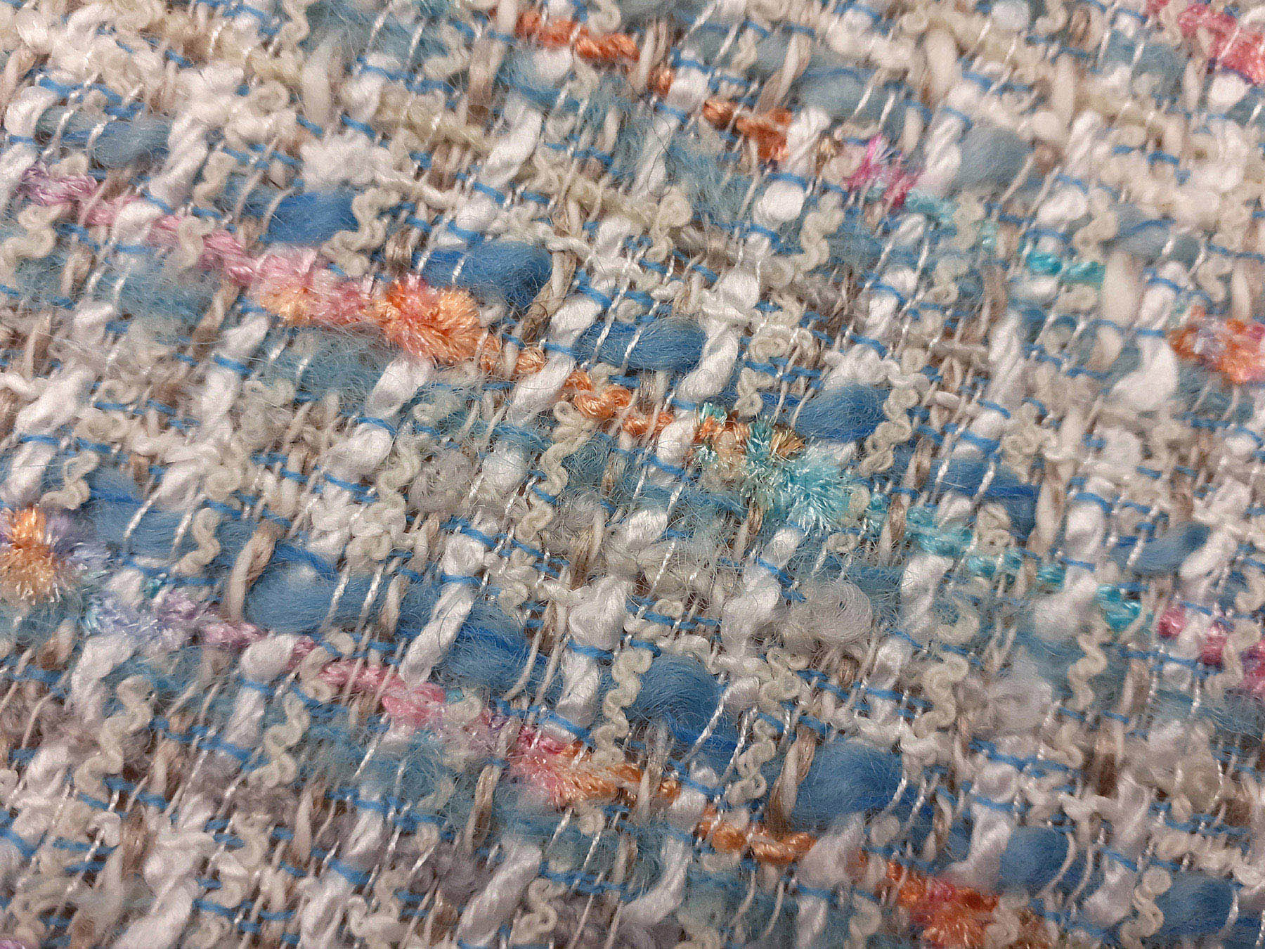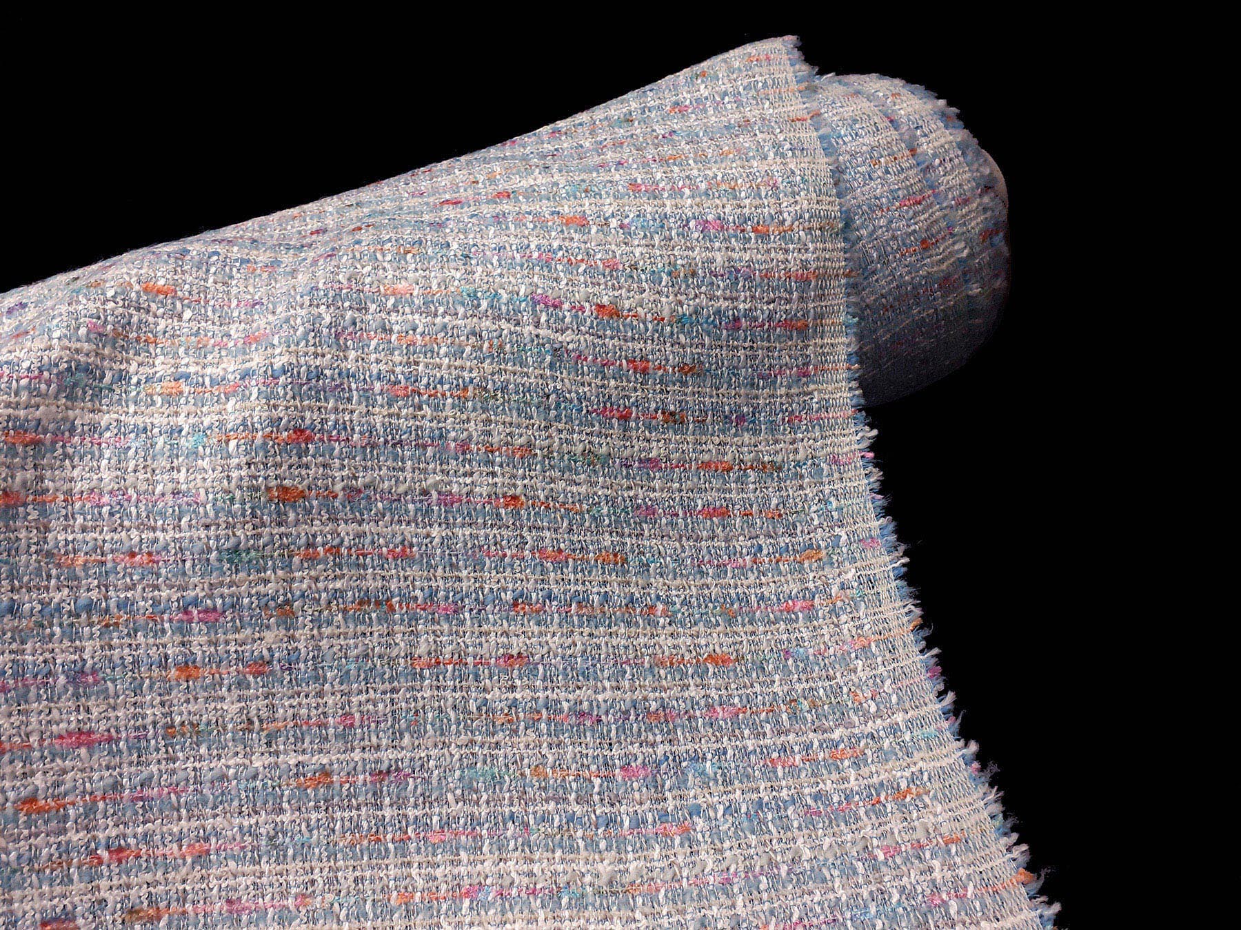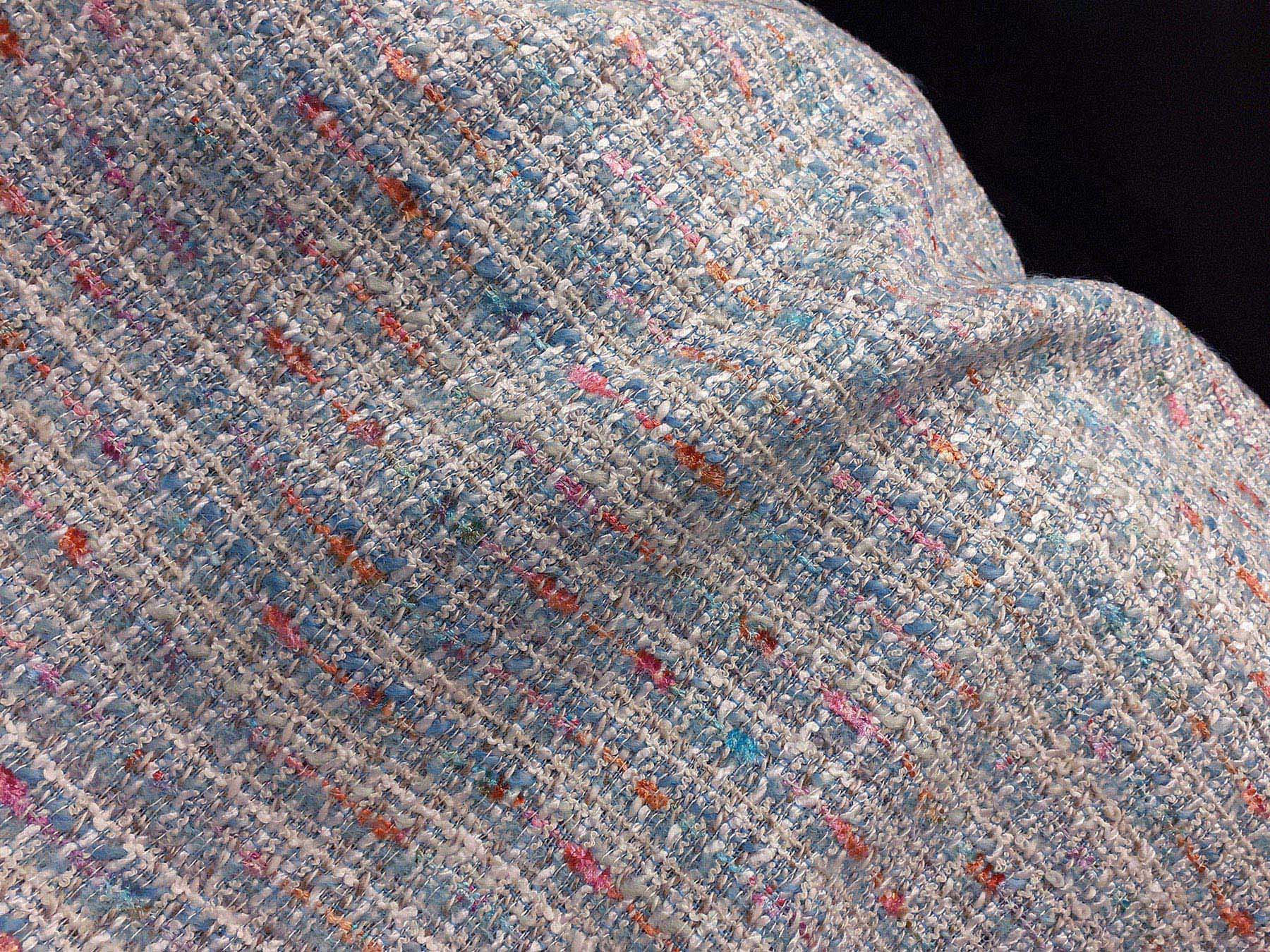 In questo tessuto Chanel – con armatura a stuoia – gli effetti di filatura fiammati, bouclé e frisé sono intrecciati con filati pettinati più resistenti. La mano è morbida e corposa, ideale per la realizzazione di capispalla, abiti e gonne.