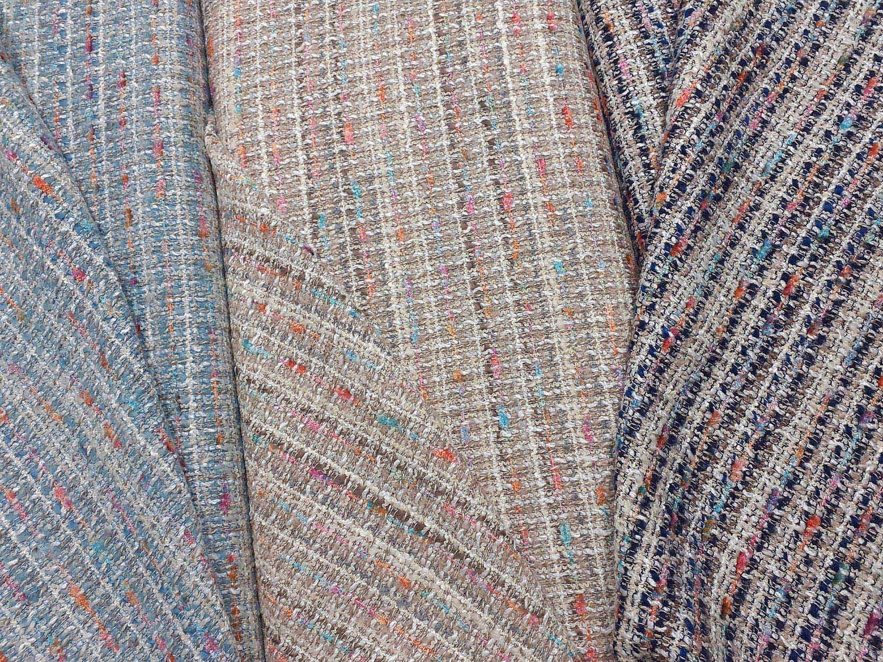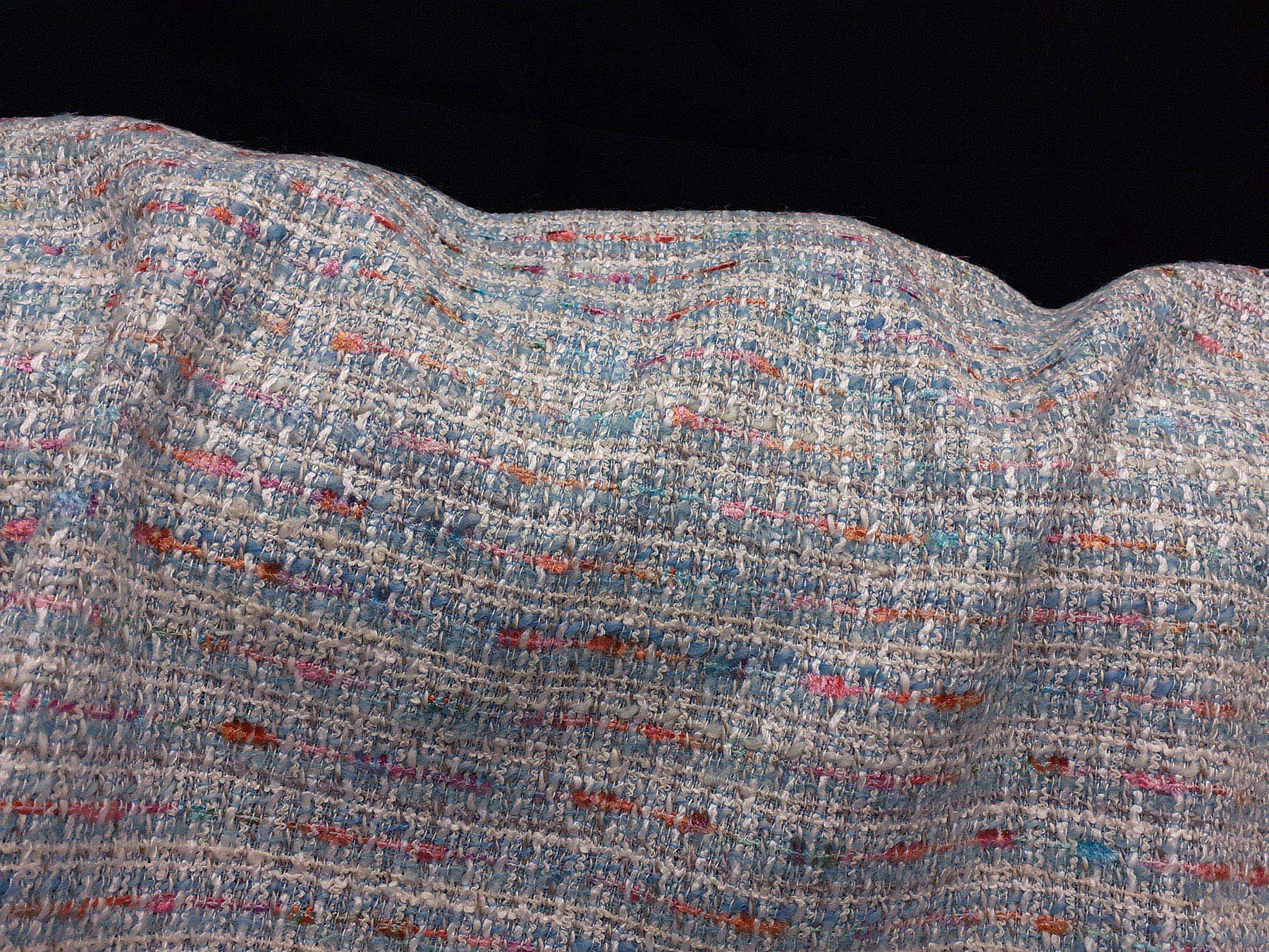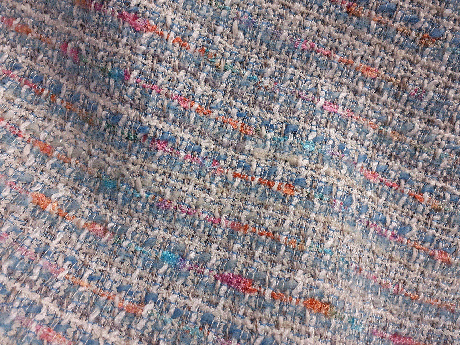 In questo tessuto Chanel – con armatura a stuoia – gli effetti di filatura fiammati, bouclé e frisé sono intrecciati con filati pettinati più resistenti. La mano è morbida e corposa, ideale per la realizzazione di capispalla, abiti e gonne.