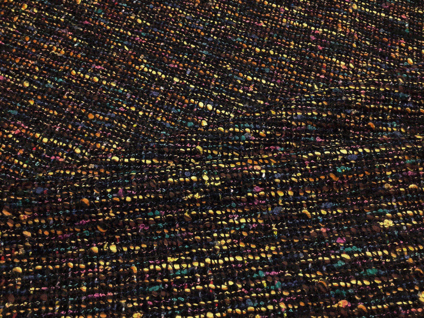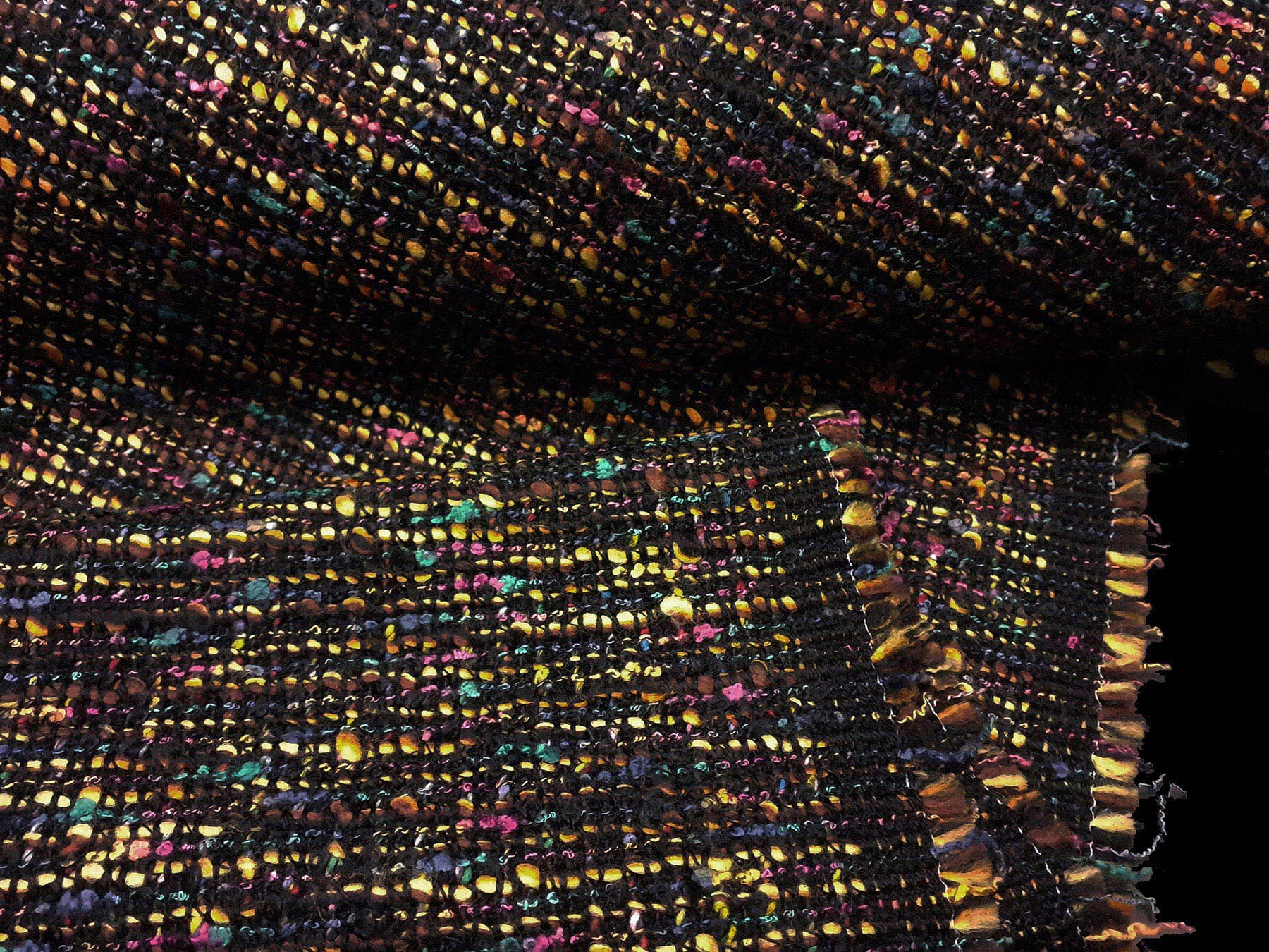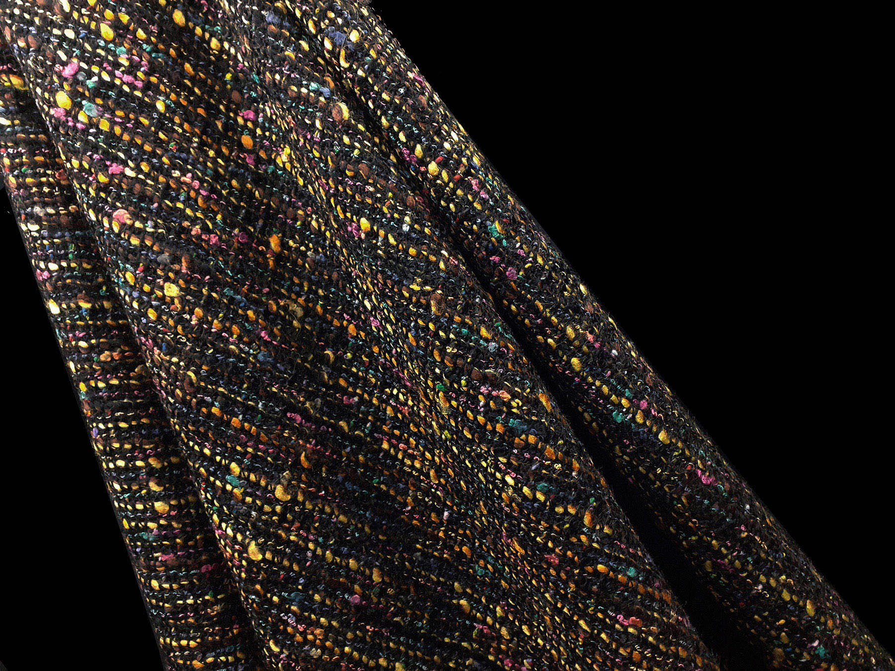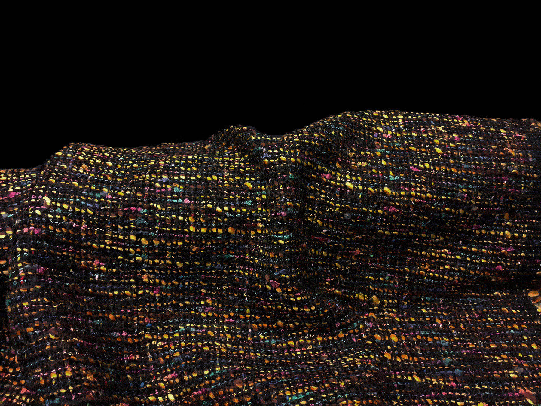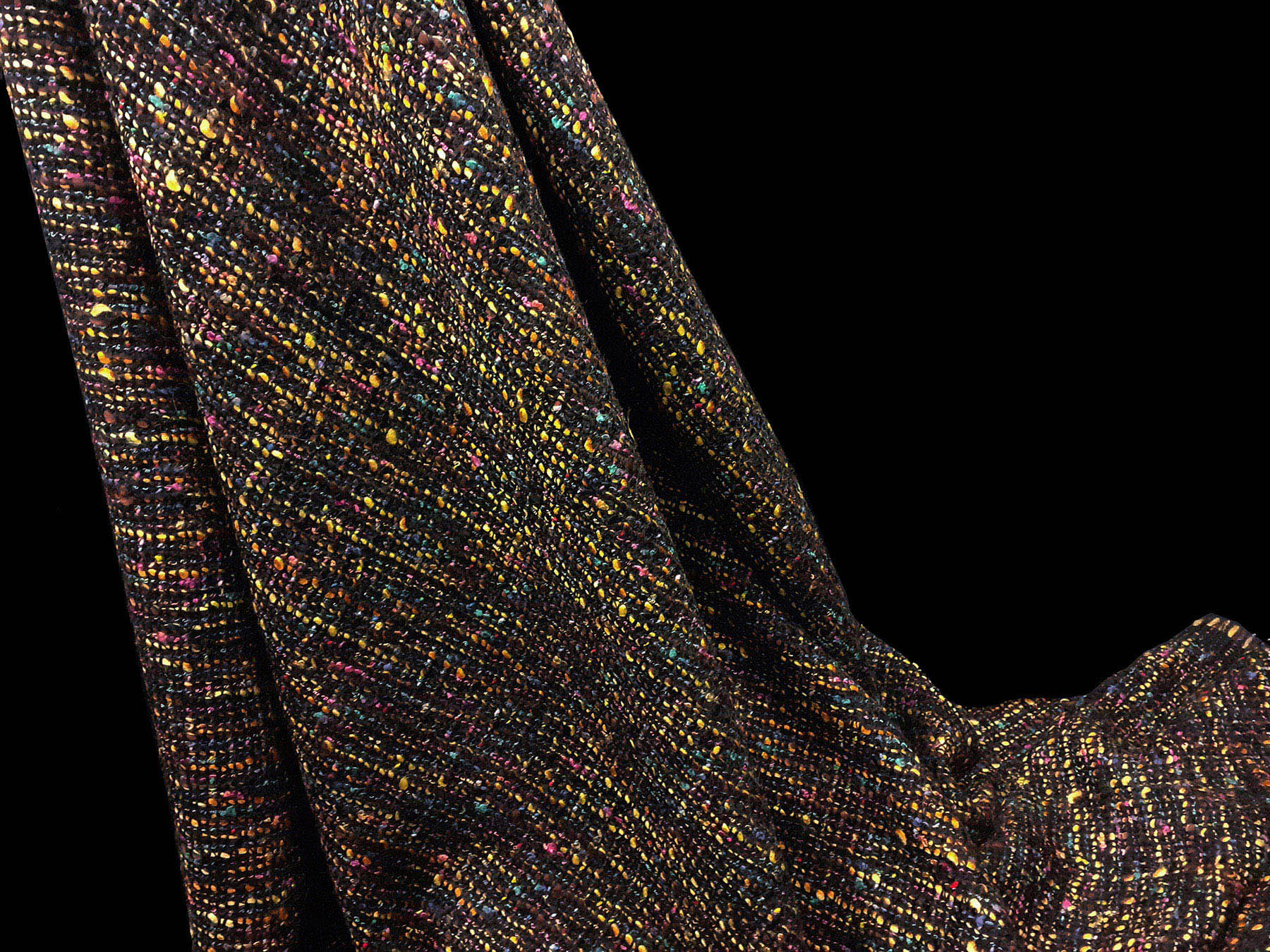 In questo tessuto Chanel – con armatura a stuoia – gli effetti di filatura fiammati, bouclé e frisé sono intrecciati con filati pettinati più resistenti. La mano è morbida e corposa, ideale per la realizzazione di capispalla, abiti e gonne.