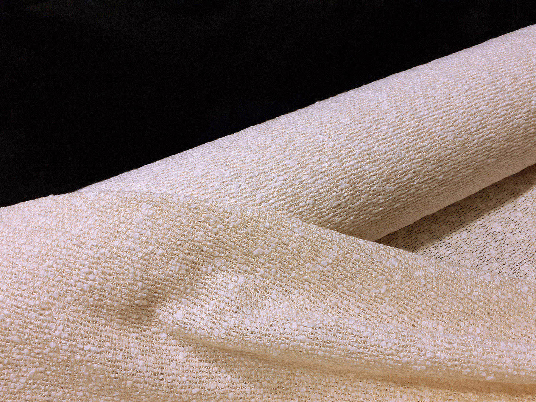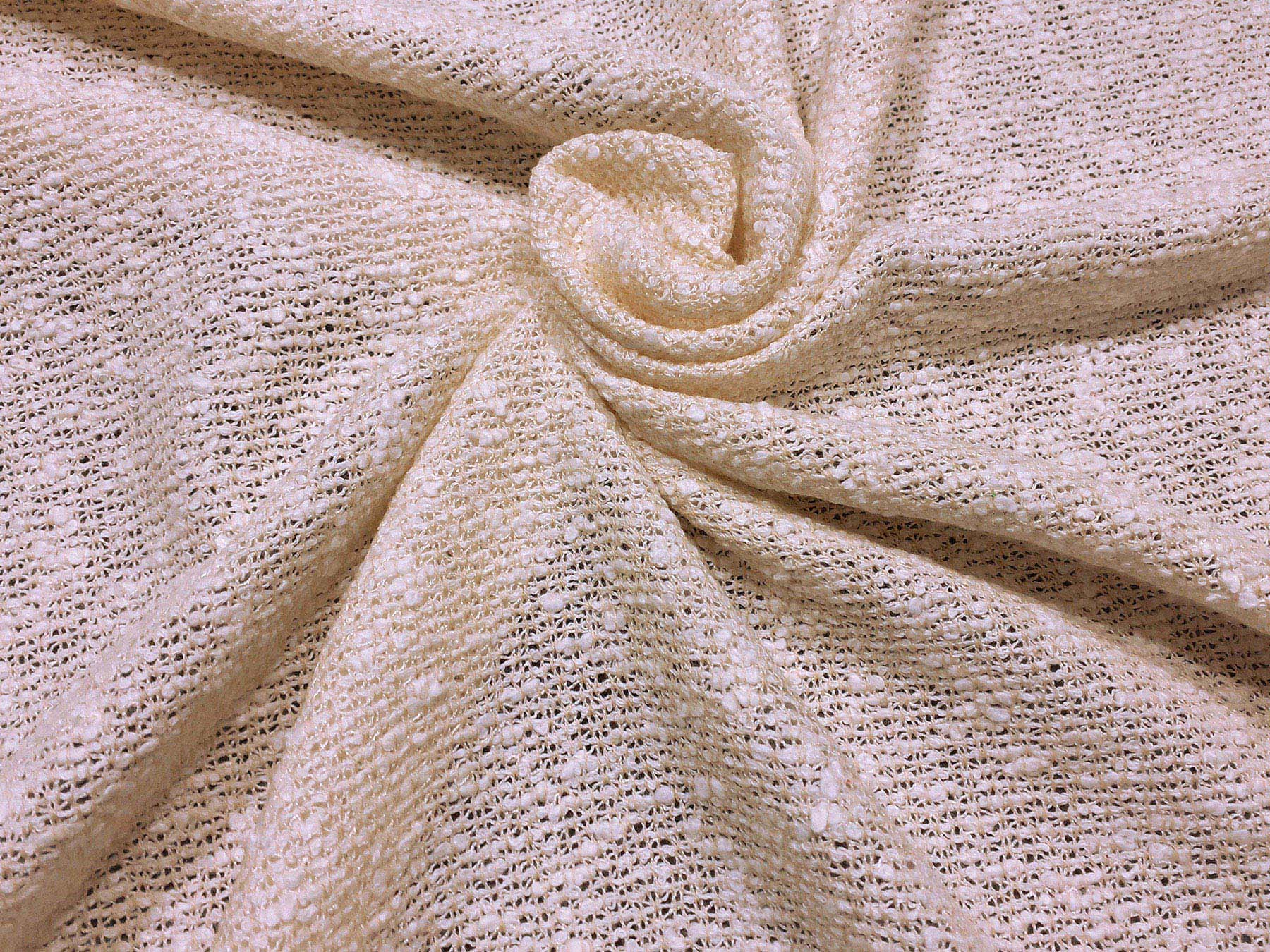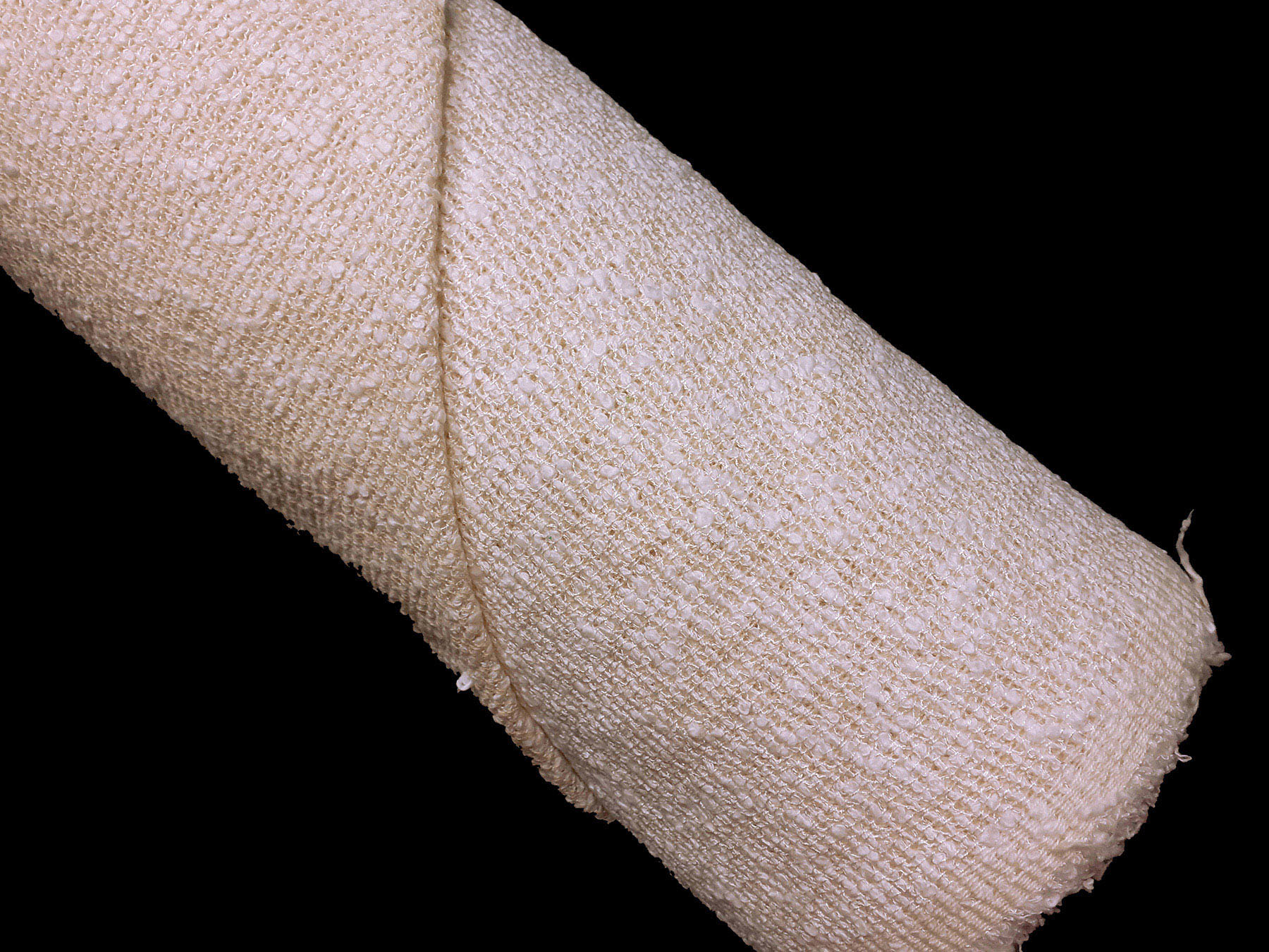 In questo tessuto Chanel – con armatura a stuoia – gli effetti di filatura bouclè sono intrecciati con filati di cotone ritorto. La mano è morbida e corposa, ideale per la realizzazione di abiti, giacche e gonne.