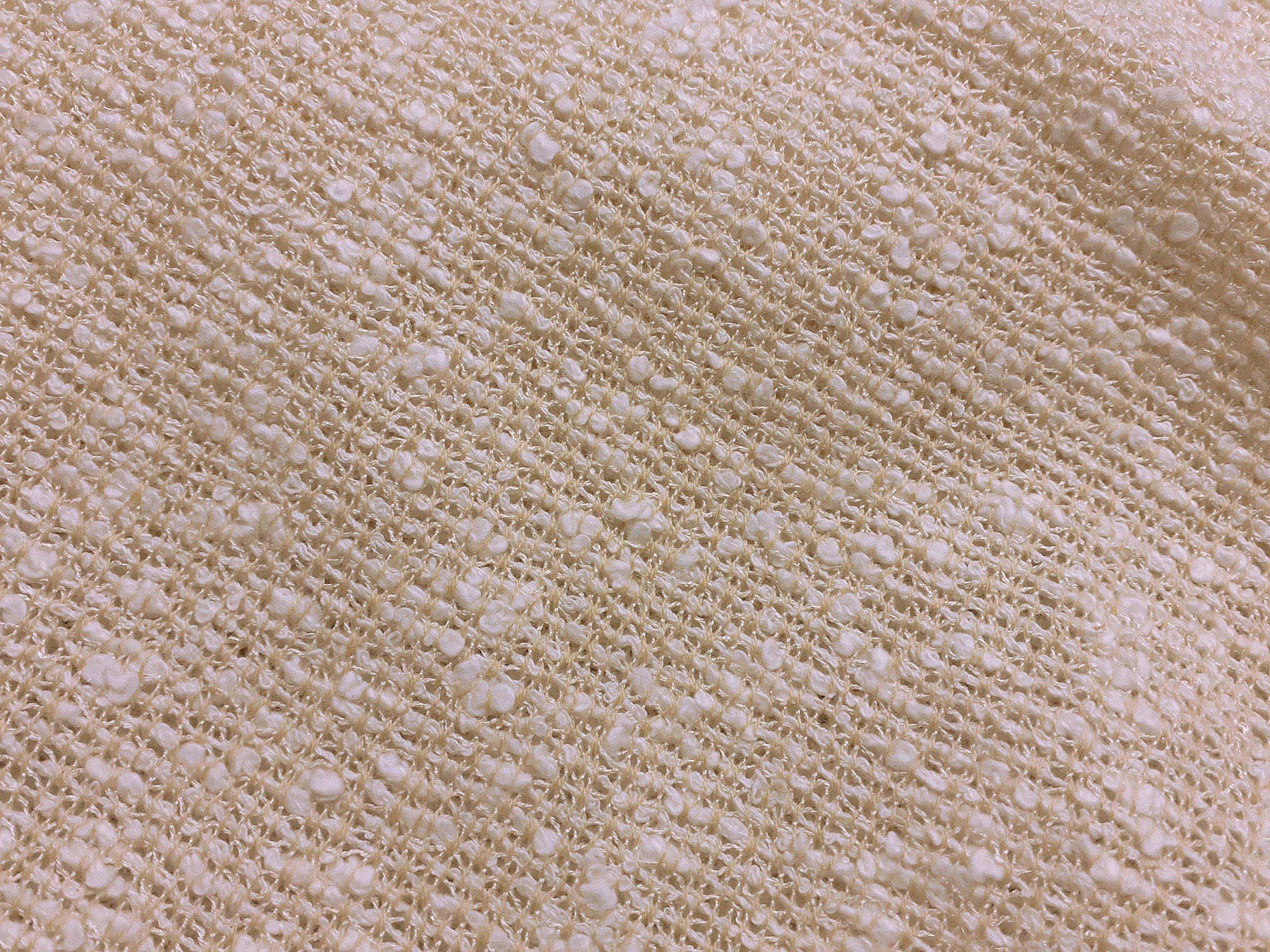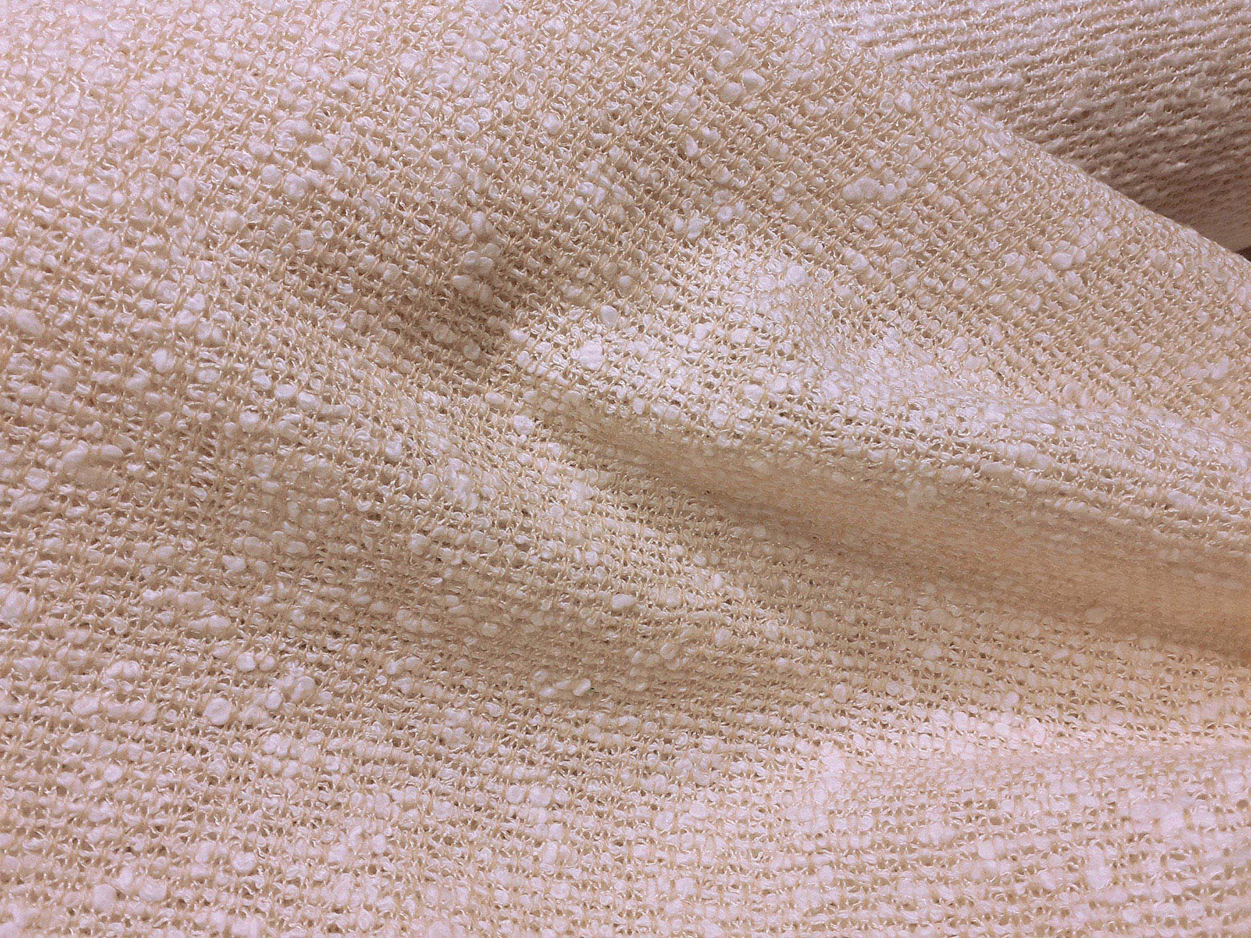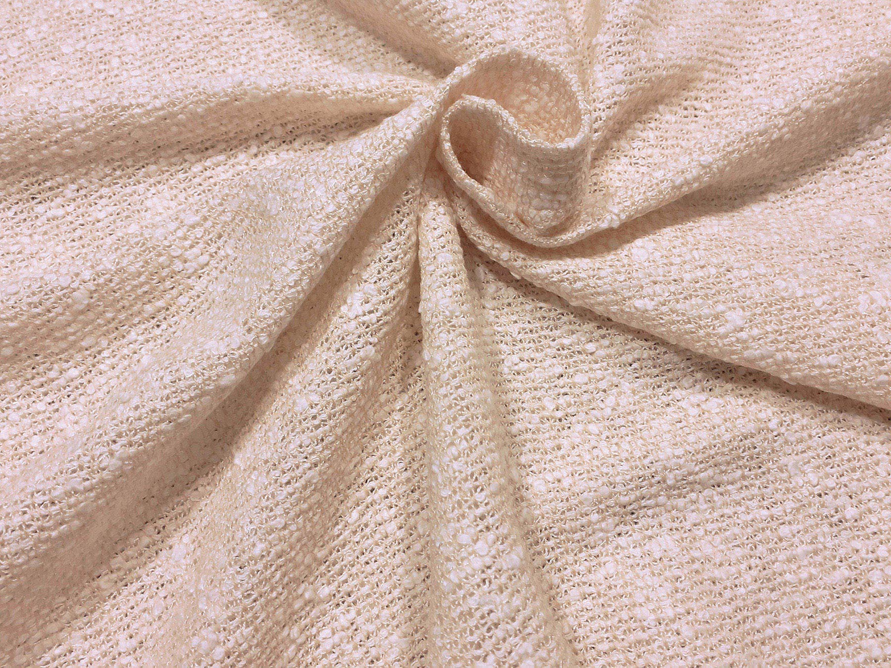 In questo tessuto Chanel – con armatura a stuoia – gli effetti di filatura bouclè sono intrecciati con filati di cotone ritorto. La mano è morbida e corposa, ideale per la realizzazione di abiti, giacche e gonne.