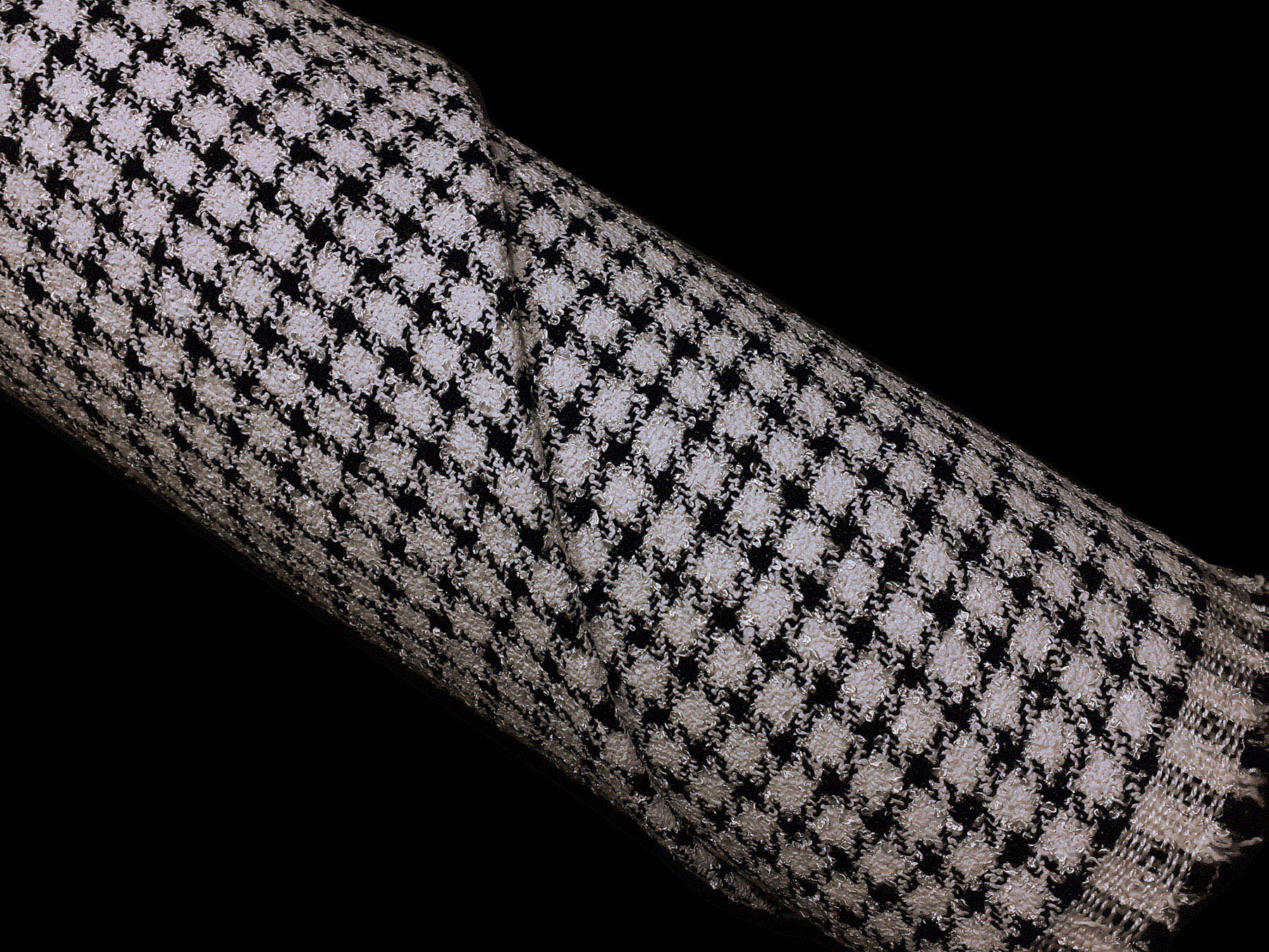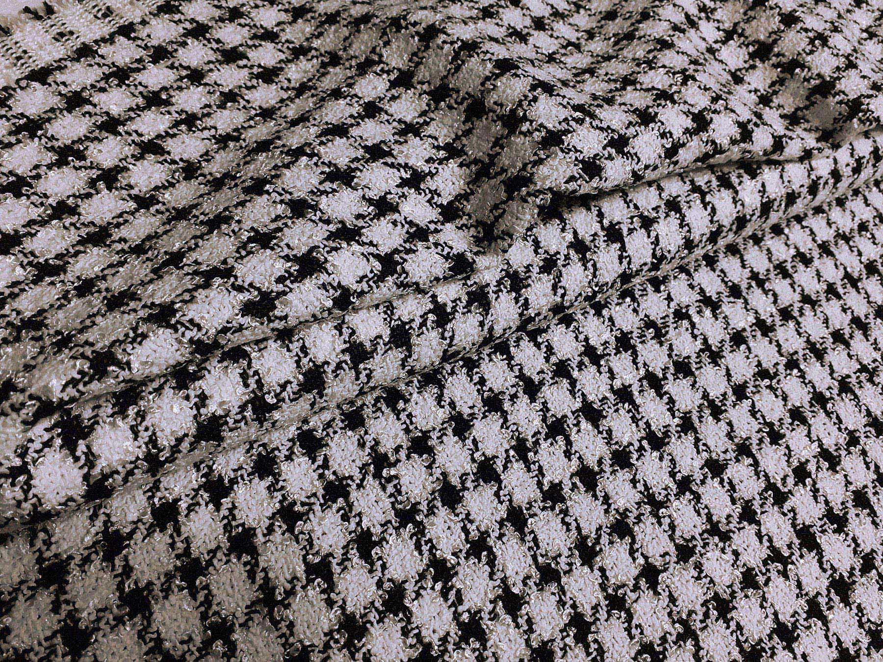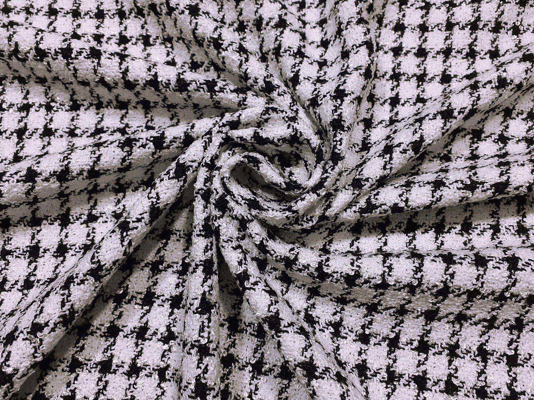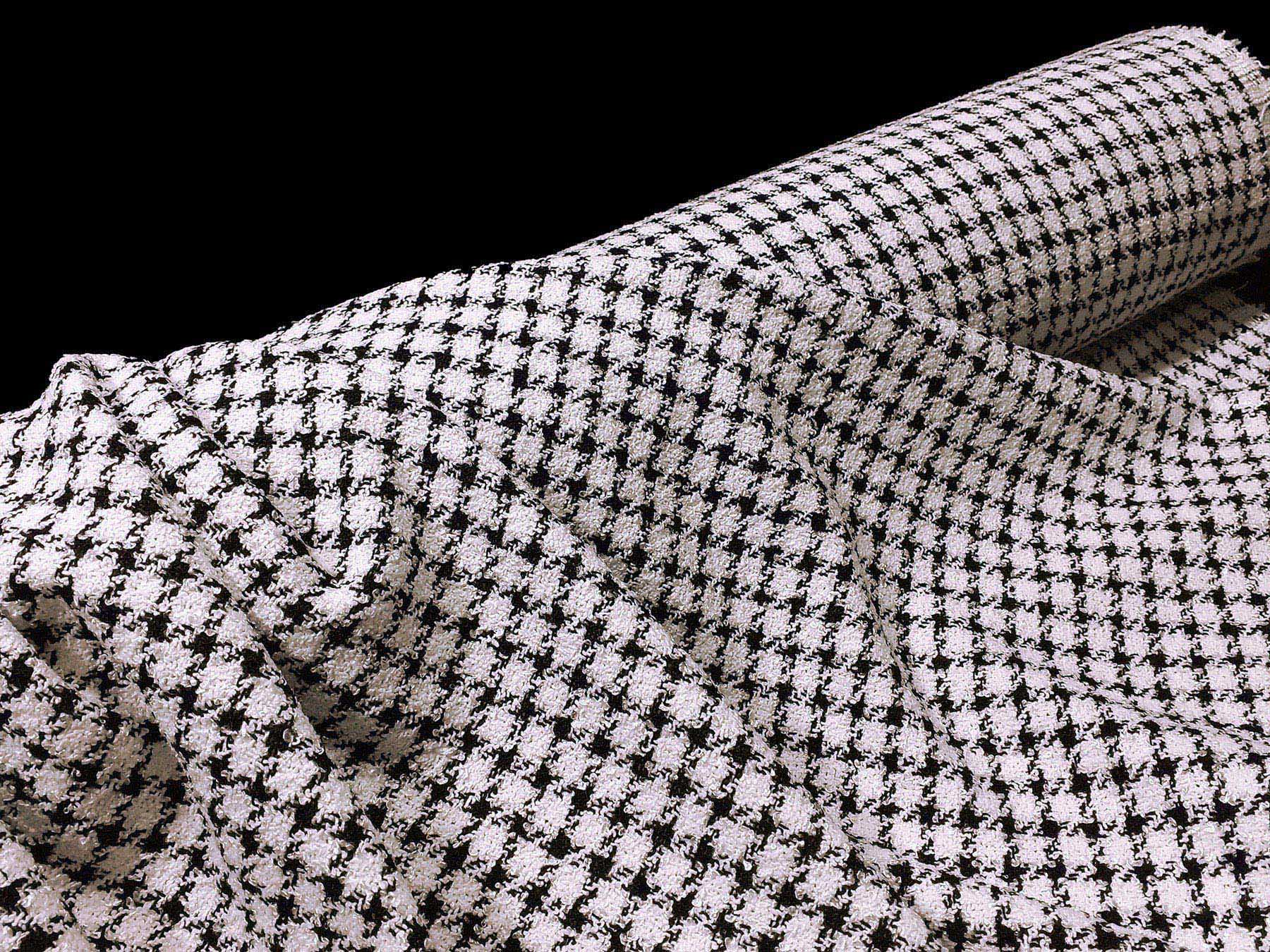 In questo tessuto Chanel, di peso medio-alto, gli effetti di filatura bouclè sono intrecciati con filati di cotone ritorto. La mano è morbida e corposa, ideale per la realizzazione di abiti e taileur eleganti.