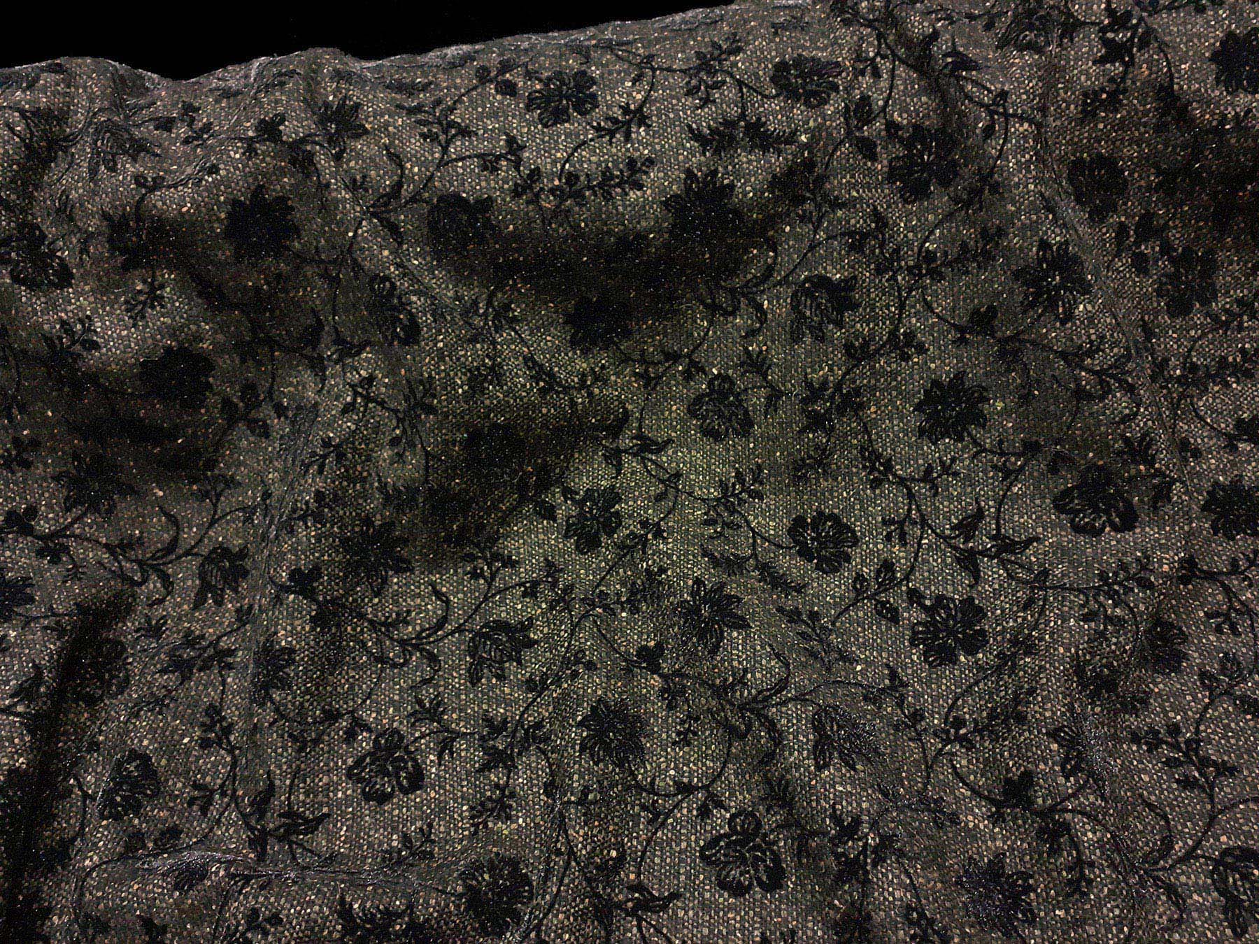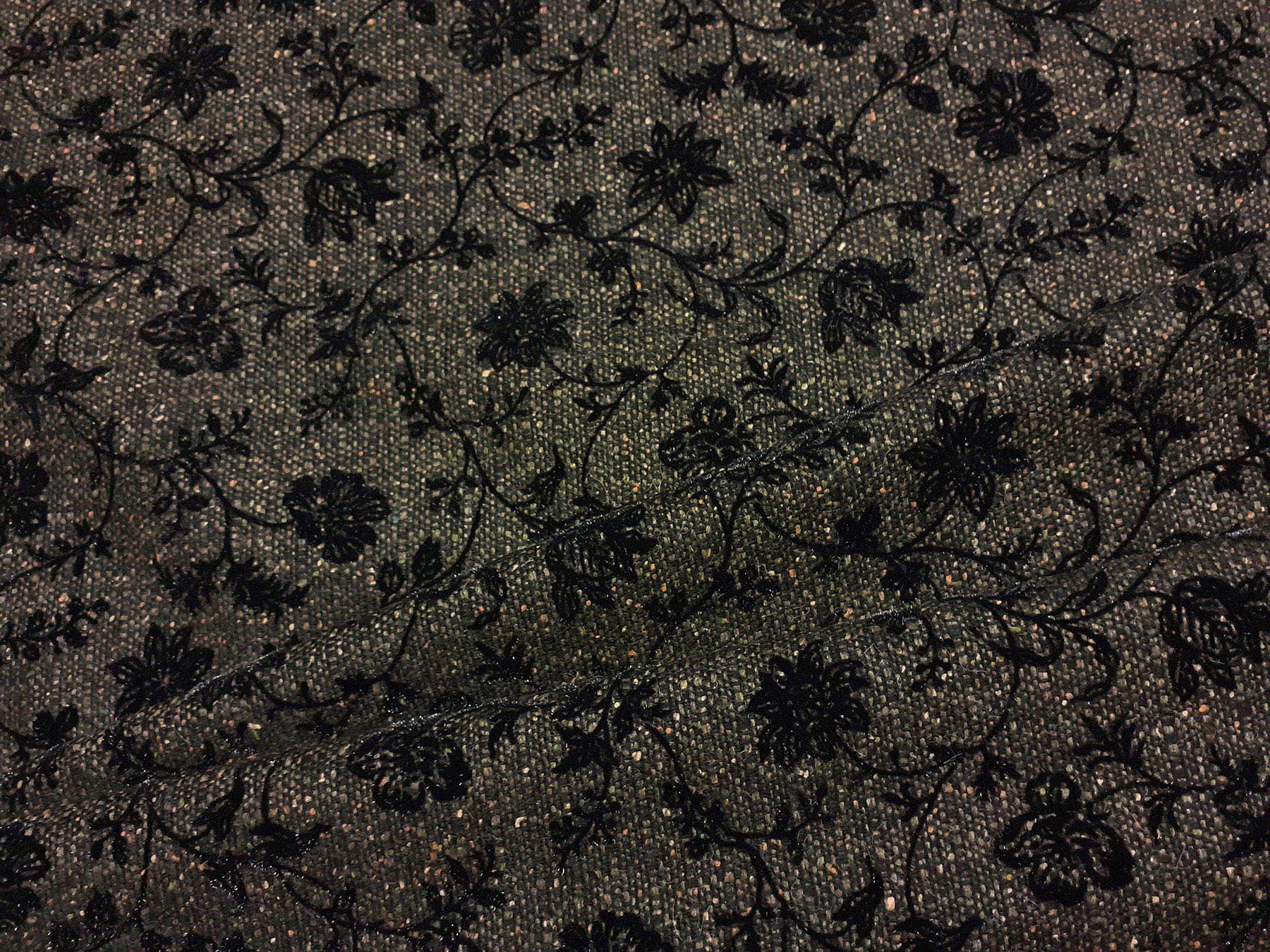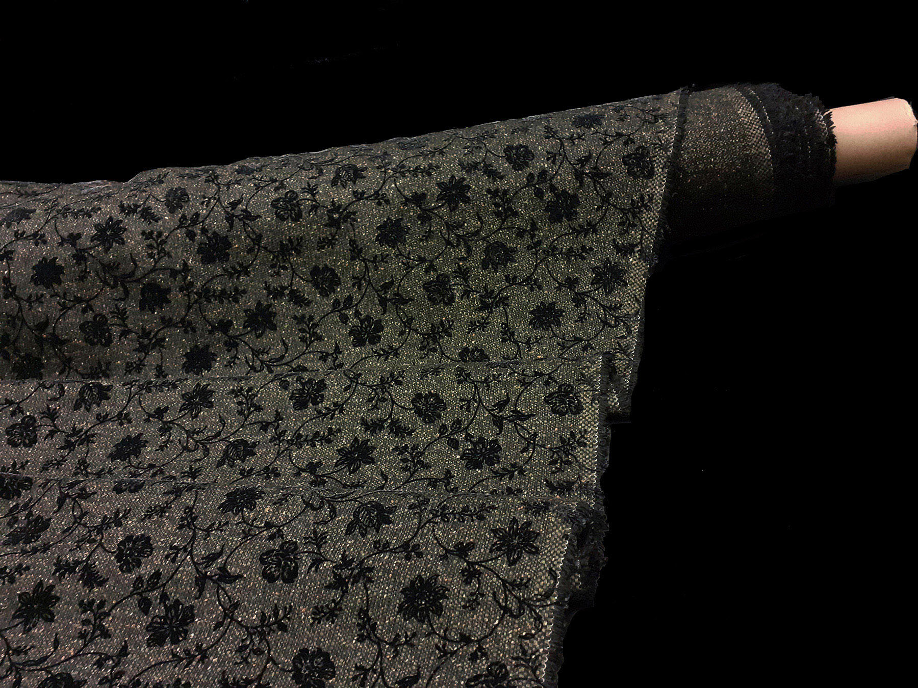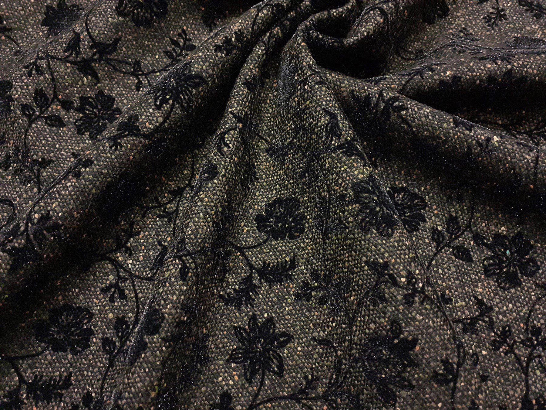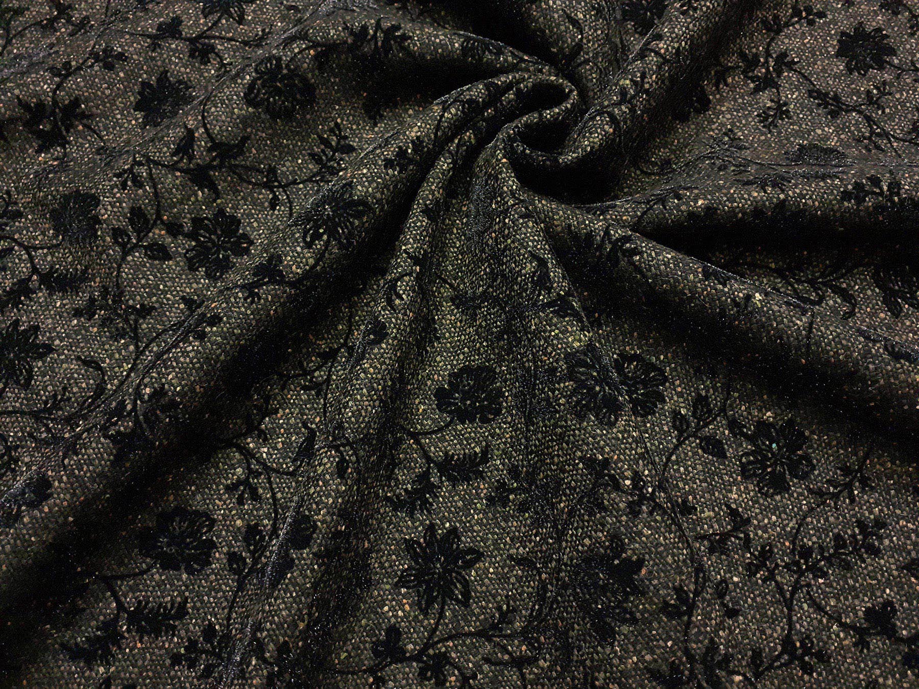 Tweed in lana verde con fiori floccati neri