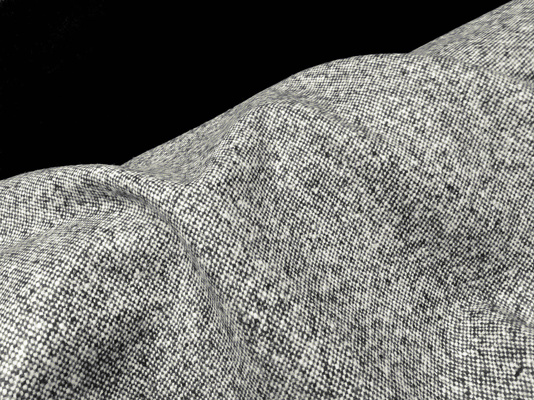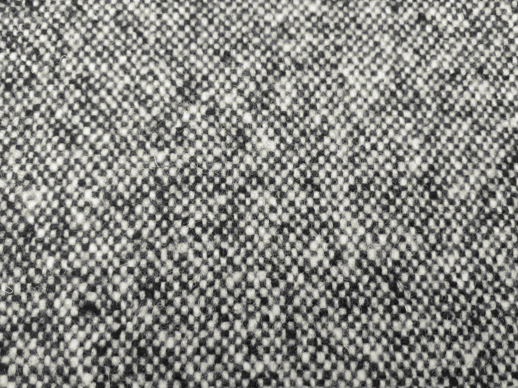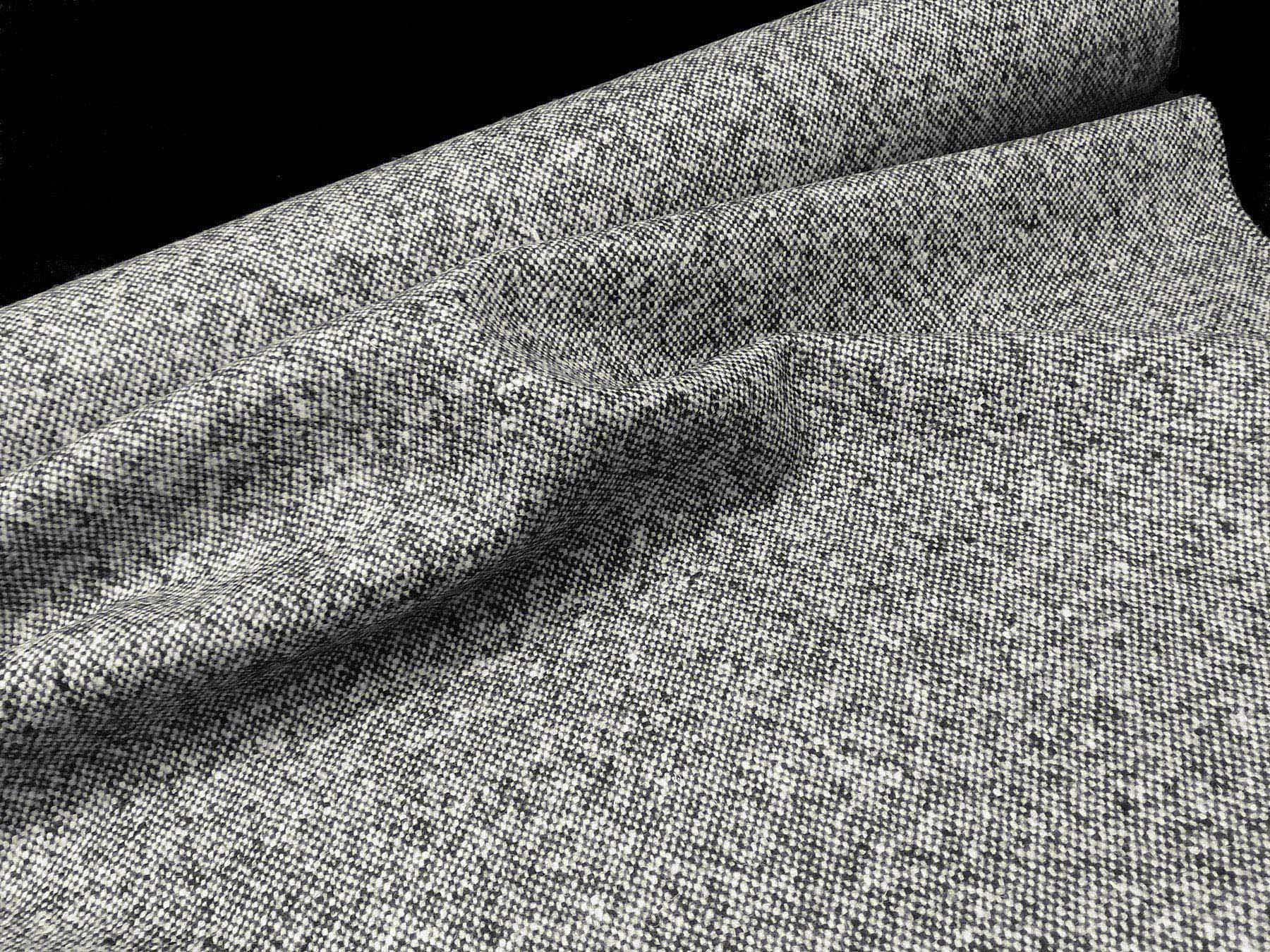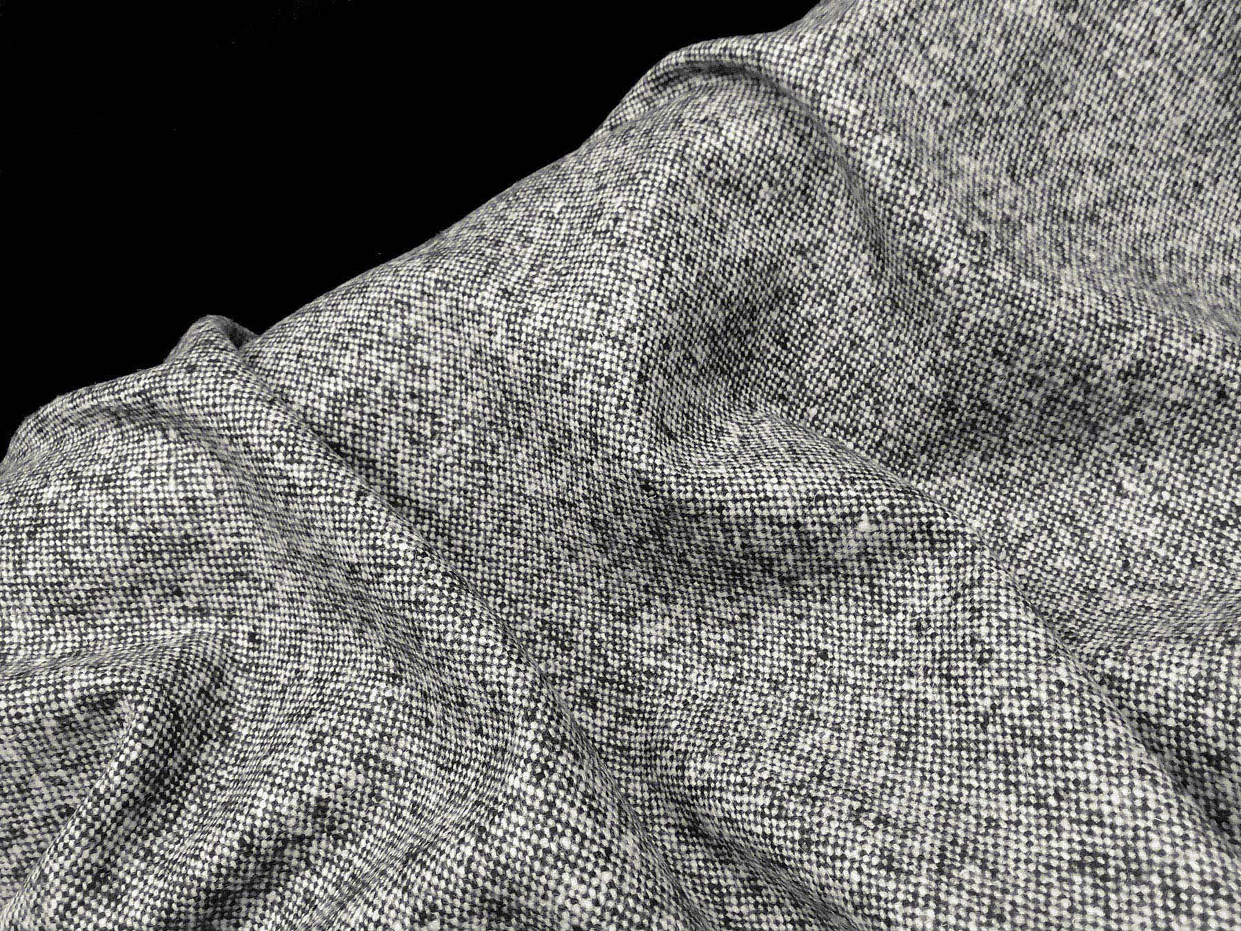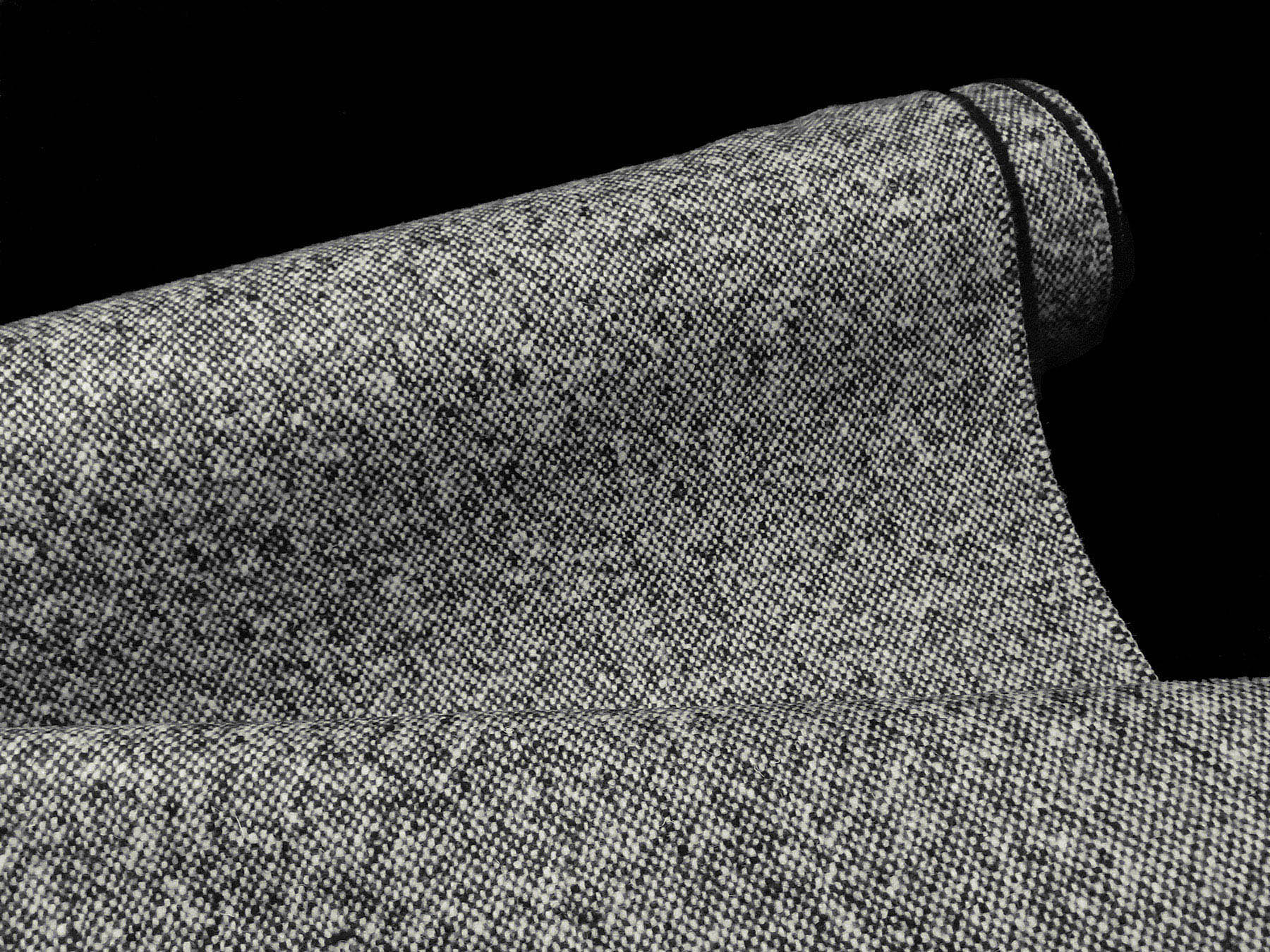 Questo tessuto, prodotto in Italia con filato di lana merino, è caratterizzato da un intreccio di fili irregolari bianchi e neri che formano il classico effetto “tweed”. Di peso elevato e viene usato come tessuto invernale per capi spalla e gonne.