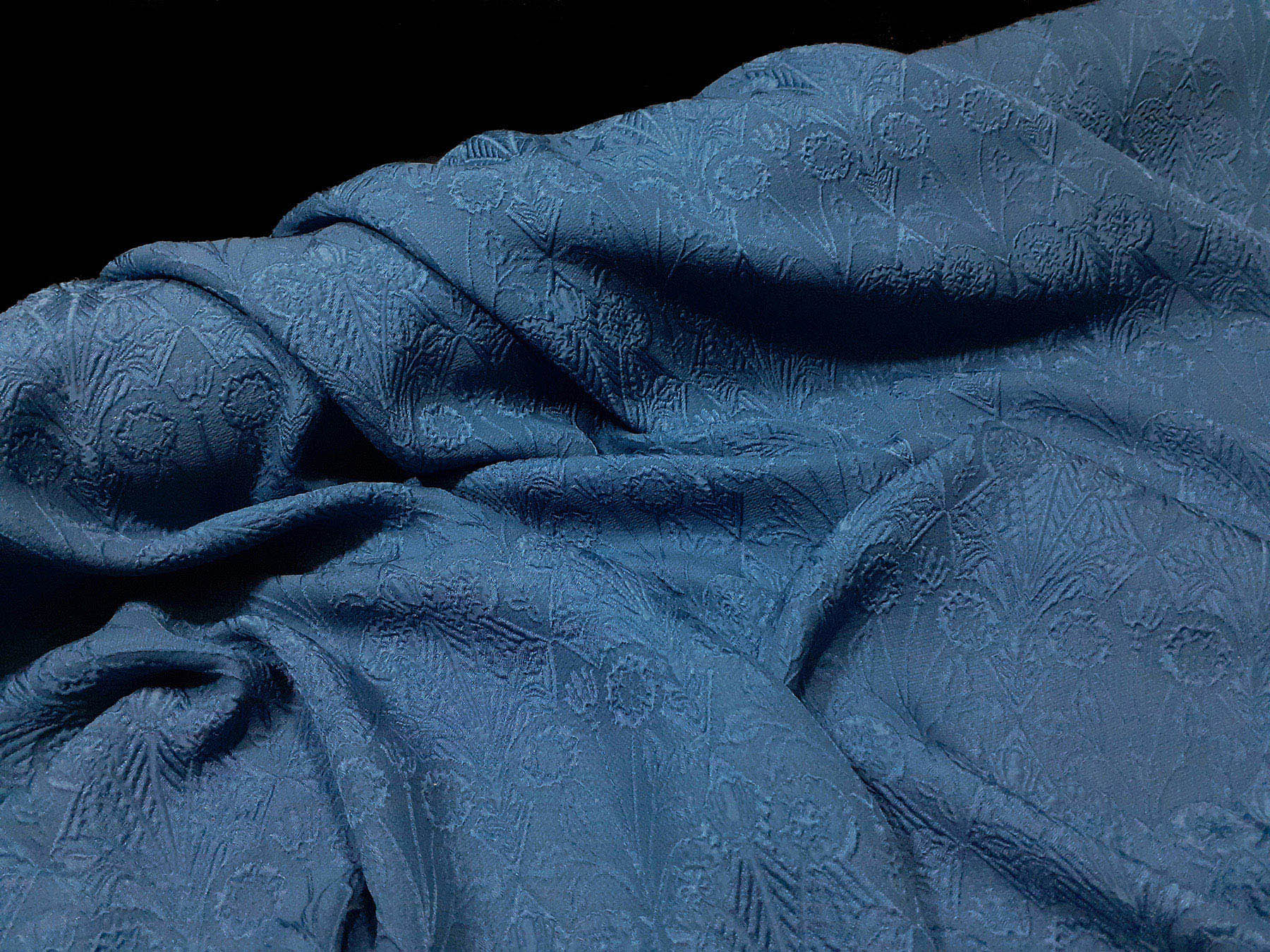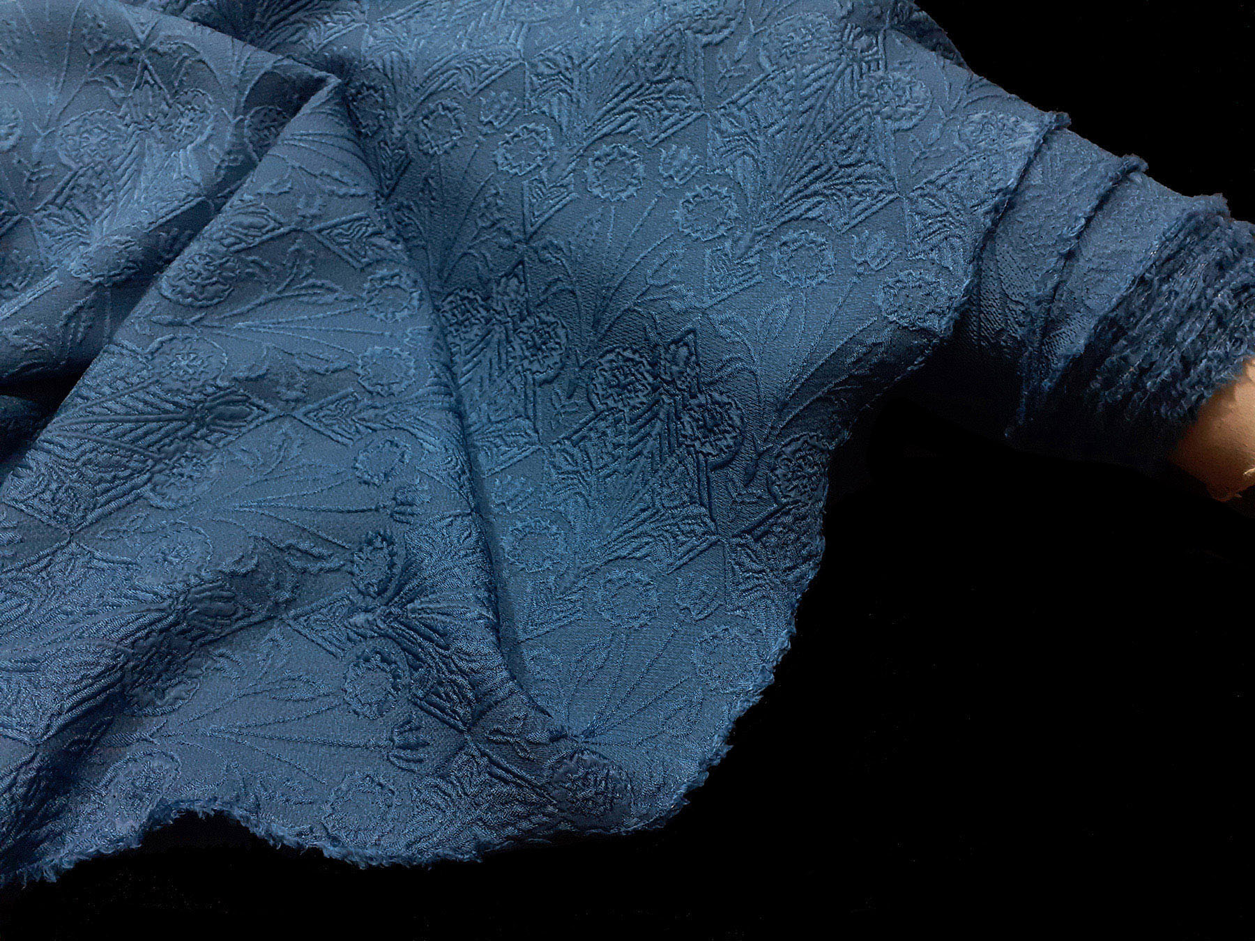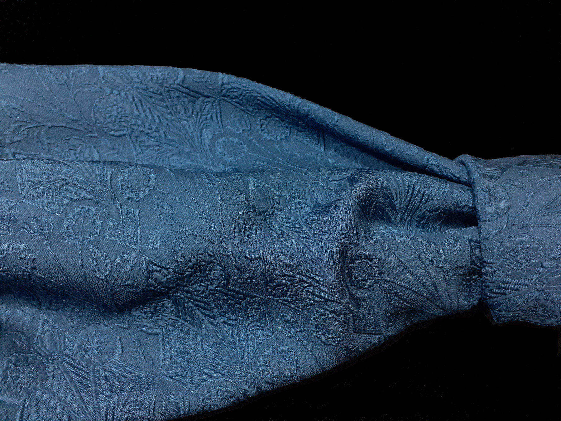 In questo tessuto di seta pura, prodotto a Como, la lavorazione jacquard con il contrasto fra lucido e opaco, crea un piacevole effetto di tridimensionalità. Perfetto per la realizzazione di abiti ampi e sinuosi, grazie alla sua morbidezza e caduta, può essere utilizzato anche per capi più lineari che mettono in evidenza la ricchezza e la particolarità di questo tipo di tessuto.