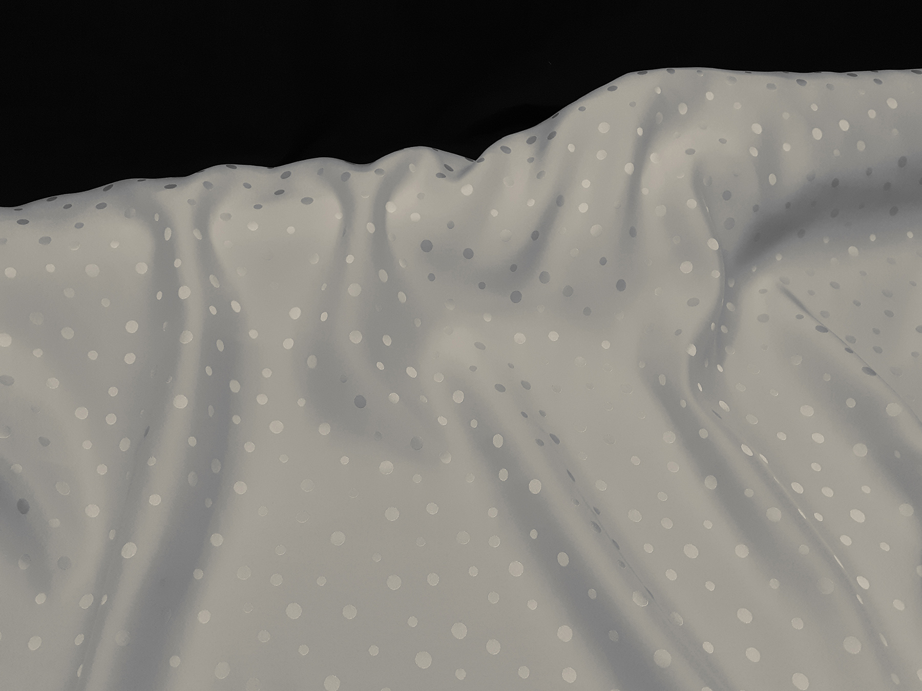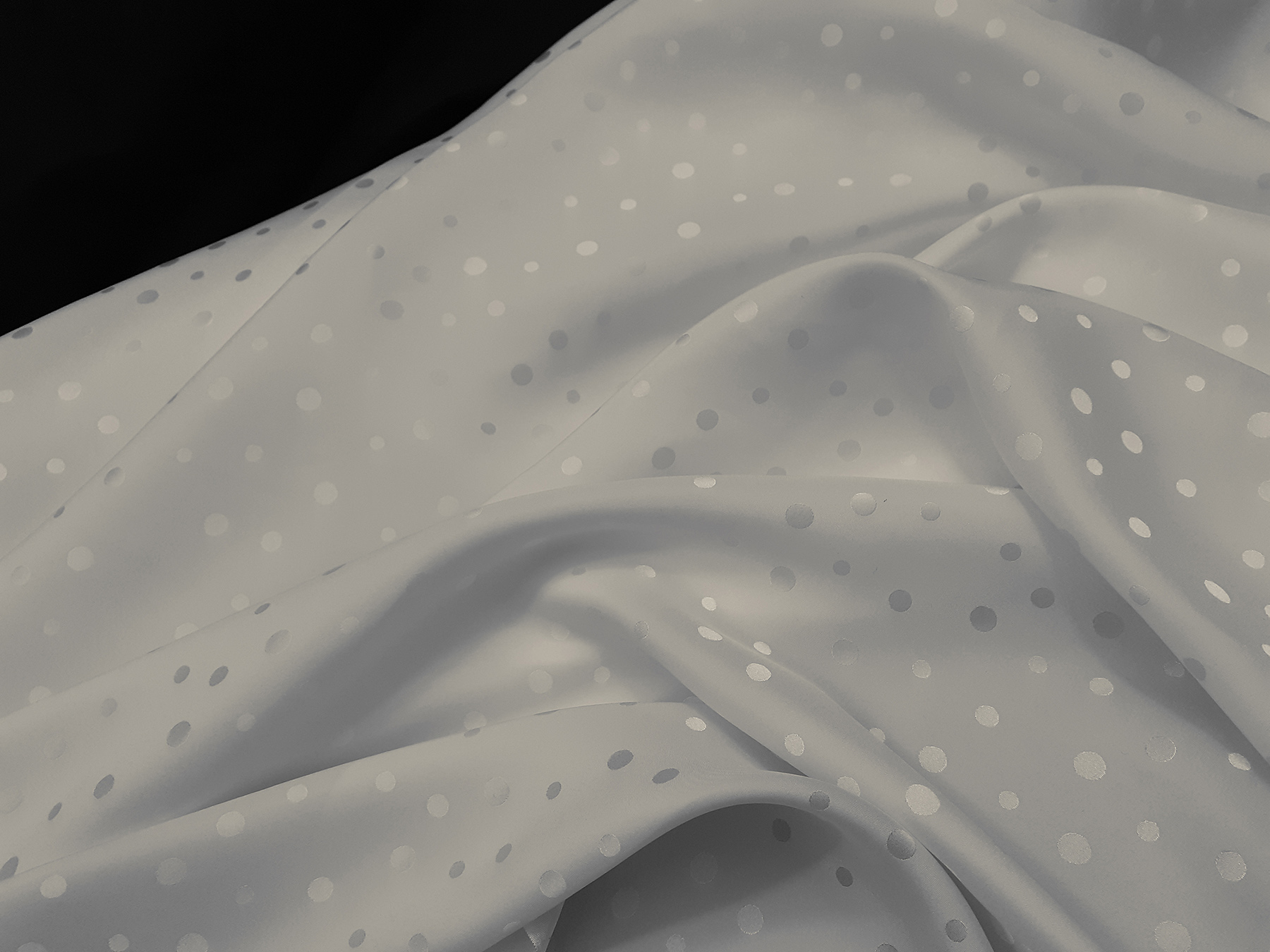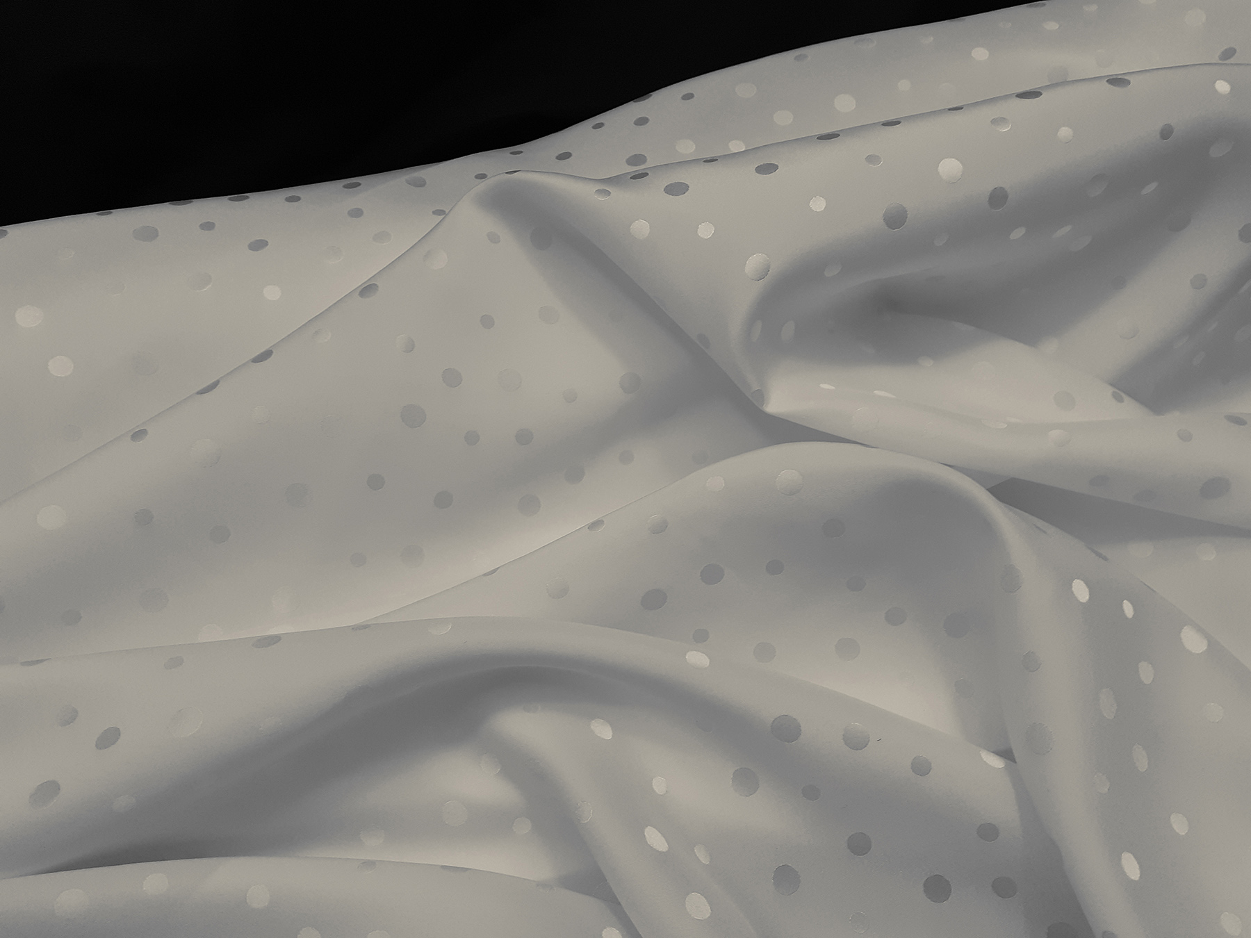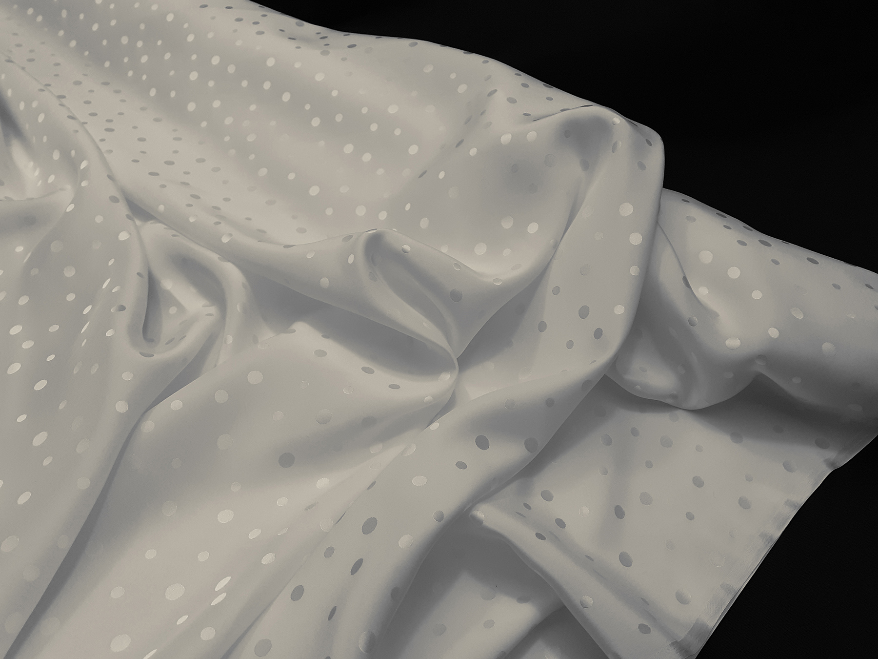 In questo tessuto di seta pura, prodotto a Como, la lavorazione jacquard con il contrasto fra lucido e opaco, crea un piacevole effetto di tridimensionalità. Perfetto per la realizzazione di abiti ampi e sinuosi, grazie alla sua morbidezza e caduta, può essere utilizzato anche per capi più lineari che mettono in evidenza la ricchezza e la particolarità di questo tipo di tessuto.