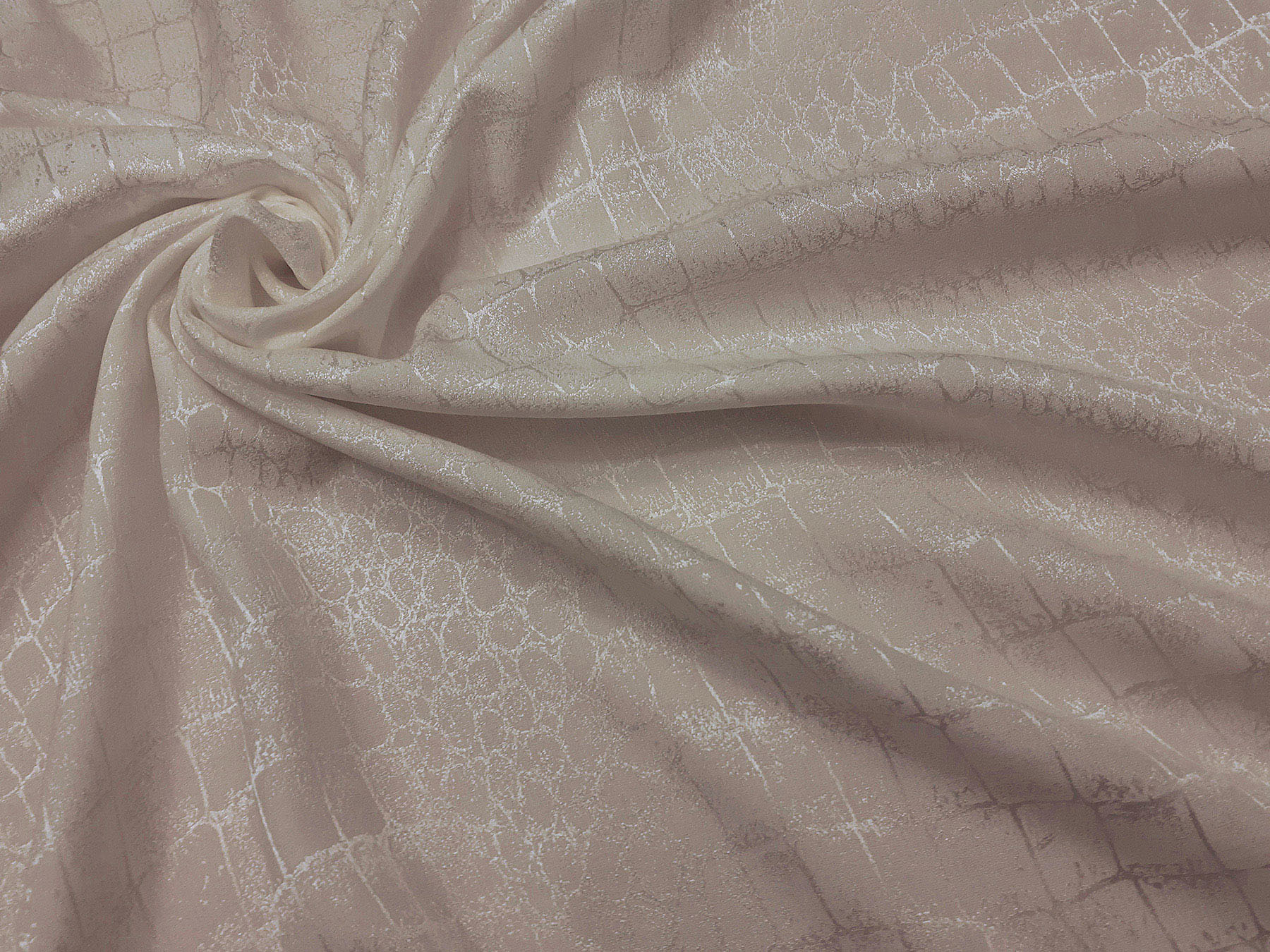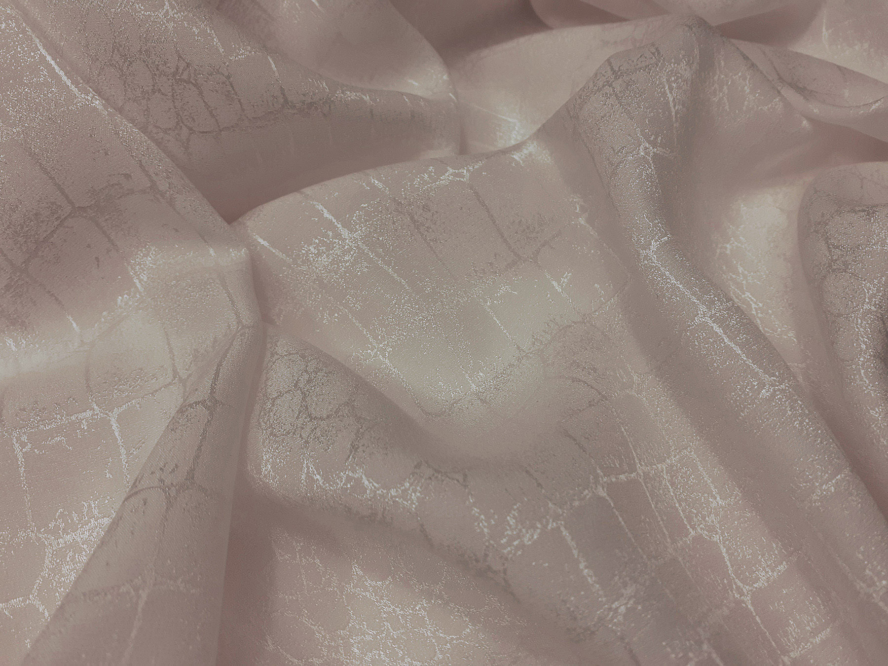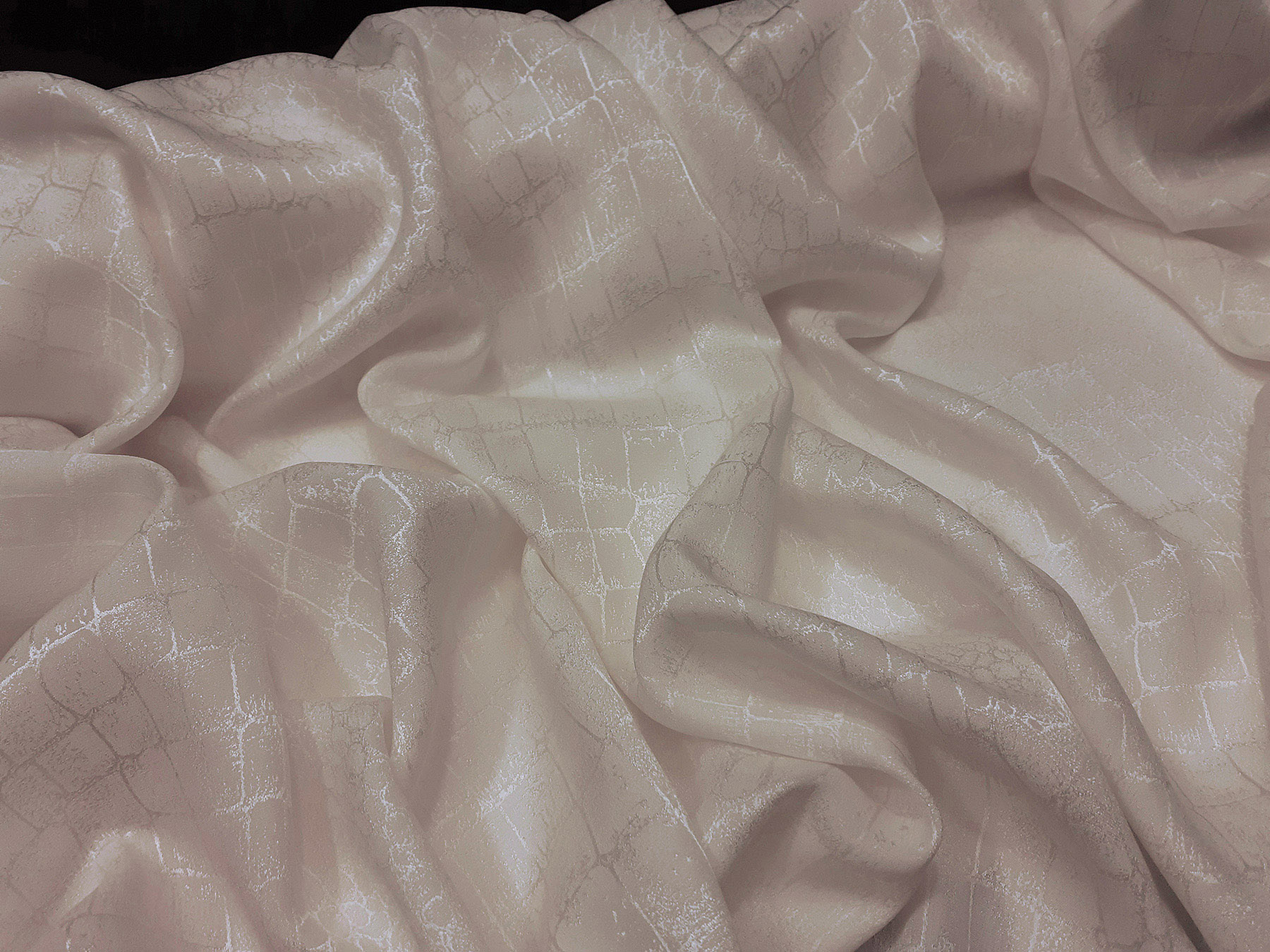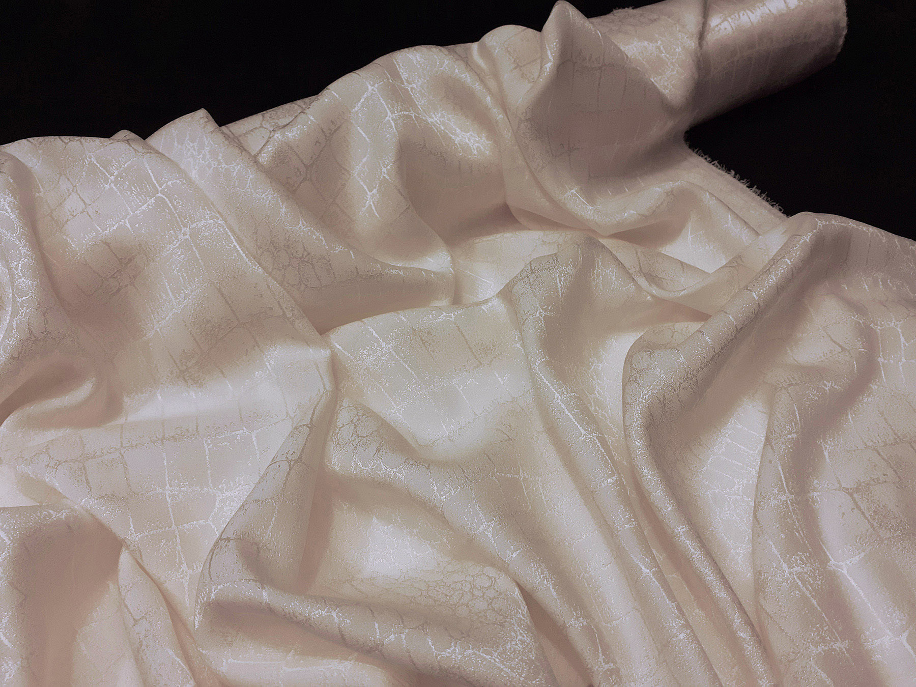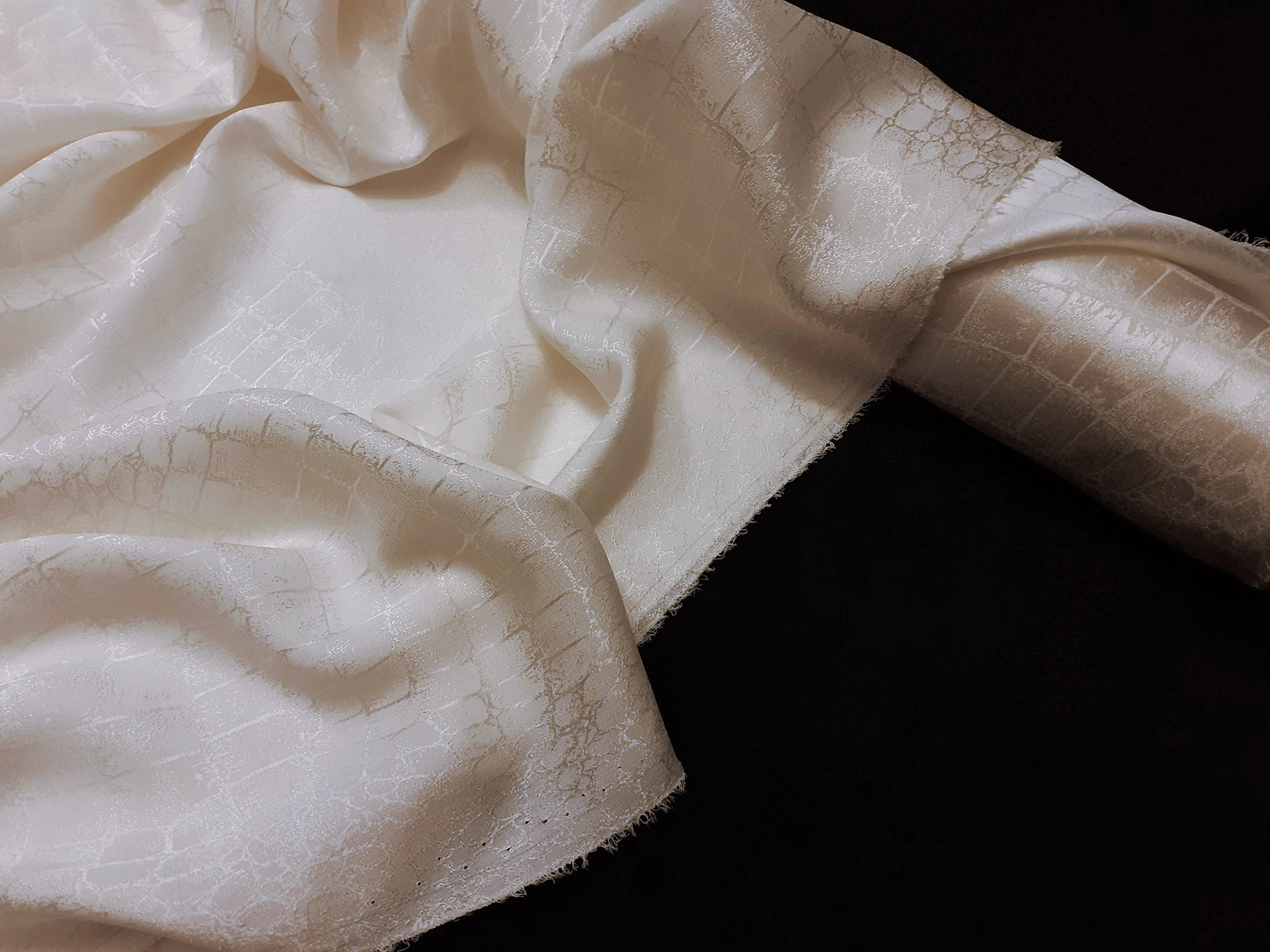 In questo tessuto di seta pura, prodotto a Como, la lavorazione jacquard con il contrasto fra lucido e opaco, crea un piacevole effetto di tridimensionalità. Perfetto per la realizzazione di abiti ampi e sinuosi, grazie alla sua morbidezza e caduta, può essere utilizzato anche per capi più lineari che mettono in evidenza la ricchezza e la particolarità di questo tipo di tessuto.