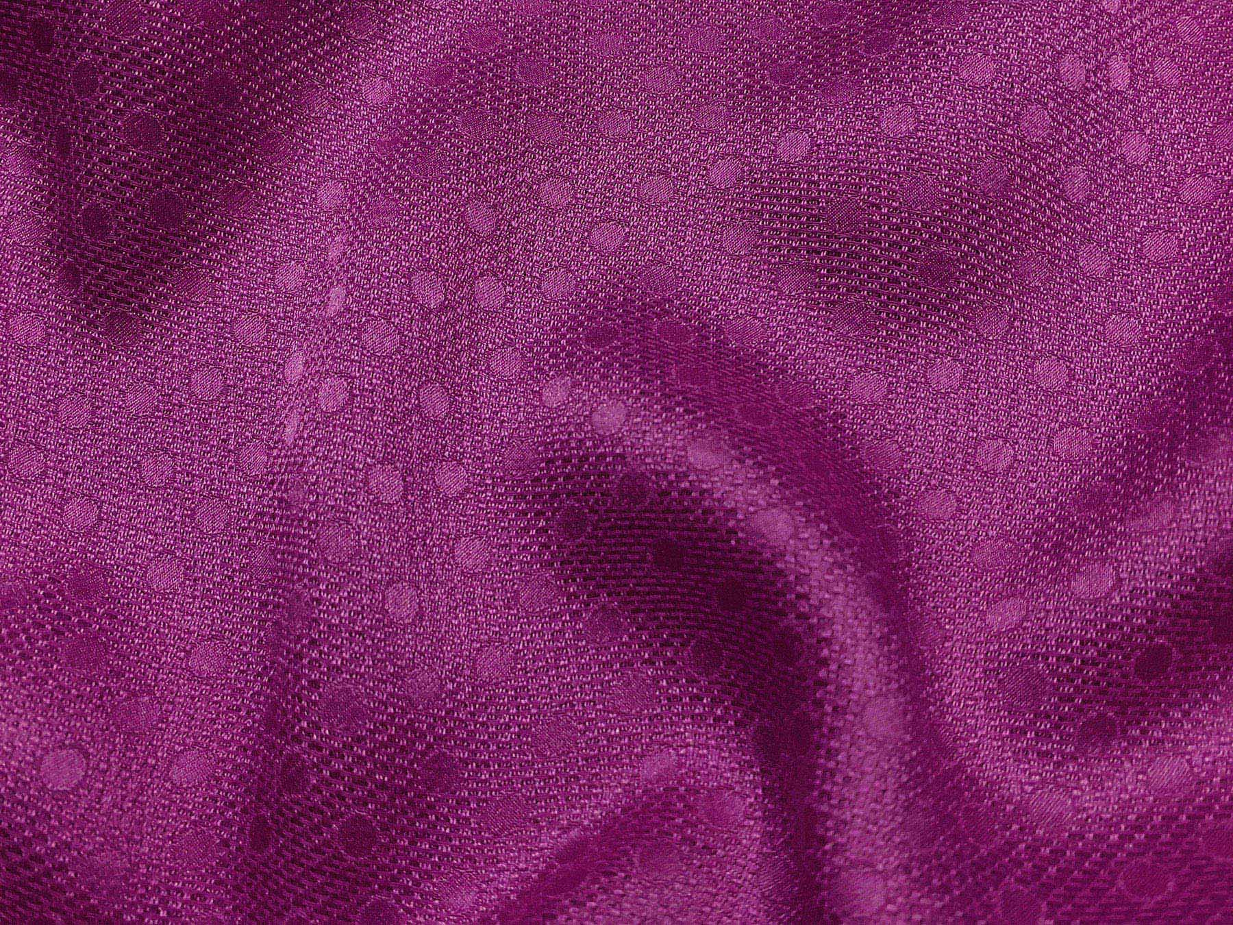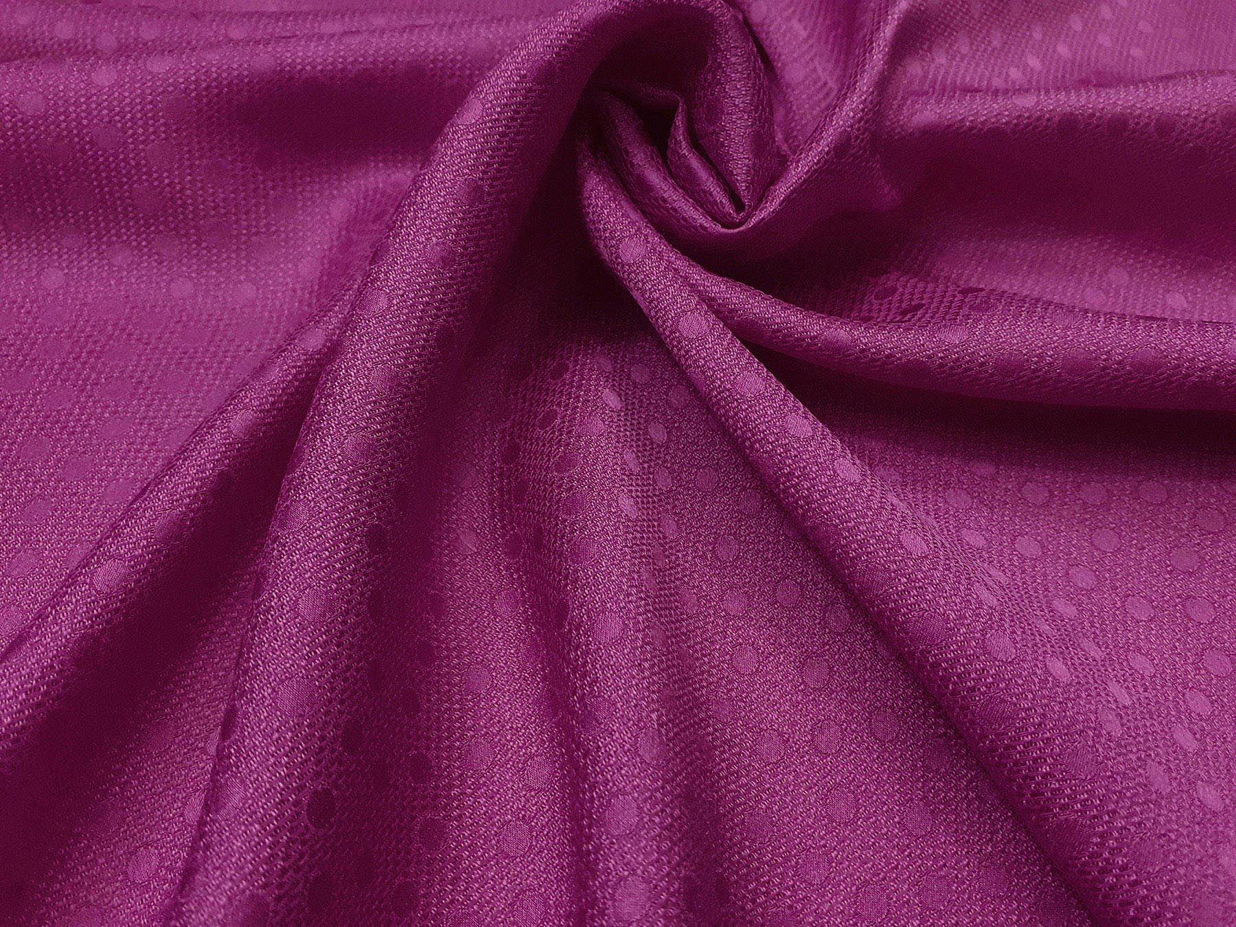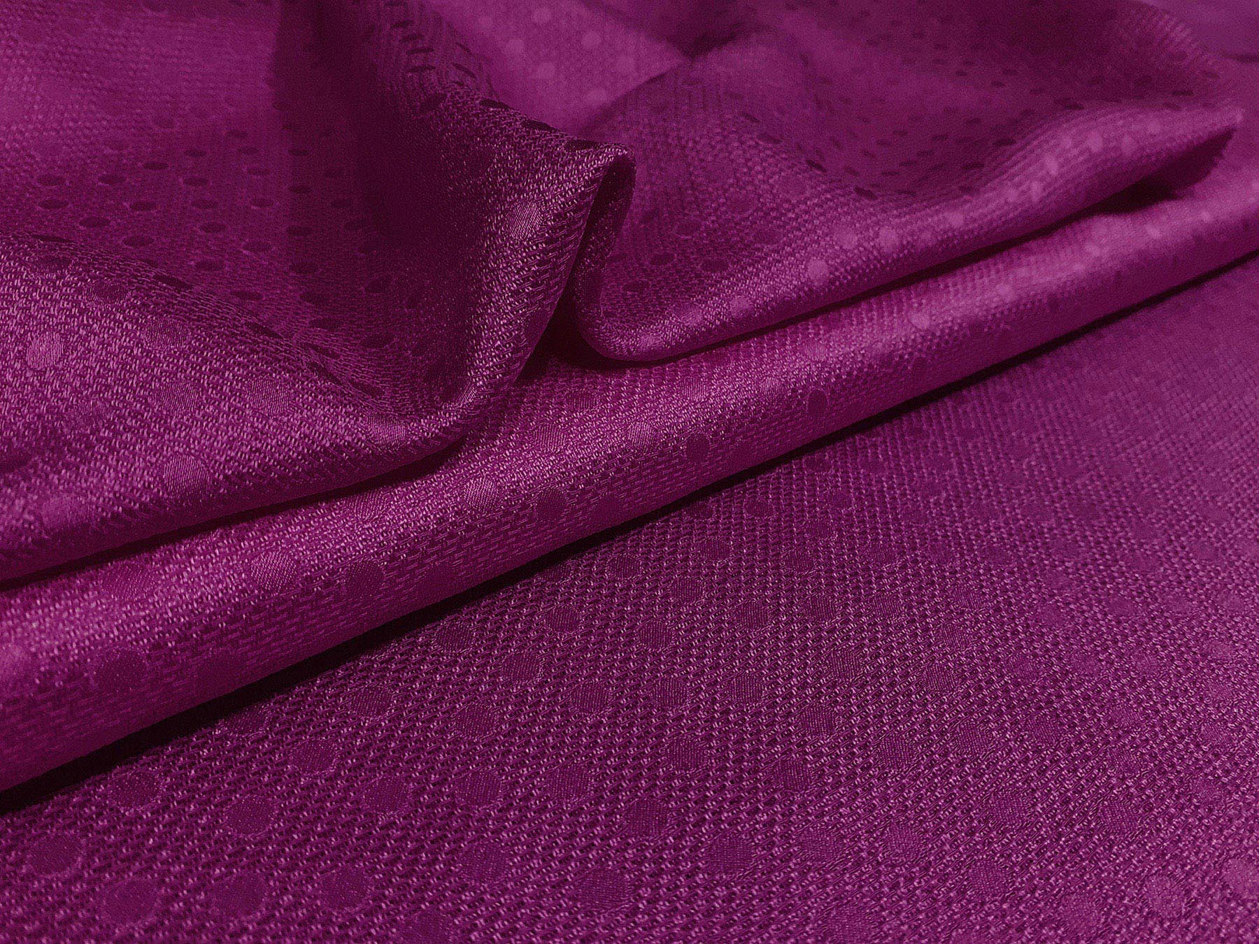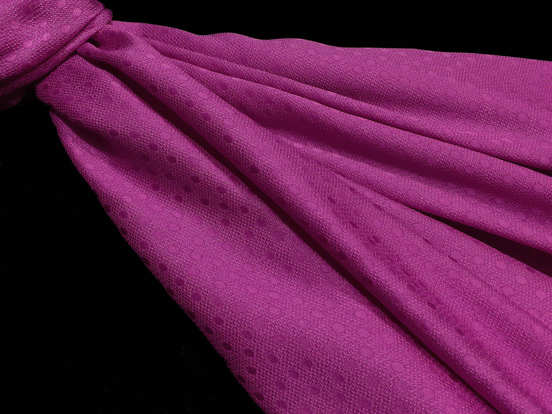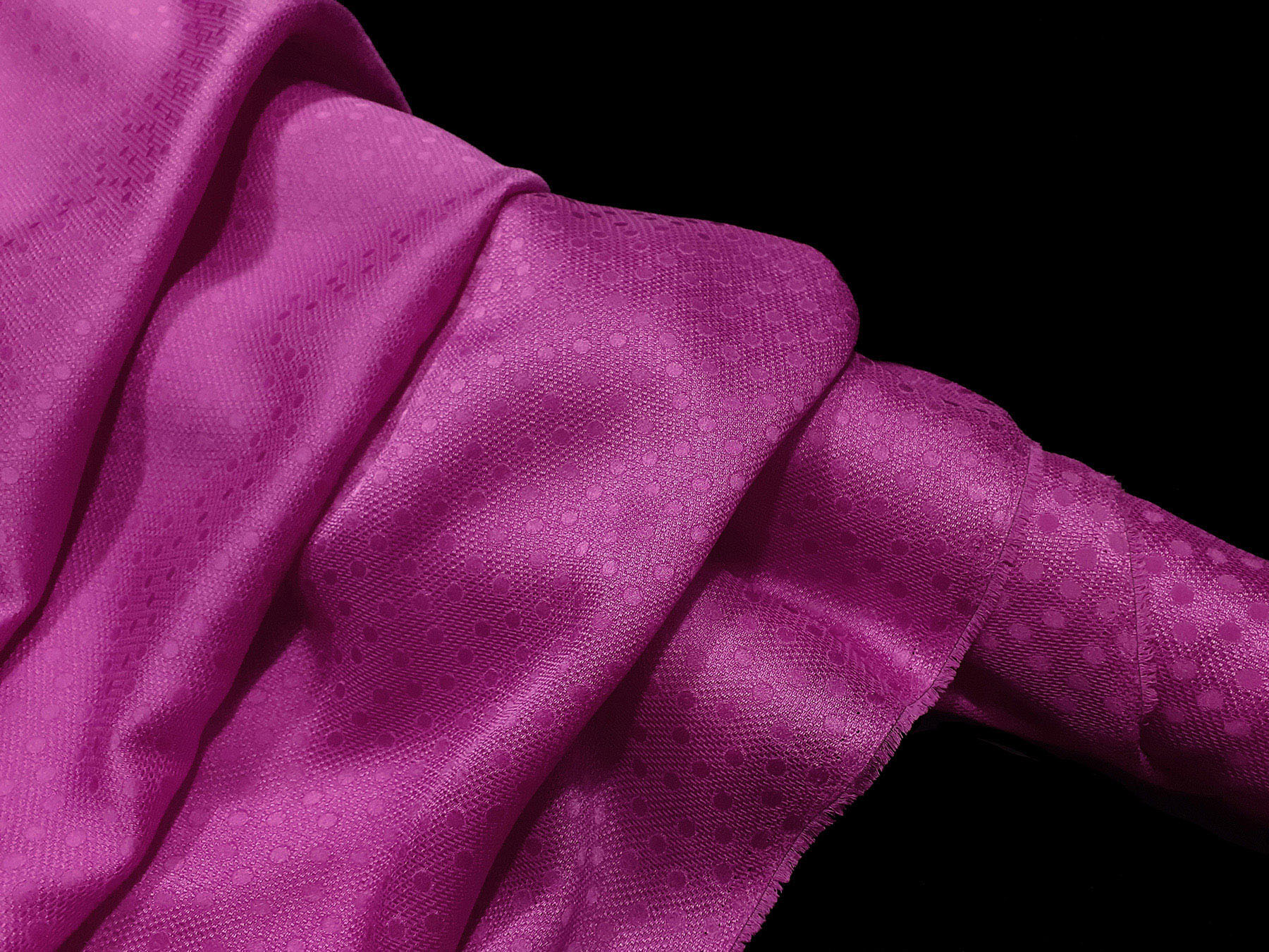 In questo tessuto di seta pura, prodotto a Como, la lavorazione jacquard con il contrasto fra lucido e opaco, crea un piacevole effetto di tridimensionalità. Perfetto per la realizzazione di abiti ampi e sinuosi, grazie alla sua morbidezza e caduta, può essere utilizzato anche per capi più lineari che mettono in evidenza la ricchezza e la particolarità di questo tipo di tessuto.