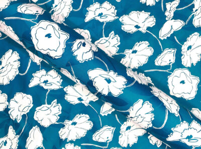 Raso in cotone jacquard fantasia floreale su fondo turcheseQuesto tessuto in raso di cotone di peso medio alto è caratterizzato da una mano morbida, una lucentezza elegante e una buona caduta. Perfetto per la realizzazione di abiti diritti ma anche capi spalla.