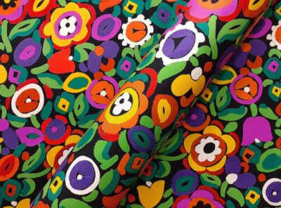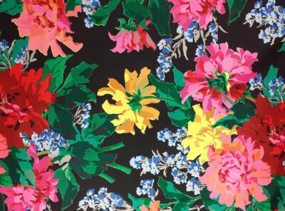 Raso in cotone fantasia floreale fondo neroQuesto tessuto in raso di cotone piuttosto pesante è caratterizzato da una mano morbida e lucentezza elegante. Perfetto per la realizzazione di abiti diritti e capi spalla.