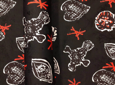 Gabardine in cotone satinato fantasia astratta fondo neroRealizzato con un filato di cotone pettinato di peso mediopesante, questo tessuto di gabardine satinato ha mano asciutta, compatta e resistente. Viene utilizzato per la realizzazione di abiti dalle linee pulite e semplici, gonne diritte e capi spalla.