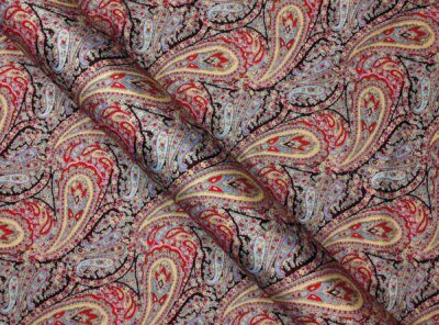 Raso in cotone disegno cashmereQuesto tessuto in raso di cotone di peso medio alto è caratterizzato da una mano morbida, una lucentezza elegante e una buona caduta. Perfetto per la realizzazione di abiti diritti ma anche capi spalla.