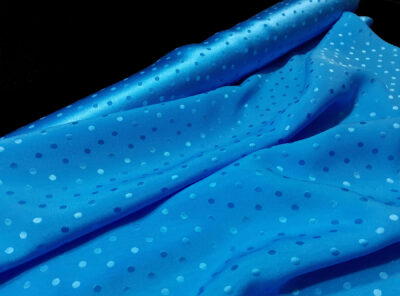 Crepe de Chine in seta tinta azzurro intensoLa Crepe de Chine in pura seta, prodotta a Como, è un tessuto semi-opaco che si ottiene da una trama opaca che contrasta la lucentezza dell’ordito. Caratterizzata da mano leggera e morbida viene utilizzata per realizzare camicie, top, abiti e gonne morbide, pantaloni eleganti, lingerie etc.
