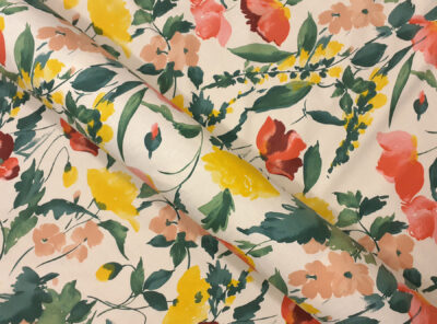 Tela in cotone fantasia floreale fondo avorioTessuto stampato su un fondo in puro cotone non trattato e non sbiancato di medio peso. Sono presenti piccole irregolarità caratteristiche di questo tipo di lavorazione. Ha mano asciutta, compatta e resistente. Viene utilizzato per la realizzazione di abiti femminili dalle linee semplici, gonne e capi spalla.